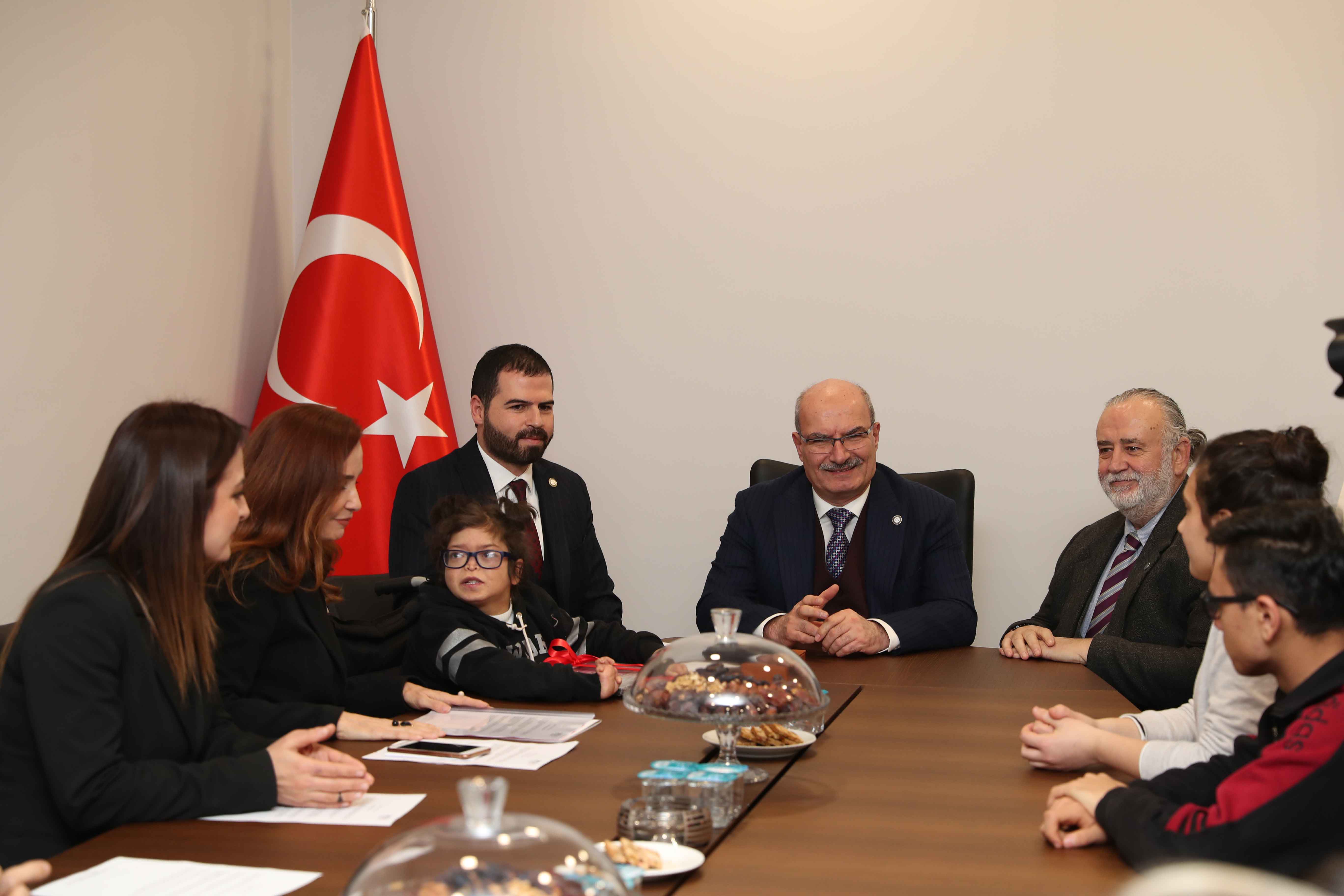 16 ŞUBAT 2019-SERÇEV Engelsiz Meslek Lisesi 10. sınıf öğrencisi serebral palsili çocuklar, SERÇEV Engelsiz Meslek Lisesi Müdürü Dilek Saran, Serebral Palsili Çocuklar Derneği (SERÇEV) Yönetim Kurulu Başkanı Süheyla Gürkan ve Dernek Yönetim Kurulu üyeleriyle ile birlikte ATO Yönetim Kurulu Başkanı Gürsel Baran'ı ziyaret etti.