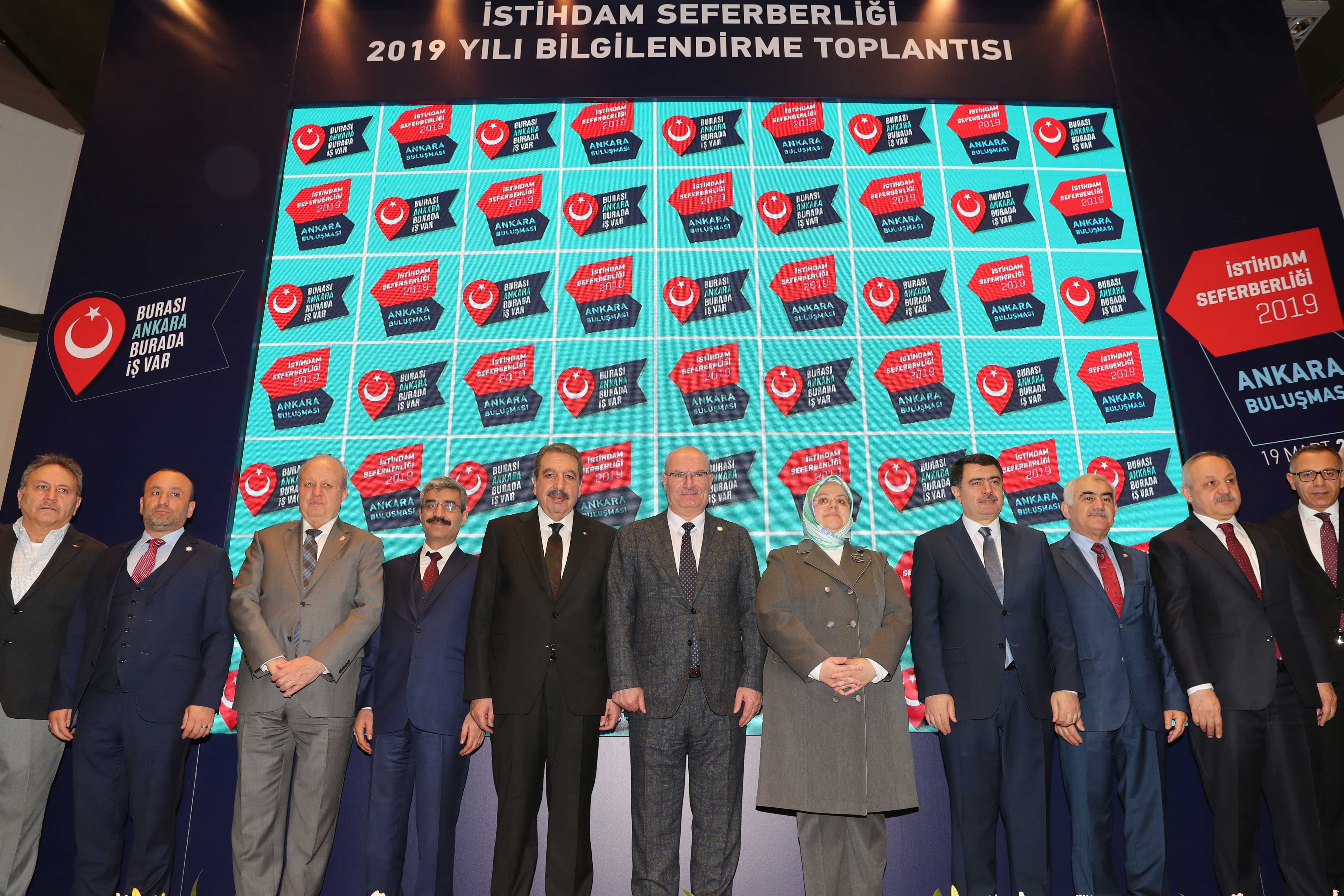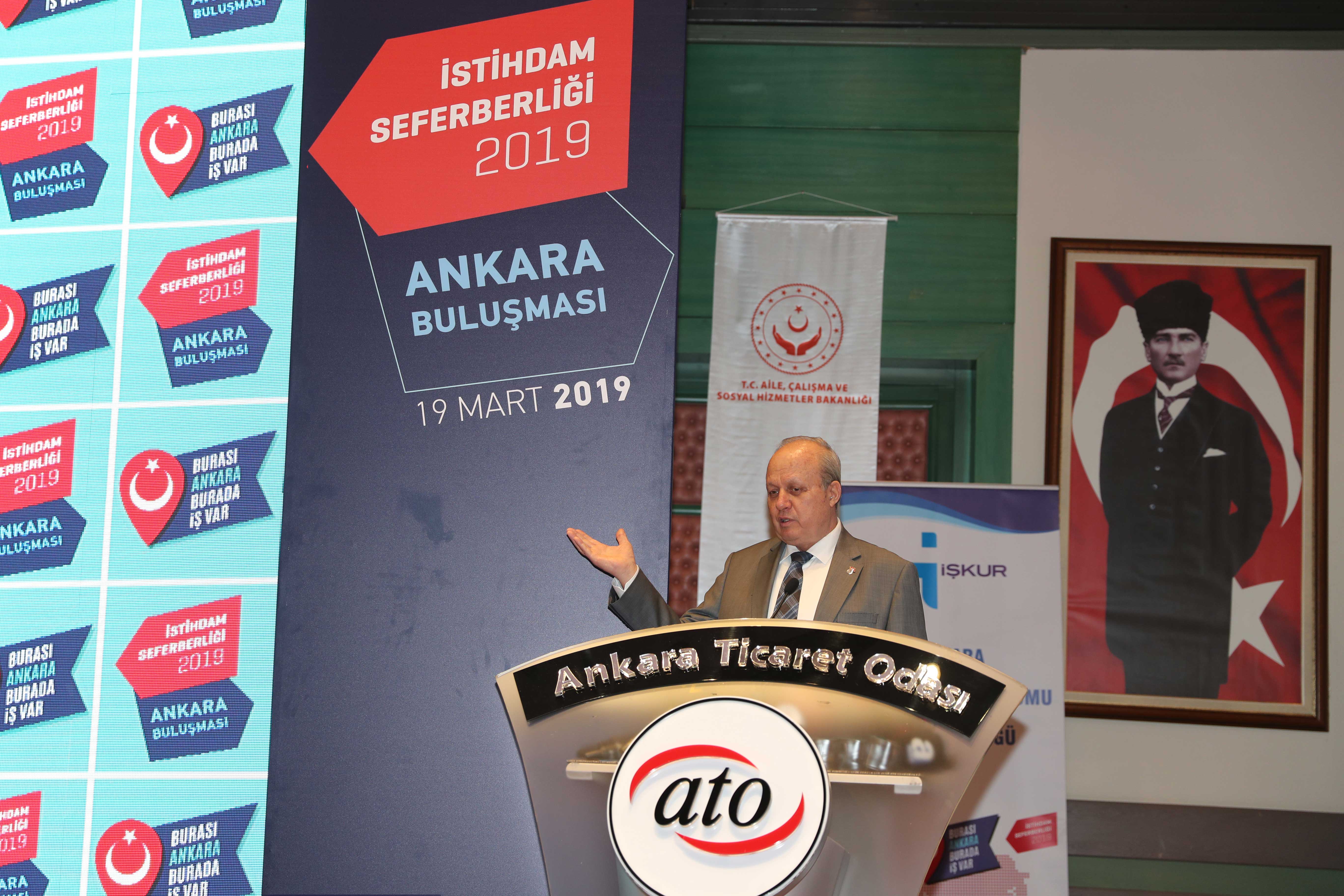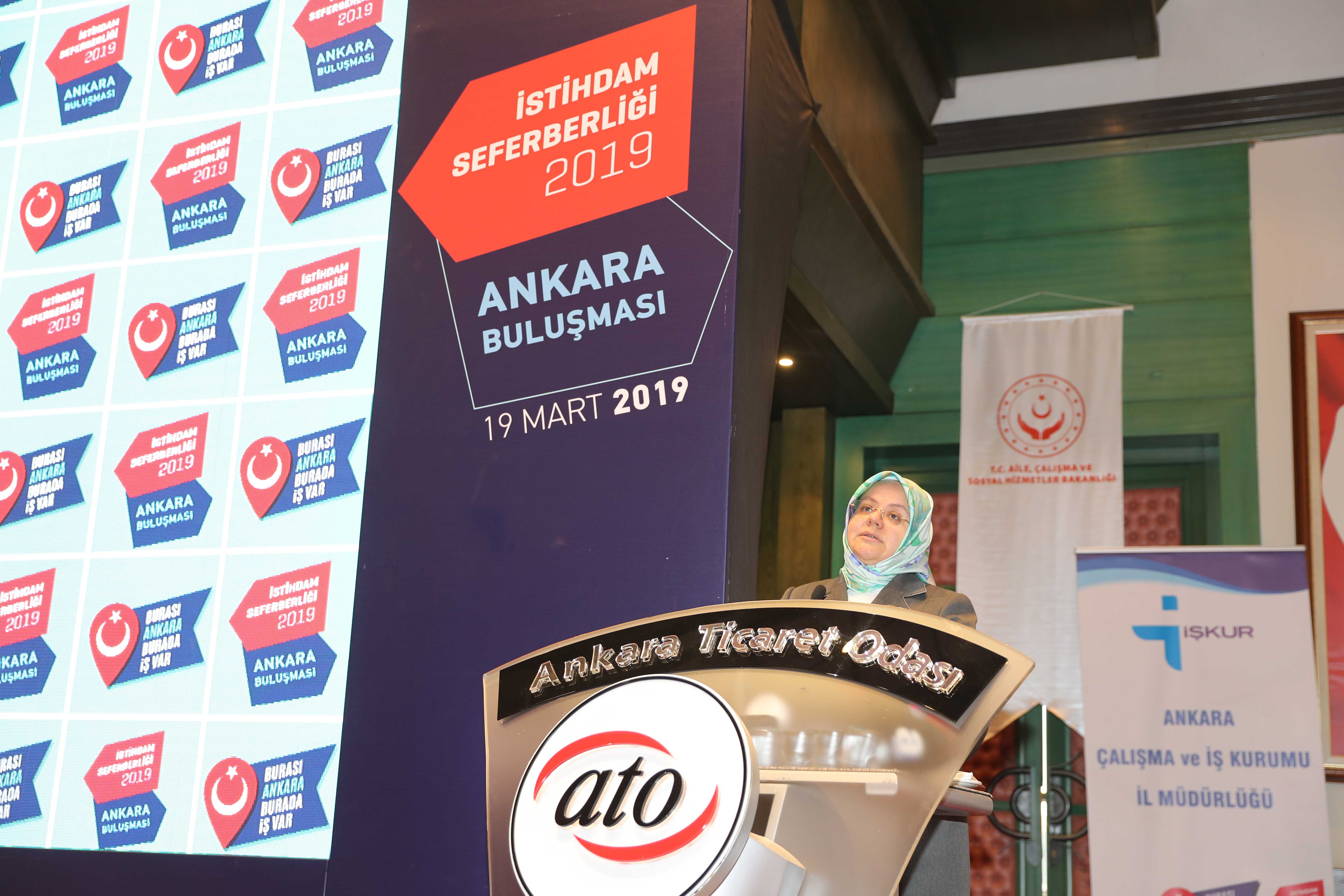 19 MART 2019-Cumhurbaşkanı Recep Tayyip Erdoğan'ın himayelerinde Aile, Çalışma ve Sosyal Hizmetler Bakanlığı ve Türkiye Odalar ve Borsalar Birliği (TOBB) işbirliğinde başlatılan "İstihdam Seferberliği 2019" bilgilendirme toplantısı Ankara Valiliği ve Ankara Ticaret Odası'nın (ATO) ev sahipliğinde Aile, Çalışma ve Sosyal Hizmetler Bakanı Zehra Zümrüt Selçuk'un katılımıyla yapıldı.