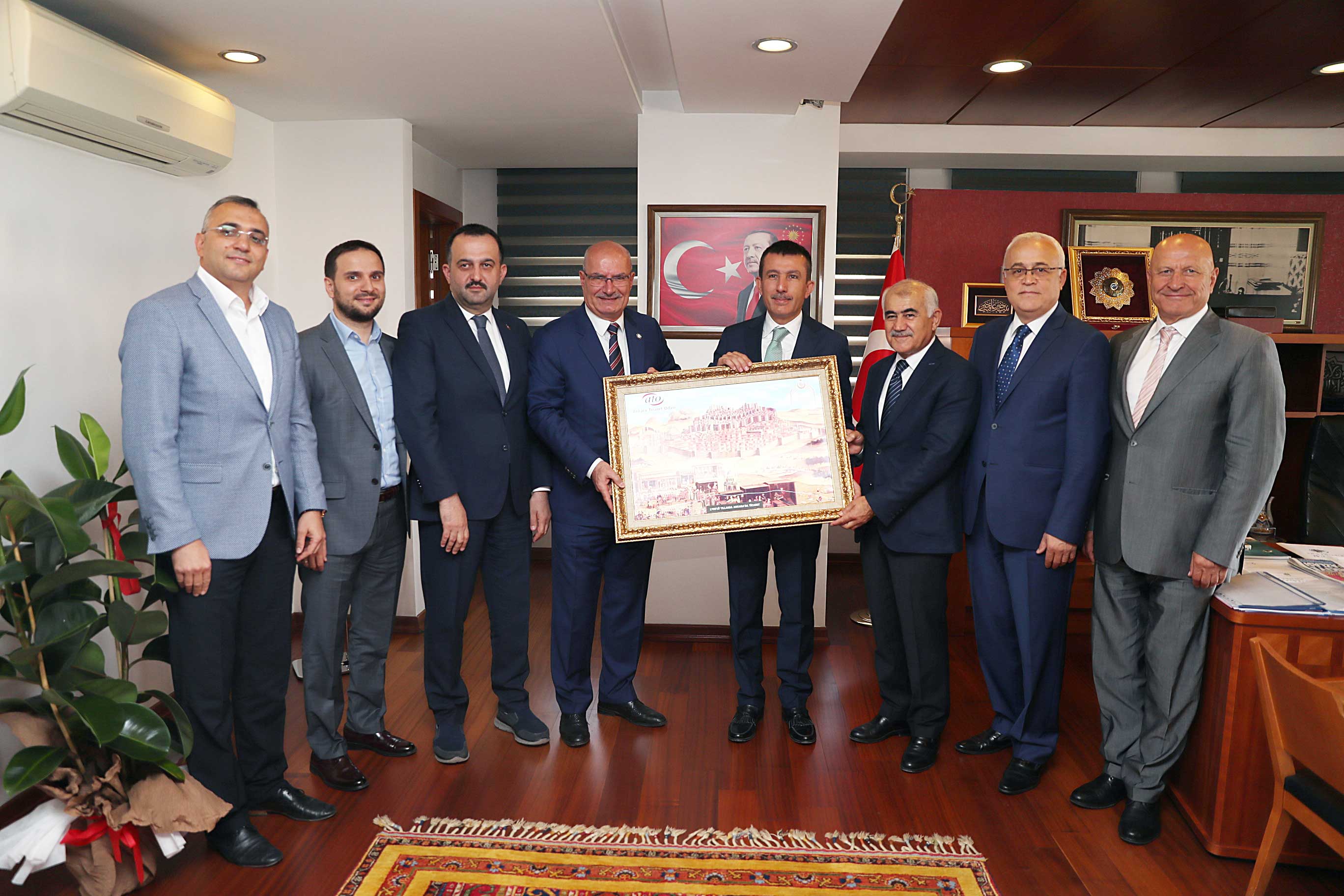 ATO Başkanı Baran'a ziyareti sırasında ATO Meclis Başkanı Mustafa Deryal, ATO Başkan Yardımcısı Halil İbrahim Yılmaz, ATO Meclis Başkan Yardımcısı Vecdet Fehmi Şendil, ATO Yönetim Kurulu Üyeleri Adem Ali Yılmaz ve Nuh Acar eşlik etti.