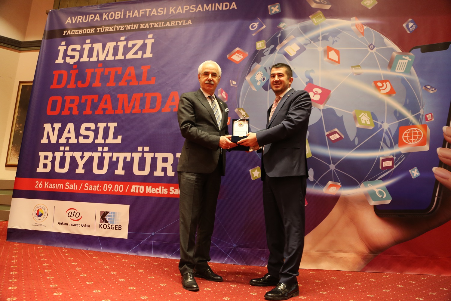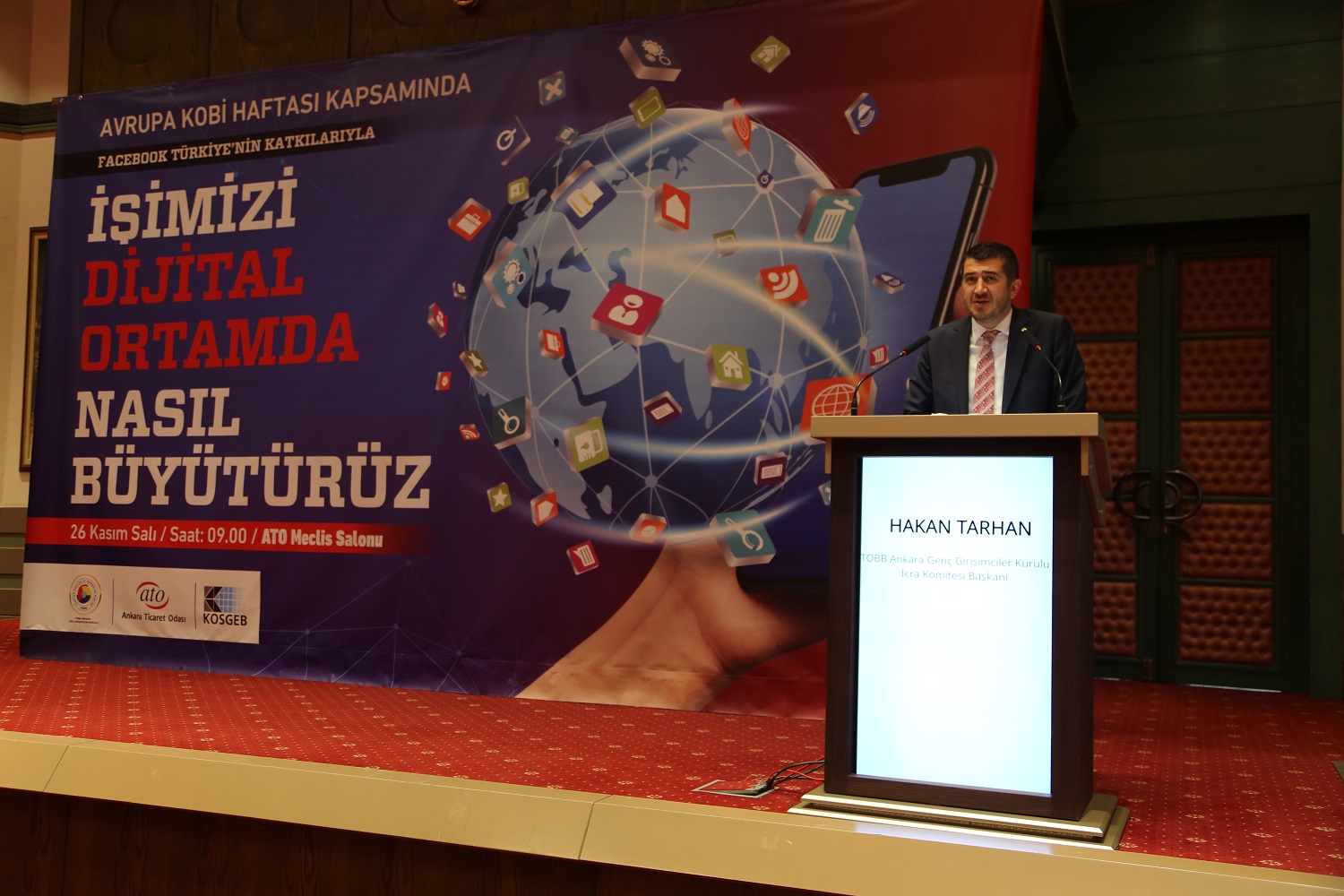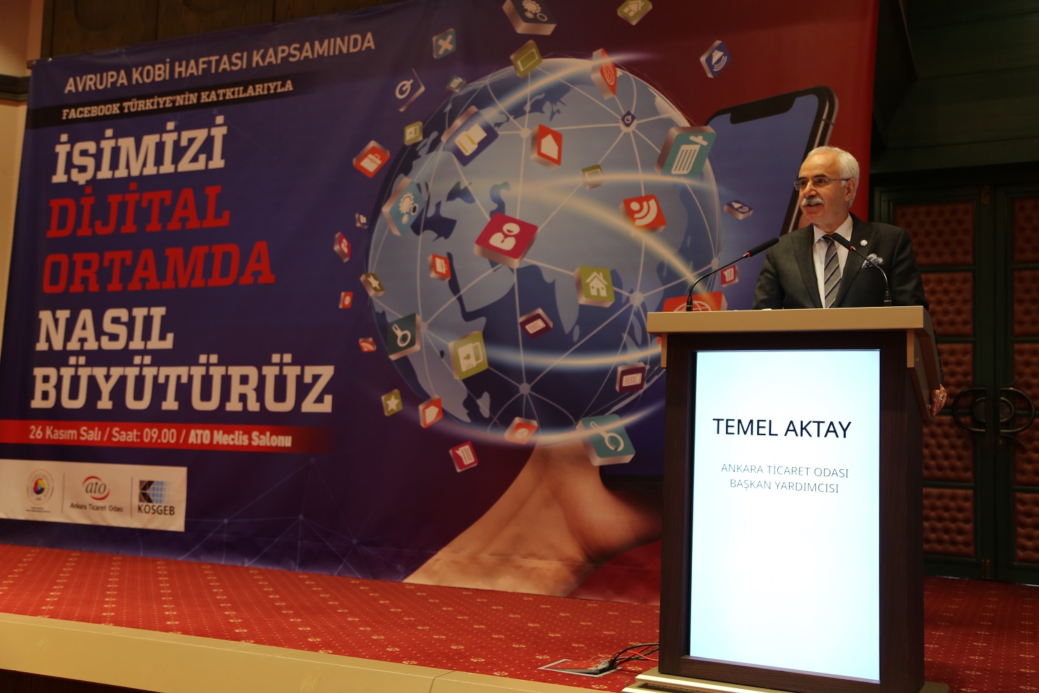 26 KASIM 2019 - Ankara Ticaret Odası (ATO), 23-29 Kasım Avrupa Kobi Haftası'nda TOBB Ankara Genç Girişimciler Kurulu ve Facebook Türkiye'nin katkılarıyla düzenlenen "İşimizi Dijital Ortamda Nasıl Büyütürüz" programına ev sahipliği yaptı. Küçük ve Orta Ölçekli İşletmeleri Geliştirme ve Destekleme İdaresi Başkanlığı (KOSGEB) ve sosyal medya uzmanları tarafından yapılan sunumlarda girişimcilere dijital ortamda işlerini geliştirebilmeleri için bilgiler verilen programın açılışı ATO Yönetim Kurulu Başkan Yardımcısı Temel Aktay tarafından yapıldı.