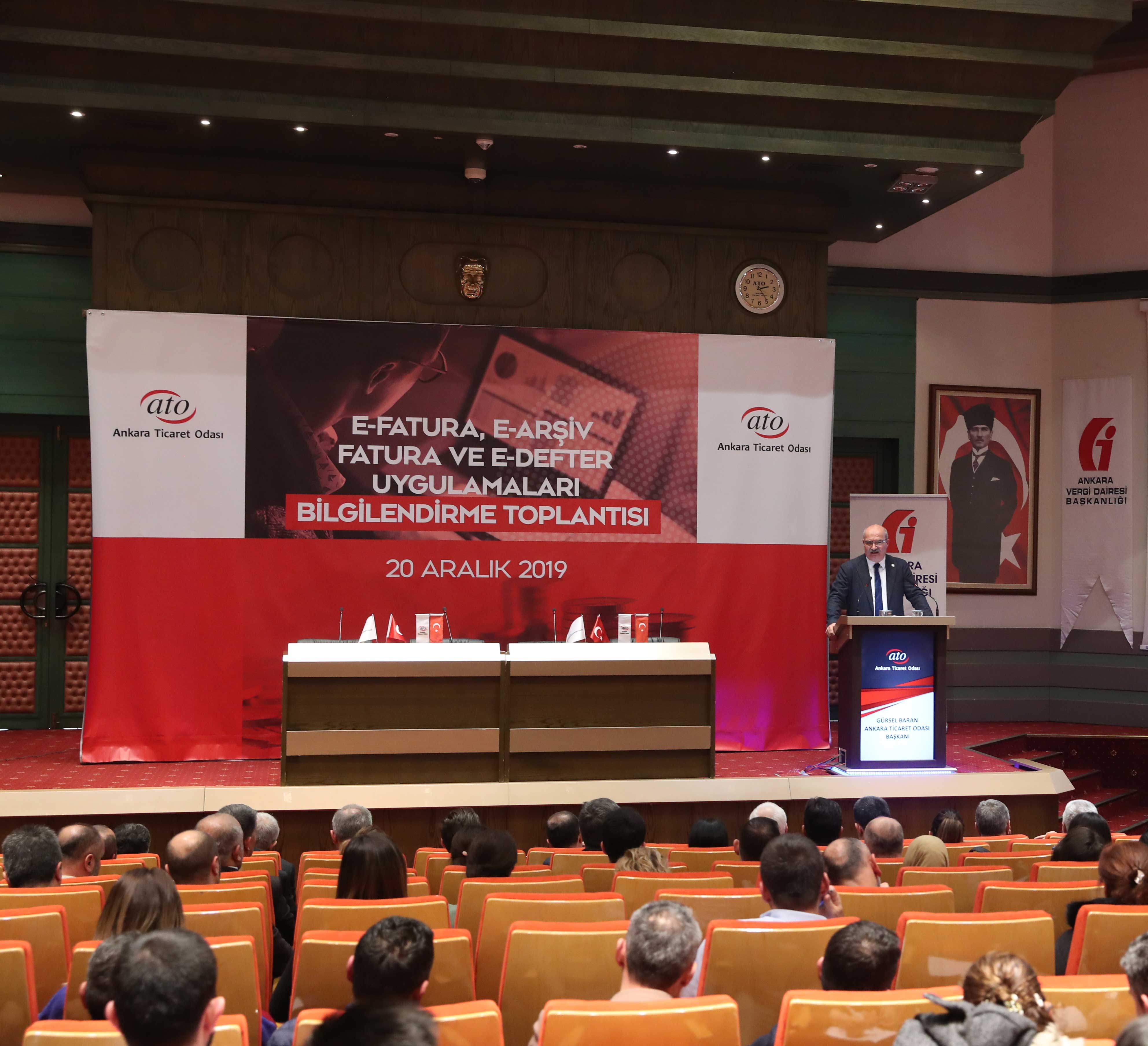 ATO'nun 15 No'lu Sıhhi Tesisat Malzemesi Satıcıları Meslek Komitesi'nin TİMKODER ve Ankara Vergi Dairesi Başkanlığı ile birlikte düzenlediği "E-Fatura, E-Arşiv Fatura ve E-Defter Uygulamaları Bilgilendirme Toplantısı" ATO Meclis Salonu'nda yapıldı. Ankara Vergi Dairesi Başkanı İlhan Karayılan'ın da katıldığı toplantının açılışında konuşan Ankara Ticaret Odası (ATO) Yönetim Kurulu Başkanı Gürsel Baran, vergi daireleri ile mükellefler arasındaki ilişkilerde ortaya çıkan tüm belgelerin dijitalleşmesinin önemine değinerek, "İş dünyası olarak vergi sistemindeki dijitalleşme bizler içinde büyük fayda sağlayacak" dedi. İletişim teknolojilerindeki gelişimin iş yapış şekillerini değiştirdiğini ve bu değişikliklerin dışında kalmanın mümkün olmadığını kaydeden Baran, elektronik uygulamaların mükelleflerin vergi daireleriyle yaptıkları işlemleri tek noktadan yürütmesini sağladığını belirtti. Baran, "Bir tuşla binlerce fatura arasından istediğimiz belge ve bilgiye kolaylıkla ulaşabileceğiz" dedi.