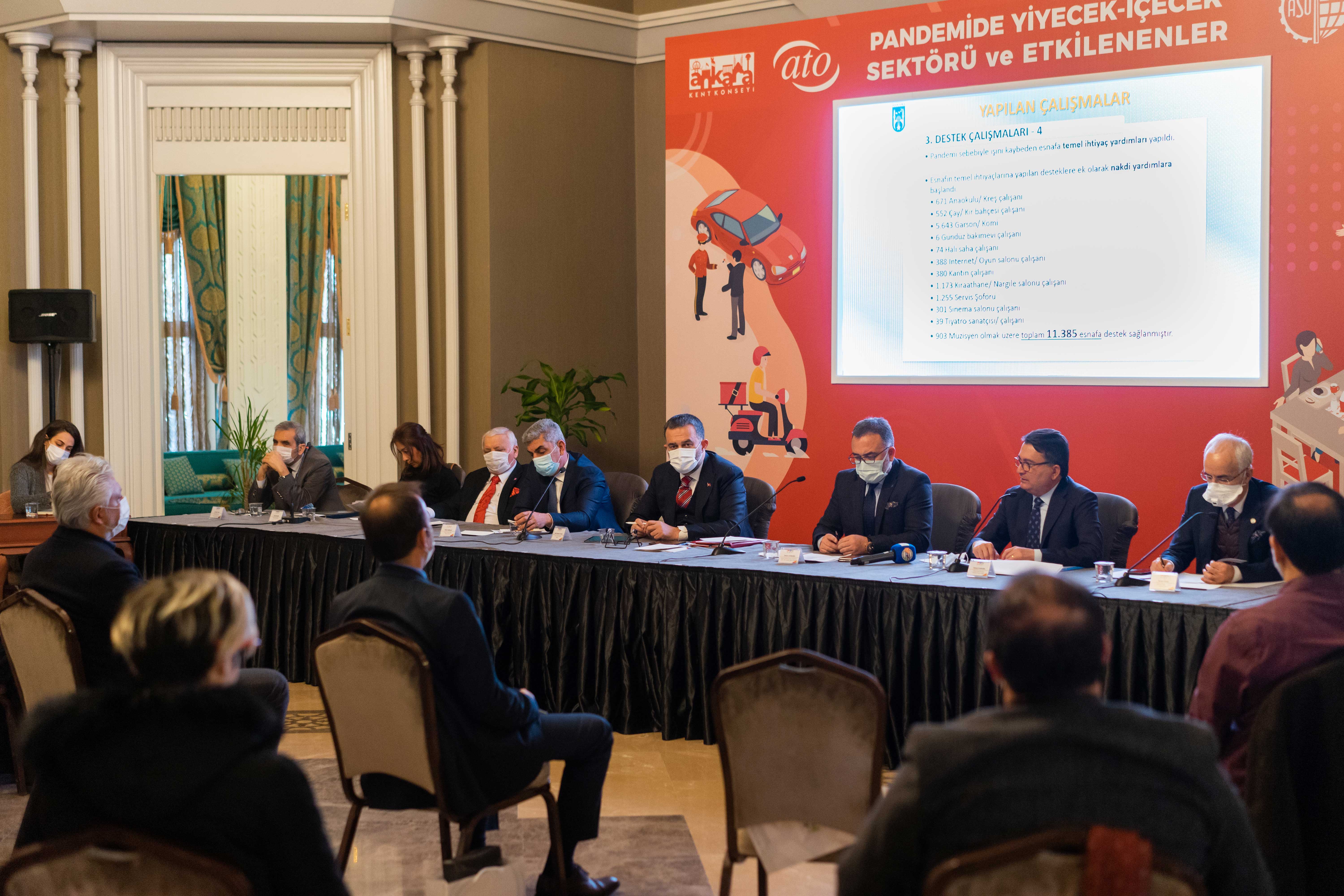 Toplantıda konuşan ATO Başkan Yardımcısı Temel Aktay, yeme-içme sektörünün pandemi sürecinde en çok etkilenen ilk beş sektör içerisinde yer aldığını belirtti. Ankara Ticaret Odası'nın pandemi sürecinde üyeleri için yaptığı çalışmalar hakkında bilgi veren Aktay, "Gel-al veya paket servis gibi sistemler bütün işletmelerin alt yapısına uymadığı için işletmeleri kesin bir çözüme ulaştırmadı" diye konuştu.