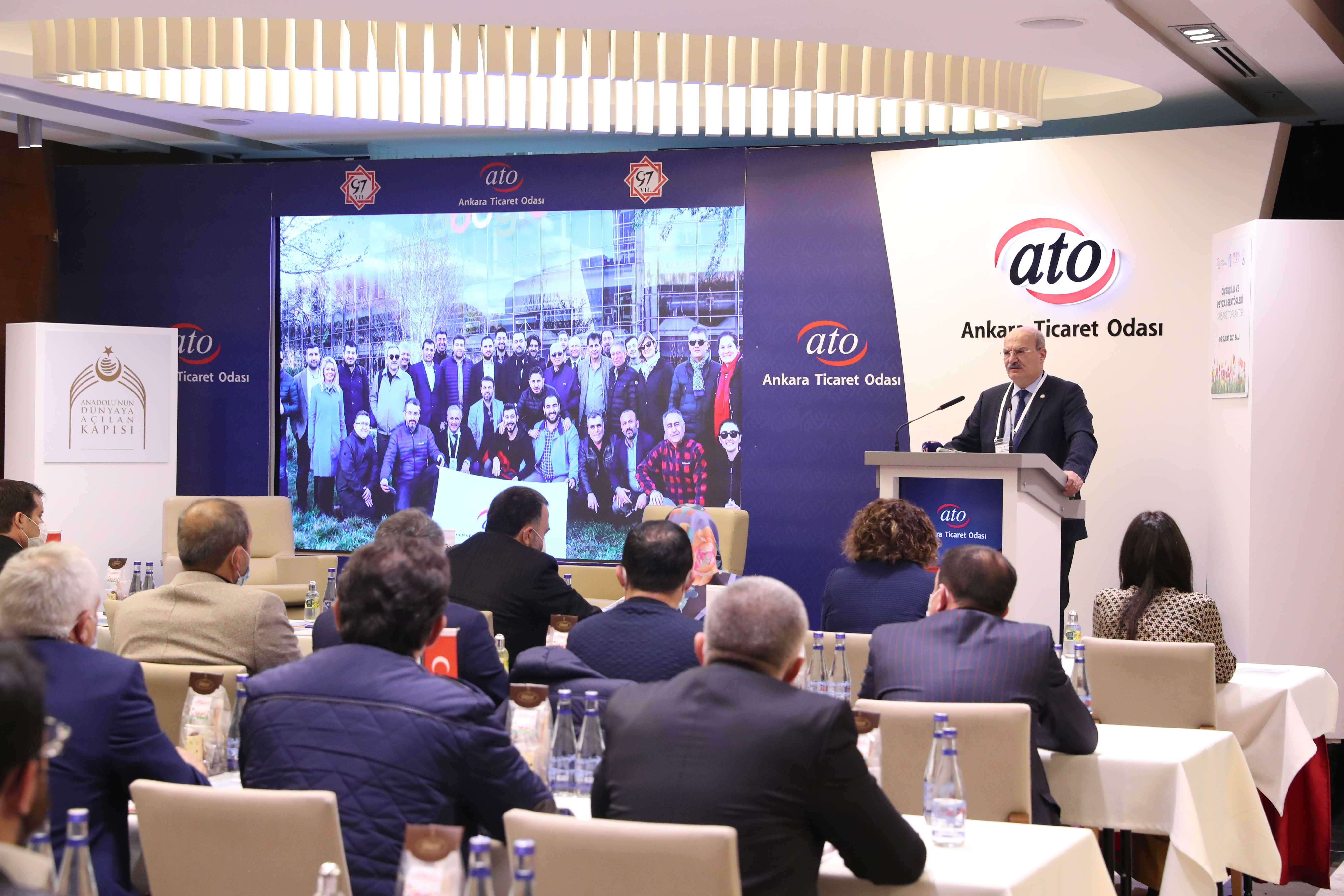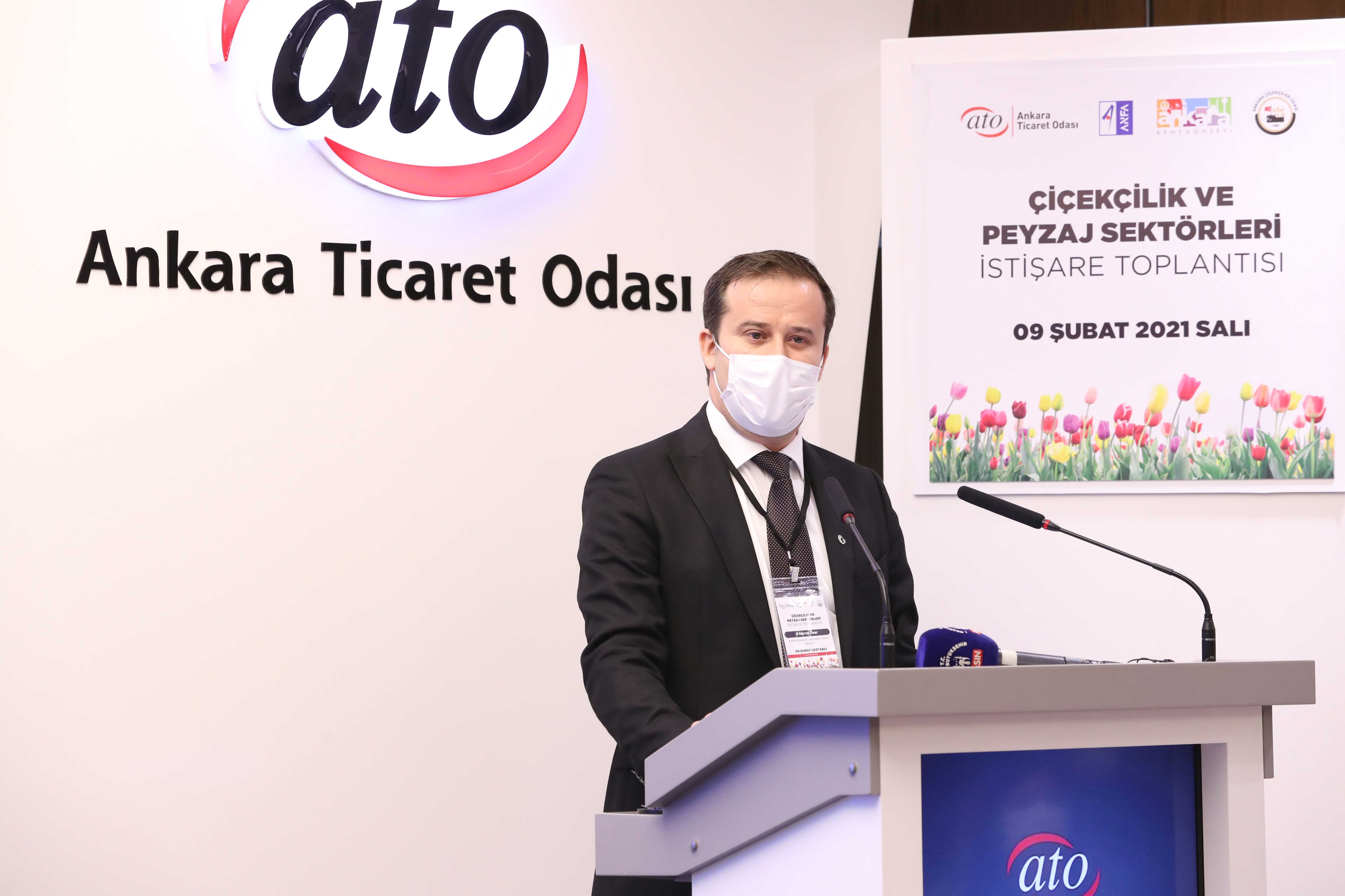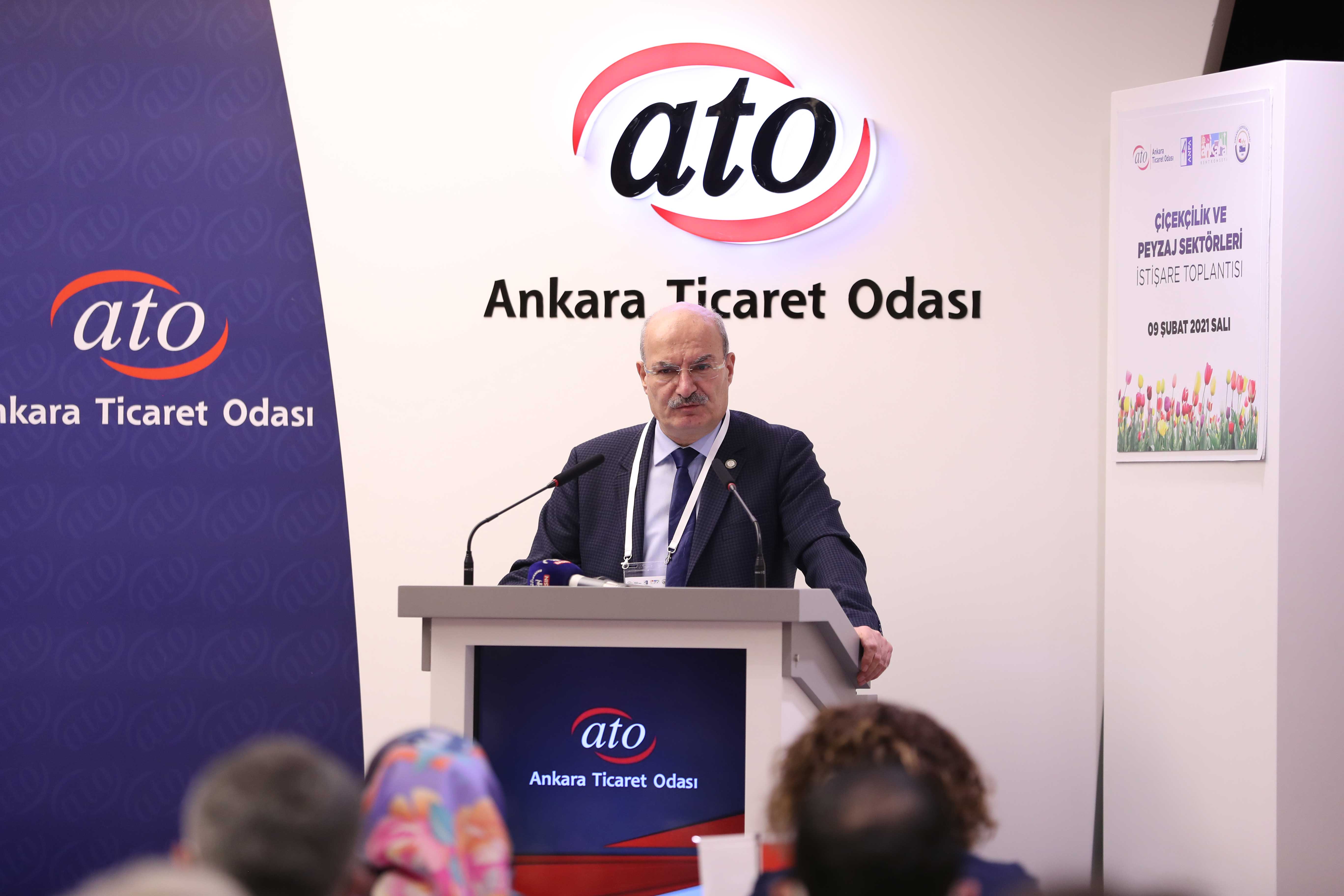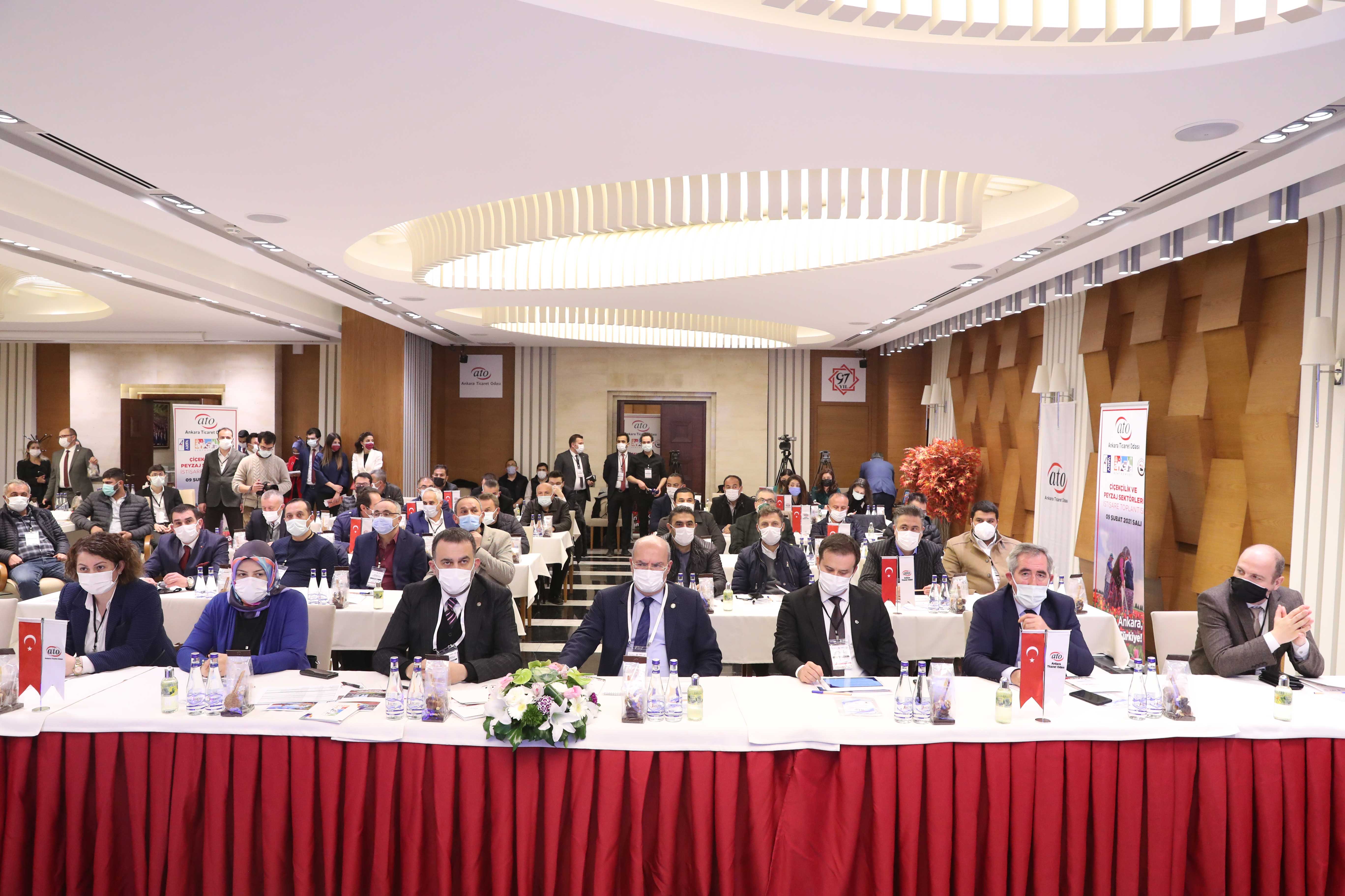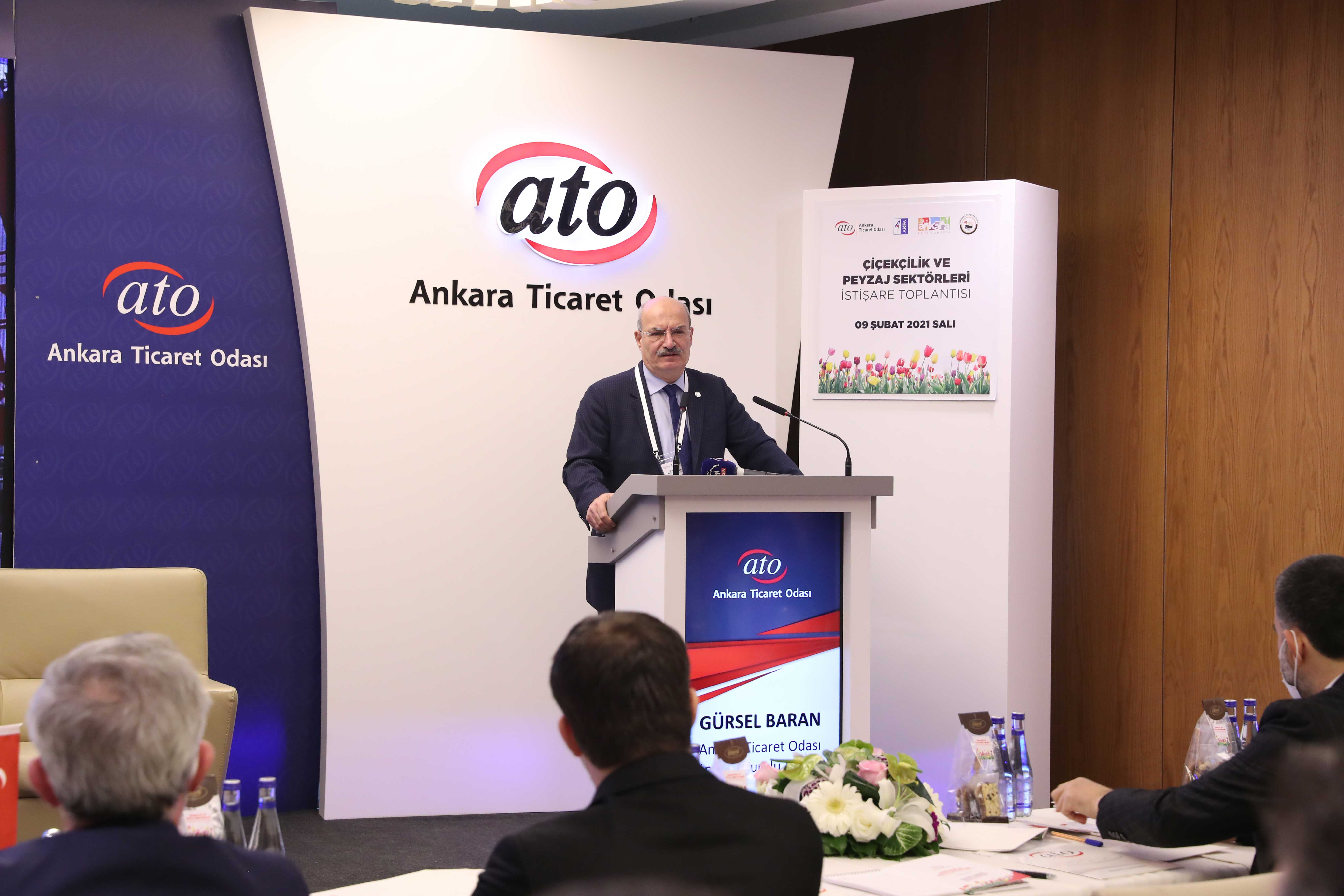 "Çiçekçilik ve Peyzaj Sektörleri İstişare Toplantısı" ATO'nun Duatepe Hizmet Binası'nda koronavirüs tedbirlerine uygun olarak gerçekleştirildi. Toplantının açılışında konuşan ATO Yönetim Kurulu Başkanı Gürsel Baran, çiçek ve peyzaj sektörlerinin pandemi sürecinden en fazla etkilenen sektörler arasında yer aldığını belirterek, eğlence, düğün, tören, kutlama, toplantı gibi etkinlik ve özel gün organizasyonlarının yapılamaması ve hafta sonu kısıtlamaları nedeniyle sektörün iş kaybı yaşadığını söyledi. Çiçekçilerin 14 Şubat Sevgililer Günü'ne denk gelen hafta sonu istisna kapsamına alınmasının sektöre moral olduğunu kaydeden Baran, başta Ankara Valisi Vasip Şahin olmak üzere İl Umumi Hıfzıssıhha Kurulu üyelerine teşekkür etti. Hizmet sektörünün pandemi sürecinden en fazla etkilenen sektörlerden olduğunu belirten Baran, hafta sonu yoğun iş yapan bir sektör olan çiçekçiliğin de süreçten etkilendiğini anlattı.