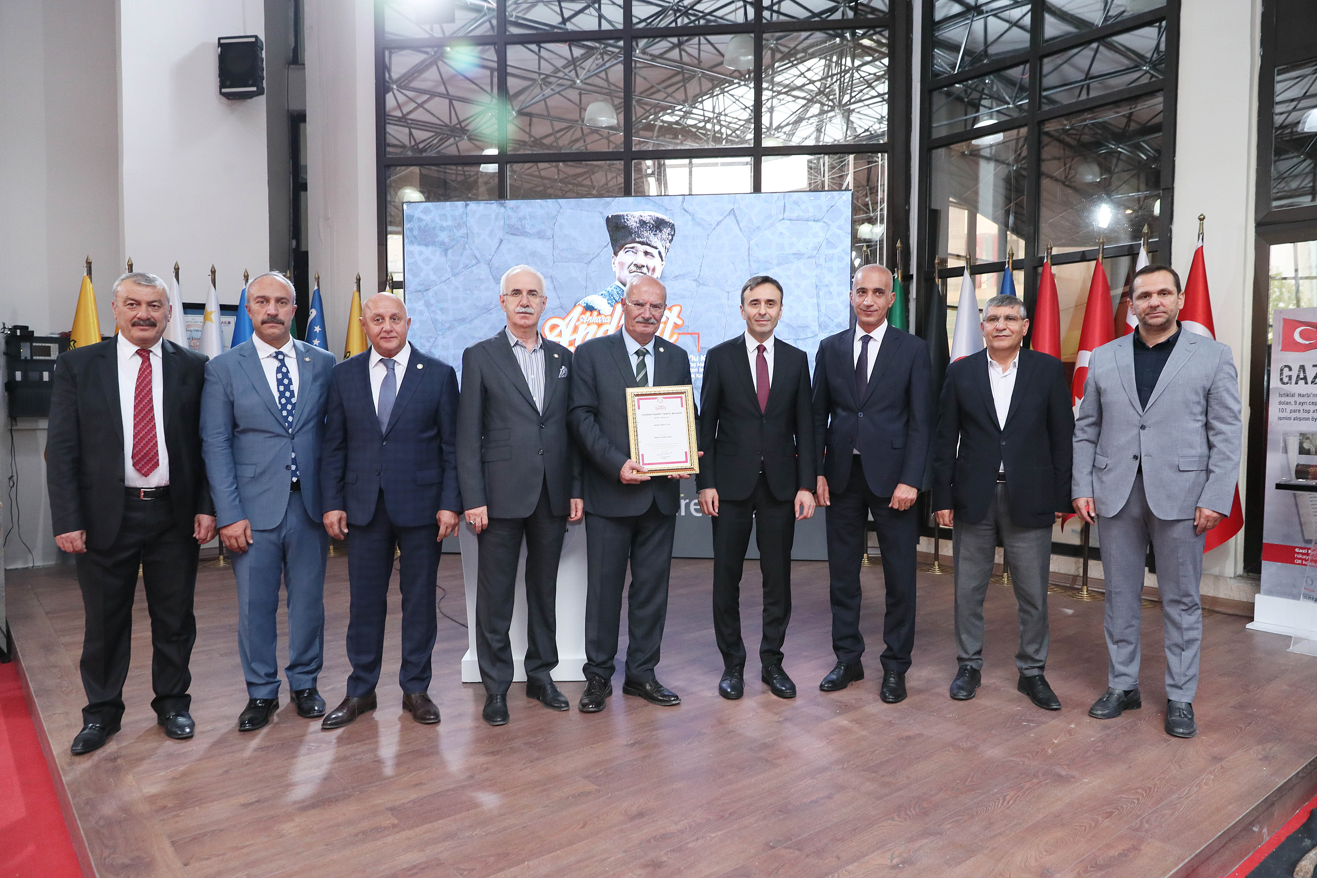 ATO Yönetim Kurulu Başkanı Gürsel Baran, Ankara Ticaret Odası'nın 30 No'lu Doğal Taş, Mermer ve Hazır Beton İmalatçıları Meslek Komitesi'nin çalışmalarıyla coğrafi işaret tescili aldığı "Ankara Andezit Taşı"nın Tescil Belgesi'ni ATO Fuaye alanında düzenlenen toplantıda, Türk Patent ve Marka Kurumu (TÜRKPATENT) Başkanı Cemil Başpınar'dan teslim aldı.