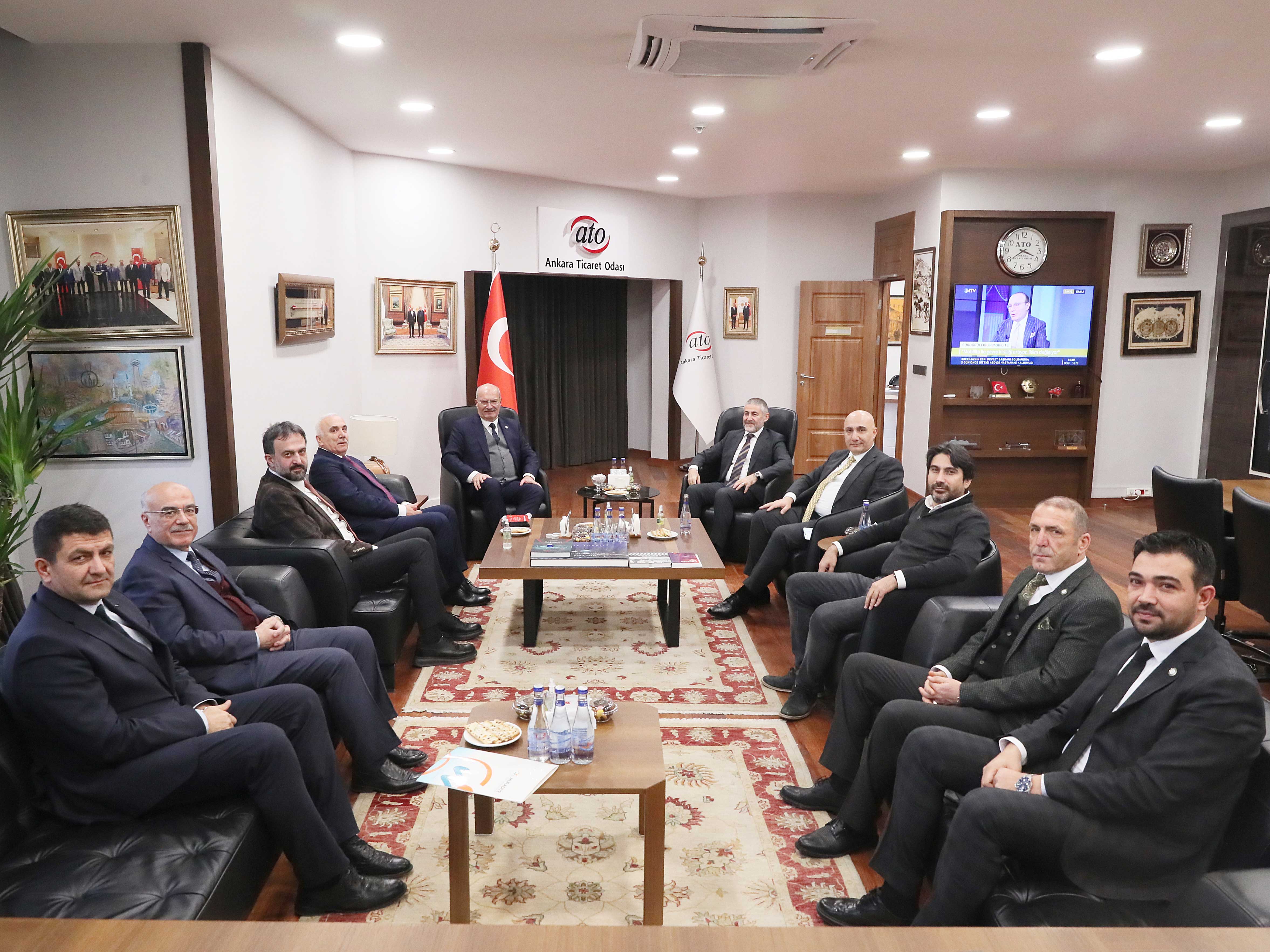 Hazine ve Maliye Bakanı Nebati'nin ATO Başkanı Baran'ı ziyaretinde, ATO Başkan Yardımcısı Halil İbrahim Yılmaz, ATO Yönetim Kurulu Üyeleri Halil İlik, Doç. Dr. Ömer Çağlar Yılmaz, Yasin Özyolu ile ATO Meclis Üyeleri Abidin Memili, Cengiz Duygulu ve ATO 61 No'lu Özel Eğitim - Öğretim Hizmetleri Meslek Komitesi Başkan Yardımcısı Mahmut Burkankulu da yer aldı.