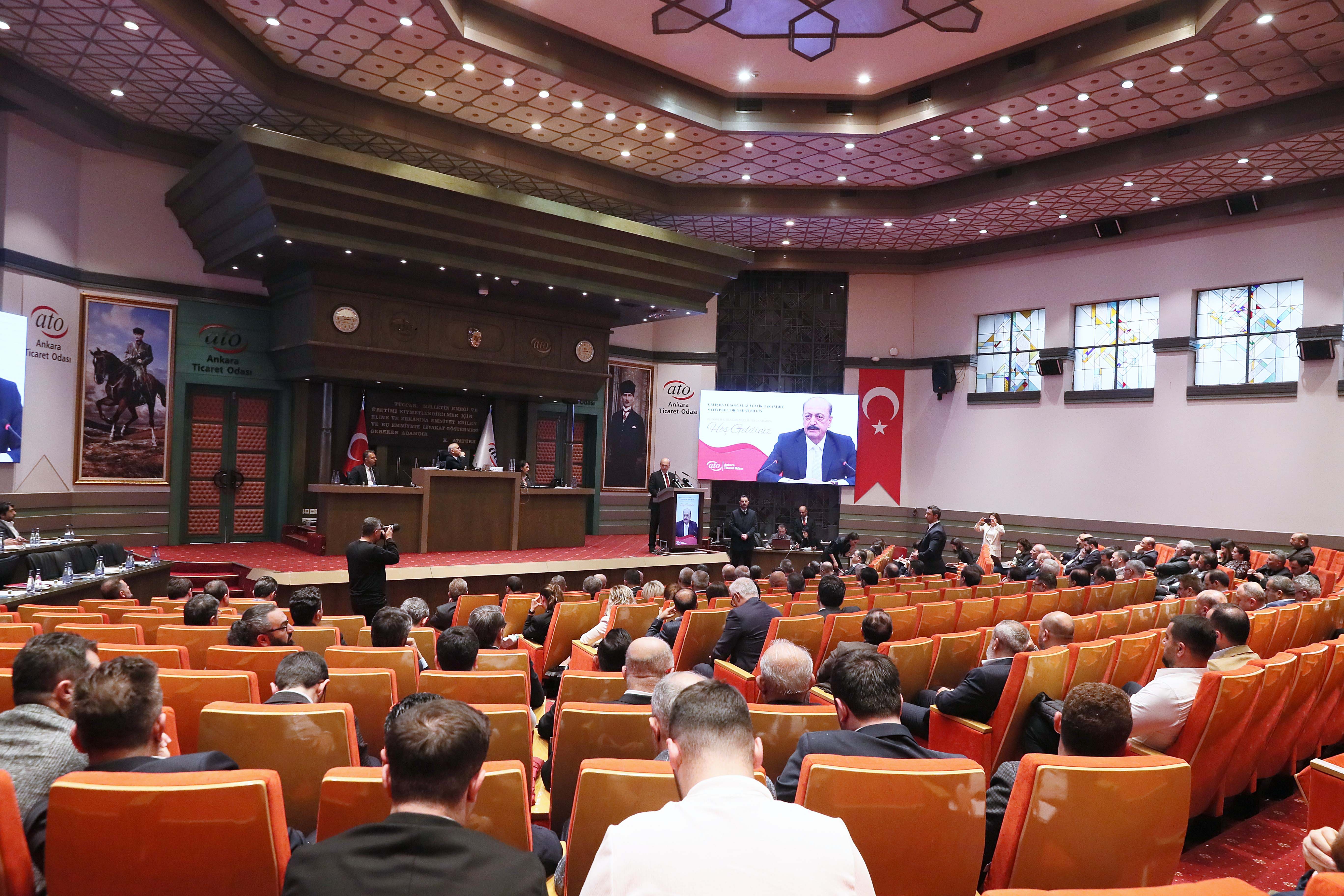 Çalışma ve Sosyal Güvenlik Bakanı Vedat Bilgin, Ankara Ticaret Odası'nın (ATO) 29. Dönem 6. Olağan Meclis Toplantısı'na katılarak Meclis Üyelerine hitap etti. ATO Meclis Salonu'nda gerçekleşen ve ATO Yönetim Kurulu Başkanı Gürsel Baran ile ATO Meclis Başkanı Mustafa Deryal'in açılış konuşmalarını yaptığı toplantıya, ATO Yönetim Kurulu ve Meclis Üyeleri katıldı.