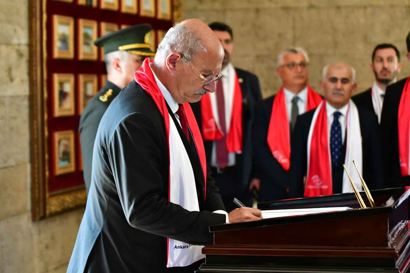 Cumhuriyetle yaşıt Ankara Ticaret Odası (ATO), kuruluşunun 100. Yılı kutlama programlarından ilki ATO Yönetim Kurulu Başkanı Gürsel Baran ve ATO Meclis Başkanı Mustafa Deryal, Yönetim Kurulu, Meclis ve Ankara ticaretini temsil etme yetkisini aldığı 452 organ üyesiyle birlikte Anıtkabir ziyareti ile başladı. Baran ve Deryal'in başkanlık ettiği ATO Heyeti, Aslanlı Yol'dan geçerek Anıtkabir'e ulaştı. ATO Başkanı Baran, Atatürk'ün mozolesine çelenk bırakmasının ardından Anıtkabir Özel Defterini imzaladı. Baran, Aziz Atatürk diyerek başladığı Anıtkabir Özel Defteri'nde "Ankara Ticaret Odamızı, Ahilik değerleriyle harmanladığımız 100 yıllık birikim ve tecrübemizle, alın terimize akıl terimizi ekleyerek, bilimi, teknolojiyi, yenilikleri kucaklayarak geleceğe taşıma kararlılığındayız" ifadelerini kullandı.