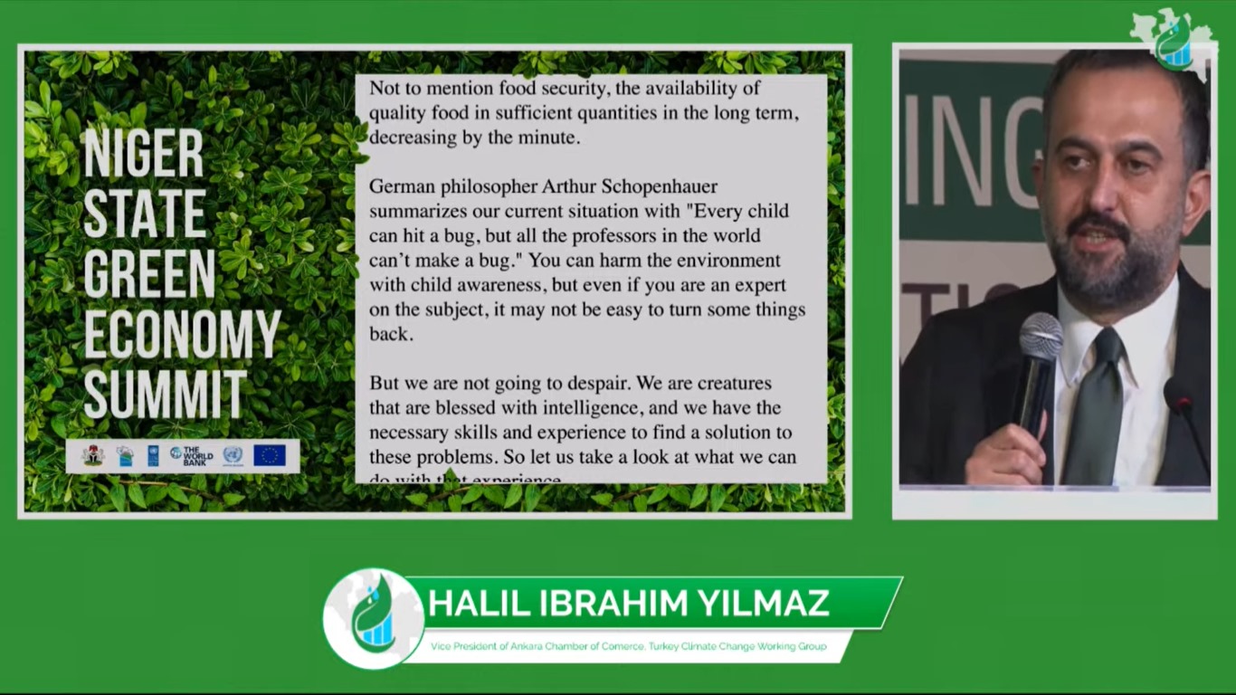 ATO Başkan Yardımcısı Halil İbrahim Yılmaz, Nijer Eyaleti Valiliği, Birleşmiş Milletler (BM), Avrupa Birliği (AB) ve Dünya Bankası tarafından 24-25 Ekim tarihleri arasında Nijerya'nın Nijer Eyaleti'nde gerçekleştirilen "1. Nijer Eyaleti Yeşil Ekonomi Zirvesi "ne katıldı. Zirve'nin "Sürdürülebilir Tarım" başlıklı oturumunda konuşan Yılmaz konuşmasında T.C. Tarım ve Orman Bakanlığı'nın Dünya Bankası desteğiyle hayata geçirdiği Türkiye İklim Dostu ve Rekabetçi Tarımsal Büyüme Projesi'ne (TUCSAP) değinerek, Proje'nin sürdürülebilir ve rekabetçi tarımsal büyüme için kapasiteyi güçlendirmeyi ve Türkiye'nin hedeflenen bölgelerinde iklim dostu tarımın kullanımını teşvik etmeyi amaçladığını belirtti. Yılmaz, "Ankara Ticaret Odası olarak, Nijerya'daki tüm kurumları, Tarım ve Orman Bakanlığımızın iklim krizine uyum konusunda şimdiye kadar edinmiş olduğu deneyim ve uzmanlıktan faydalanmaya davet ediyoruz." dedi.