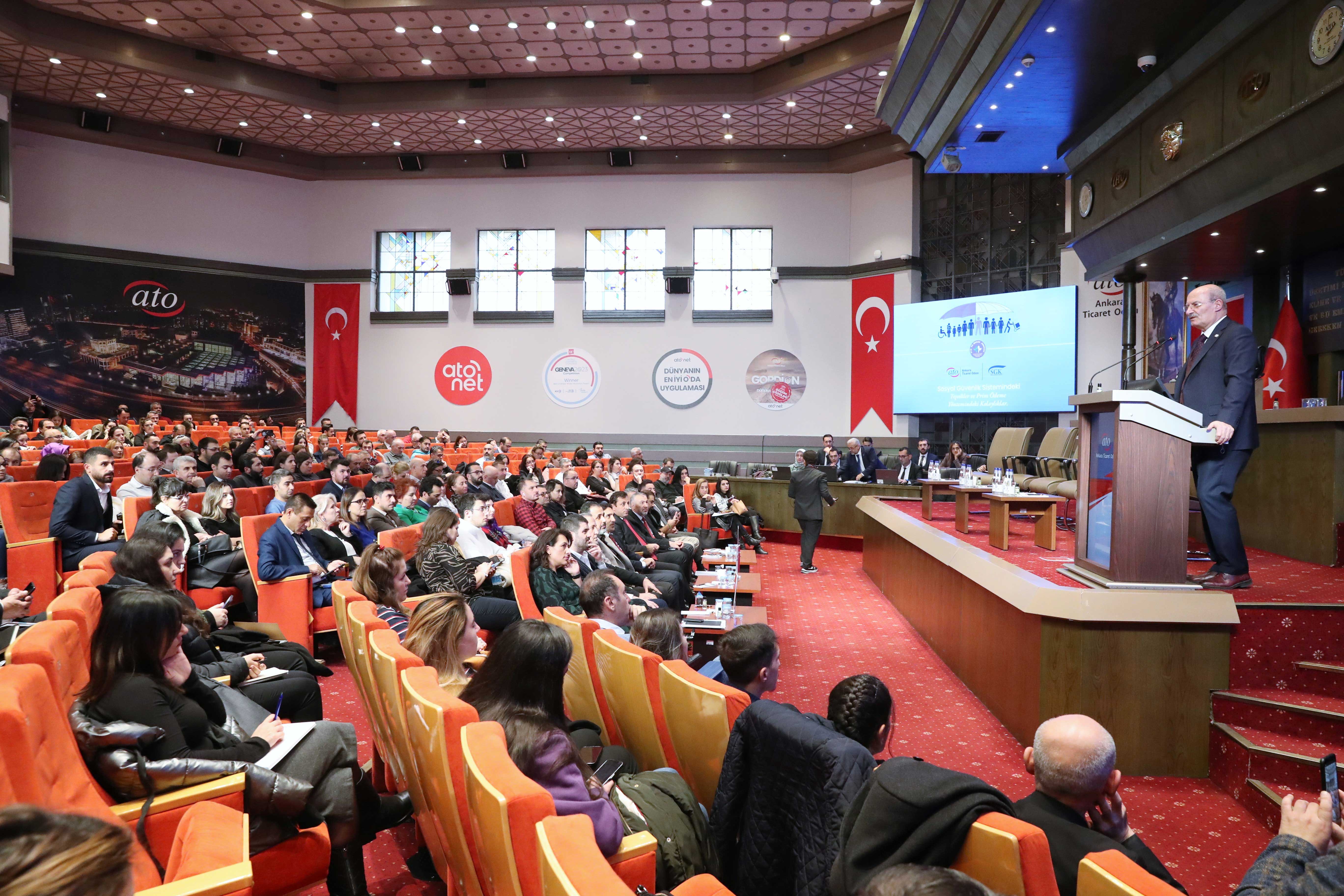 ATO VE SGK İŞBİRLİĞİYLE DÜZENLENEN "SOSYAL GÜVENLİK SİSTEMİNDEKİ TEŞVİKLER VE PRİM ÖDEME YÖNTEMİNDEKİ KOLAYLIKLAR" KONULU TOPLANTI ATO MECLİS SALONU'NDA YAPILDI.