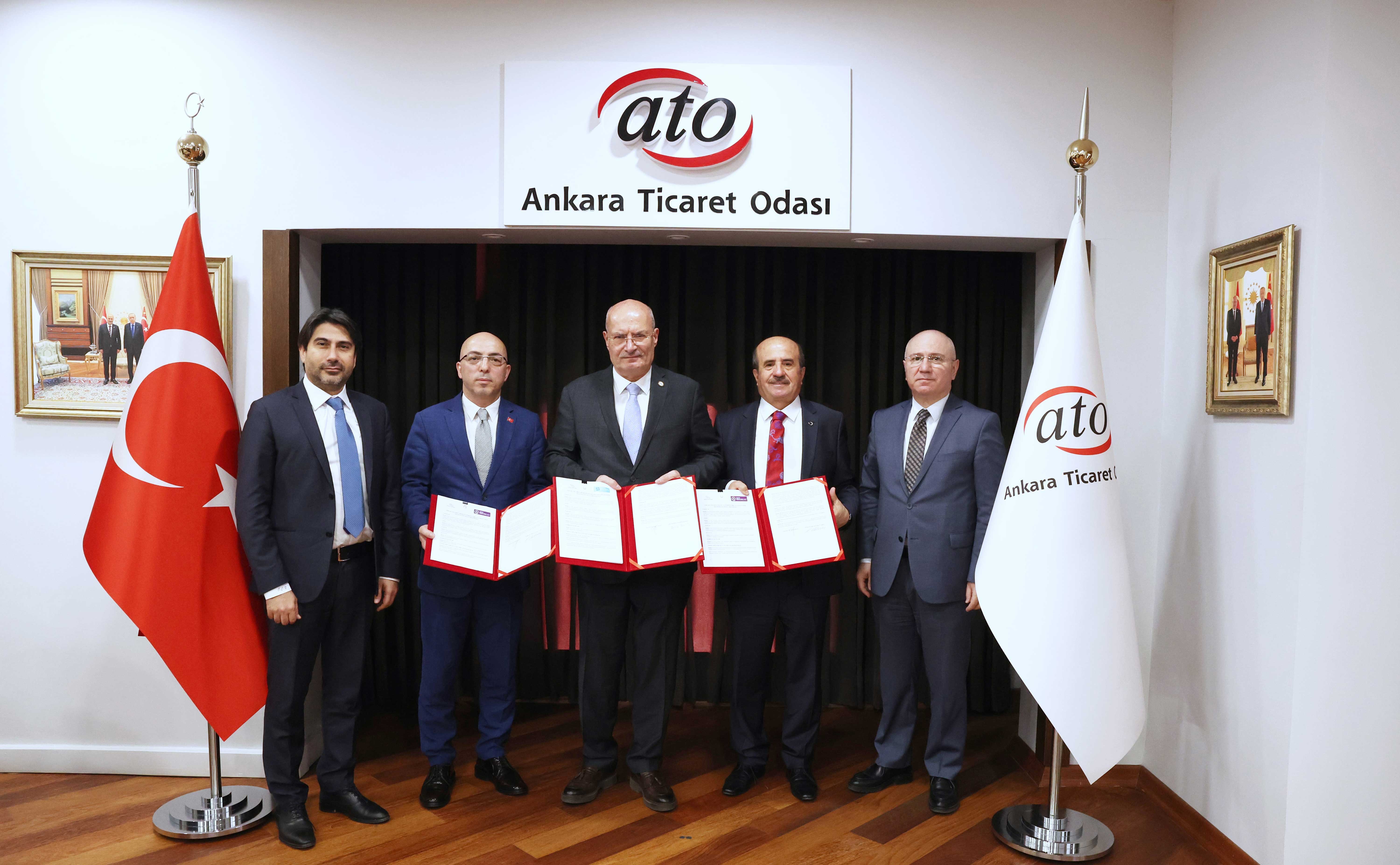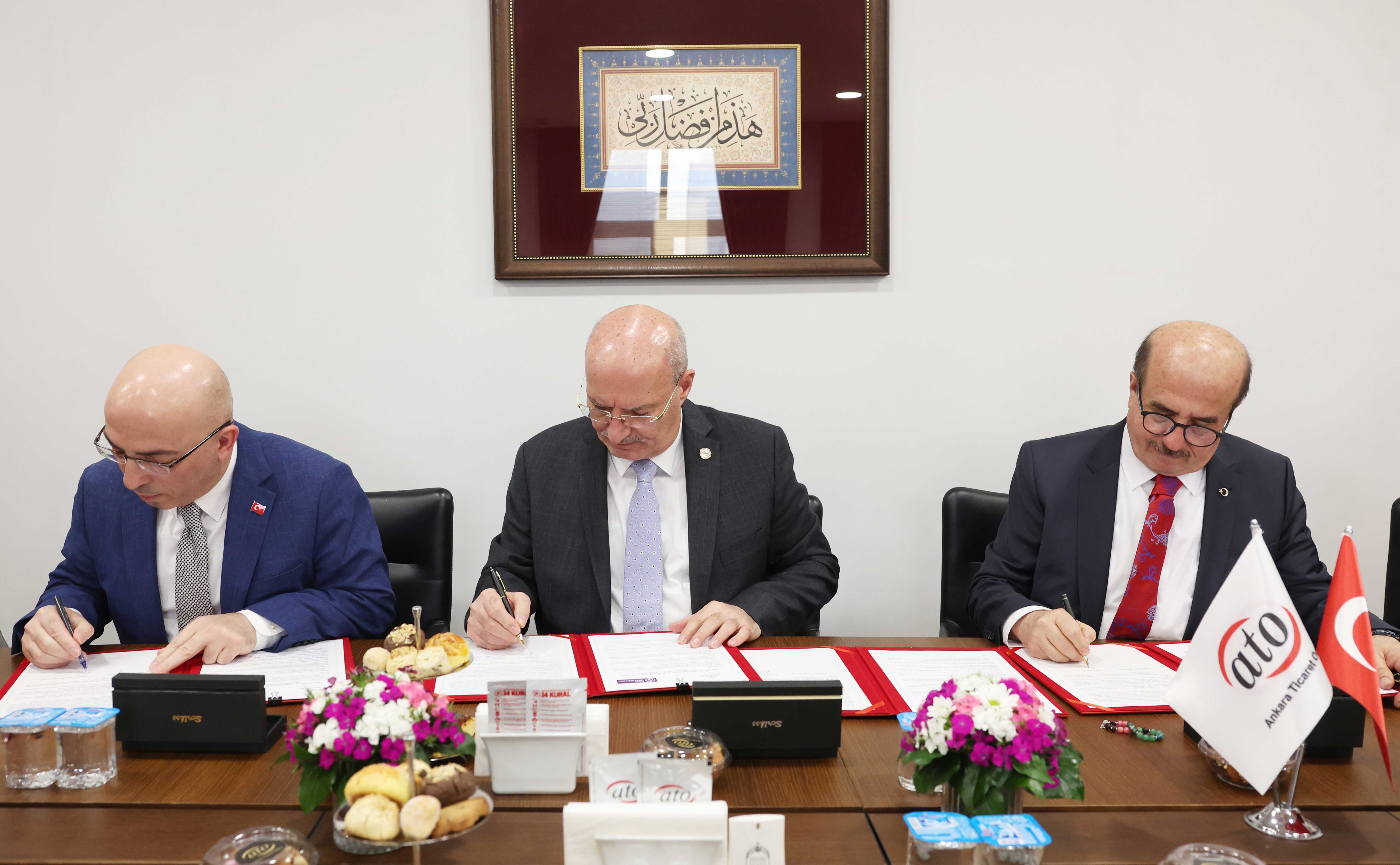 ATO Yönetim Kurulu Başkanı Gürsel Baran, TONV Başkanı Dr. Eyüp Kahveci ve SDD Başkanı Dr. Ahmet Aksu, Ankara'nın sağlık hizmetleri, medikal teknoloji ve sağlık yatırım kabiliyetinin uluslararası alanda tanıtımına yönelik iş birliği protokolünü, ATO'da gerçekleştirilen bir programla imzalandı.