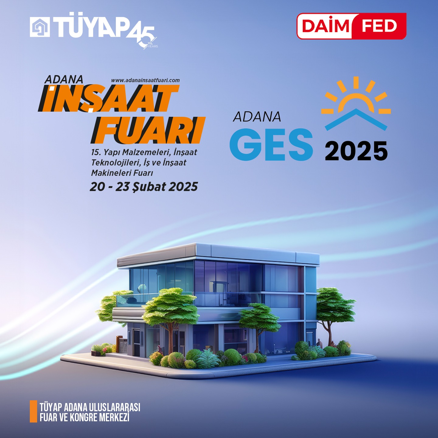 15. Yapı Malzemeleri, İnşaat Teknolojileri, İş ve İnşaat Makineleri, Gayrimenkul ve Akıllı Ev Sistemleri Fuarı (ADANA İNŞAAT 2025) ile 14. Isıtma, Soğutma, Havalandırma, Doğalgaz Teknolojileri, Tesisat, Yalıtım, Güneş Enerji Sistemleri, Güneş Depolama Sistemleri, Yenilenebilir Enerji Sistemleri ve Teknolojileri Fuarı (ADANA GES 2025) 20- 23 Şubat 2025 tarihleri arasında Tüyap Adana Uluslararası Fuar ve Kongre Merkezi'nde eş zamanlı olarak gerçekleştirilecektir.
