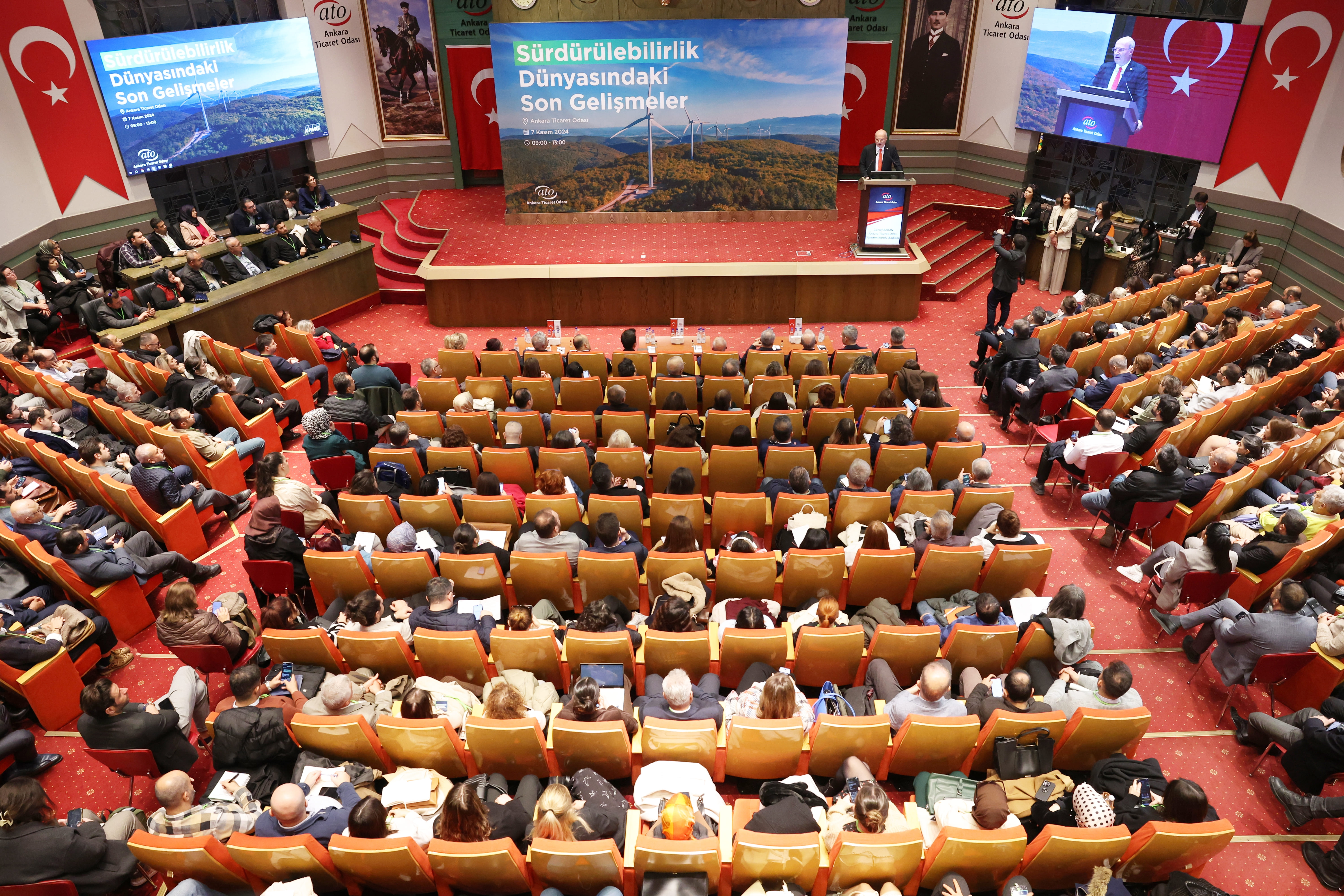 Ankara Ticaret Odası'nın, KPMG Denetim Vergi ve Danışmanlık Hizmetleri katkılarıyla düzenlediği "Sürdürülebilirlik Dünyasındaki Son Gelişmeler" Semineri ATO Meclis Salonu'nda yapıldı. Seminer programının açılışında ATO Yönetim Kurulu Başkanı Gürsel Baran ile OSTİM OSB Yönetim Kurulu Başkanı Orhan Aydın, Küçük ve Orta Ölçekli İşletmeleri Geliştirme ve Destekleme İdaresi Başkanlığı (KOSGEB) Proje Yönetim Daire Başkanı Faruk Kahvecioğlu, Kamu Gözetimi Muhasebe ve Denetim Standartları Kurumu Sürdürülebilirlik Dairesi Başkanlığı Uzmanı Tufan Gökçer ve KPMG Denetim Vergi ve Danışmanlık Hizmetleri Şirketi Ortağı Ankara Lideri Engin Ölmez birer konuşma yaptı.