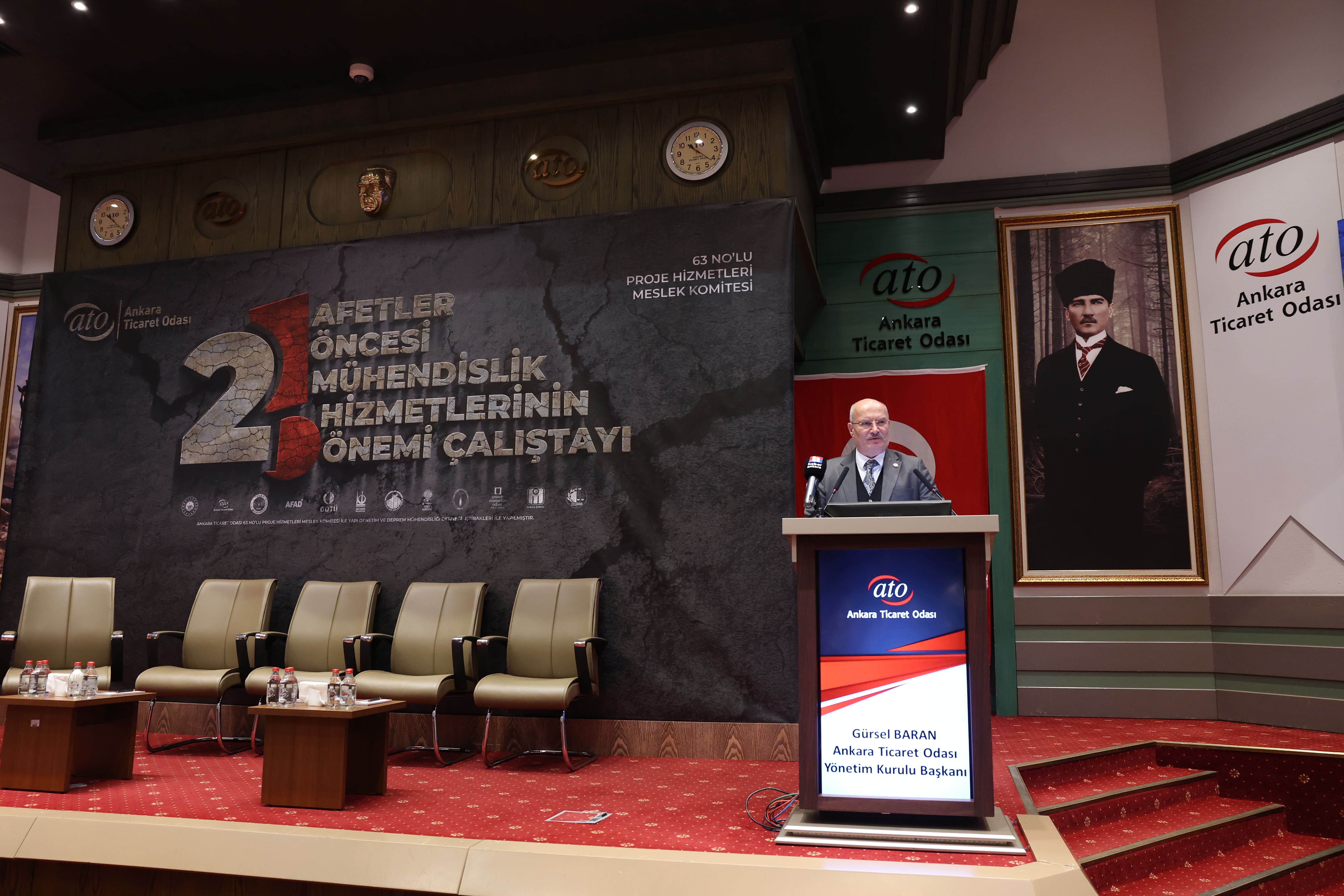 ATO Başkanı Gürsel Baran, deprem, sel, fırtına, volkanik patlama gibi doğal afetlerin yaşamı derinden etkileyerek, fiziksel, sosyal, psikolojik ve ekonomik açıdan yıkıcı sonuçlara yol açtığını belirterek, afetleri doğası gereği tamamen engelleme veya durdurmanın mümkün olmadığını, ancak alınacak önlemlerle etkilerinin azaltılıp, zararlarının en aza indirilebileceğini söyledi. Afet öncesi önlemlerde mühendislik hizmetlerinin önemine dikkat çeken Baran, "Dayanıklı altyapılar kurmak, erken uyarı sistemleri ve afet bilinci oluşturmak depremlere hazırlık olarak yapılabilecek çalışmalar. Mühendislik hizmetleri de aynı şekilde, bölgenin veya bir ülkenin tamamının afetlere karşı daha dirençli hale gelmesi için kritik bir adımı teşkil ediliyor. Afet öncesi mühendislik hizmetleri, risk analizlerinin yapılması, binaların güçlendirilmesi, altyapıların ve şehirlerin afete dayanıklı hale getirilmesi açısından çok önemli. Deprem ve diğer doğal afetler, çağımızın en yıkıcı savaşları, karşıdaki hasmımız da tedbirsizlik. Afetler öncesi önlem, beka meselesidir" dedi.