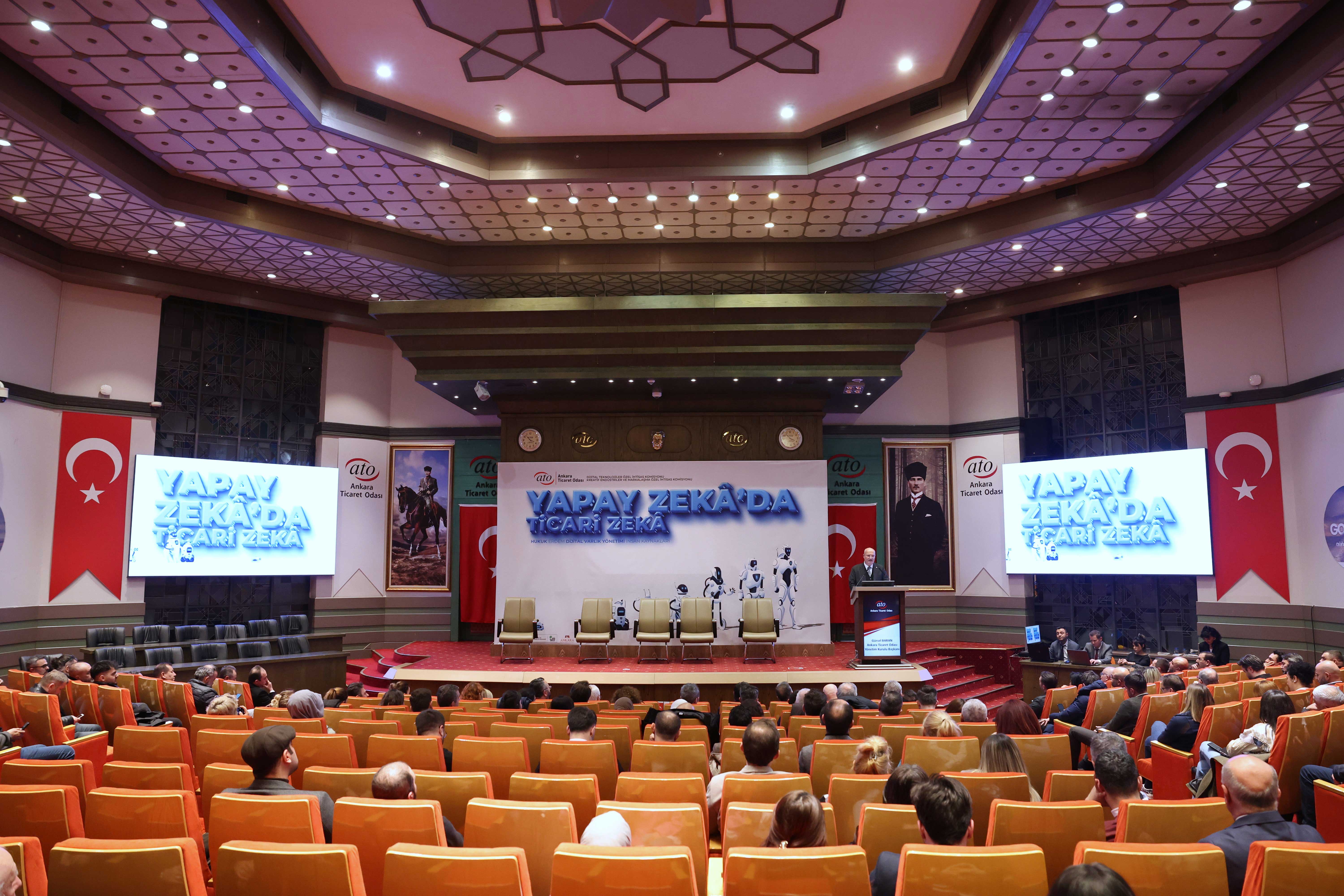 Ankara Ticaret Odası'nın Dijital Teknolojiler Özel İhtisas Komisyonu ile Kreatif Endüstriler ve Markalaşma Özel İhtisas Komisyonu tarafından düzenlenen "Yapay Zekâ'da Ticari Zekâ" toplantısı, ATO Meclis Salonu'nda yapıldı. ATO Yönetim Kurulu Başkanı Gürsel Baran'ın açılış konuşması yaptığı programda, Ankara Kalkınma Ajansı Genel Sekreteri Av. Dr. Duhan Kalkan, Yapay Zekâ Politikaları Derneği (AIPA) Kurucu Başkanı Zafer Küçükşabanoğlu, ATO Dijital Teknolojiler Özel İhtisas Komisyonu Başkanı Mehmet Toprak ve ATO Kreatif Endüstriler ve Markalaşma Özel İhtisas Komisyonu Üyesi Efe Polat da birer konuşma gerçekleştirdi.