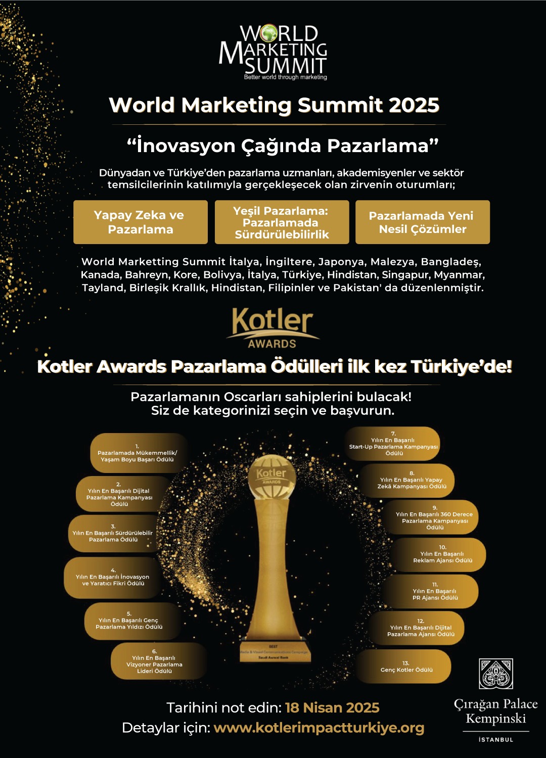 "World Marketing Summit 2025" ve "Kotler Awards", 18 Nisan 2025 tarihinde Çırağan Palace Kempinski, İstanbul'da gerçekleşecektir.