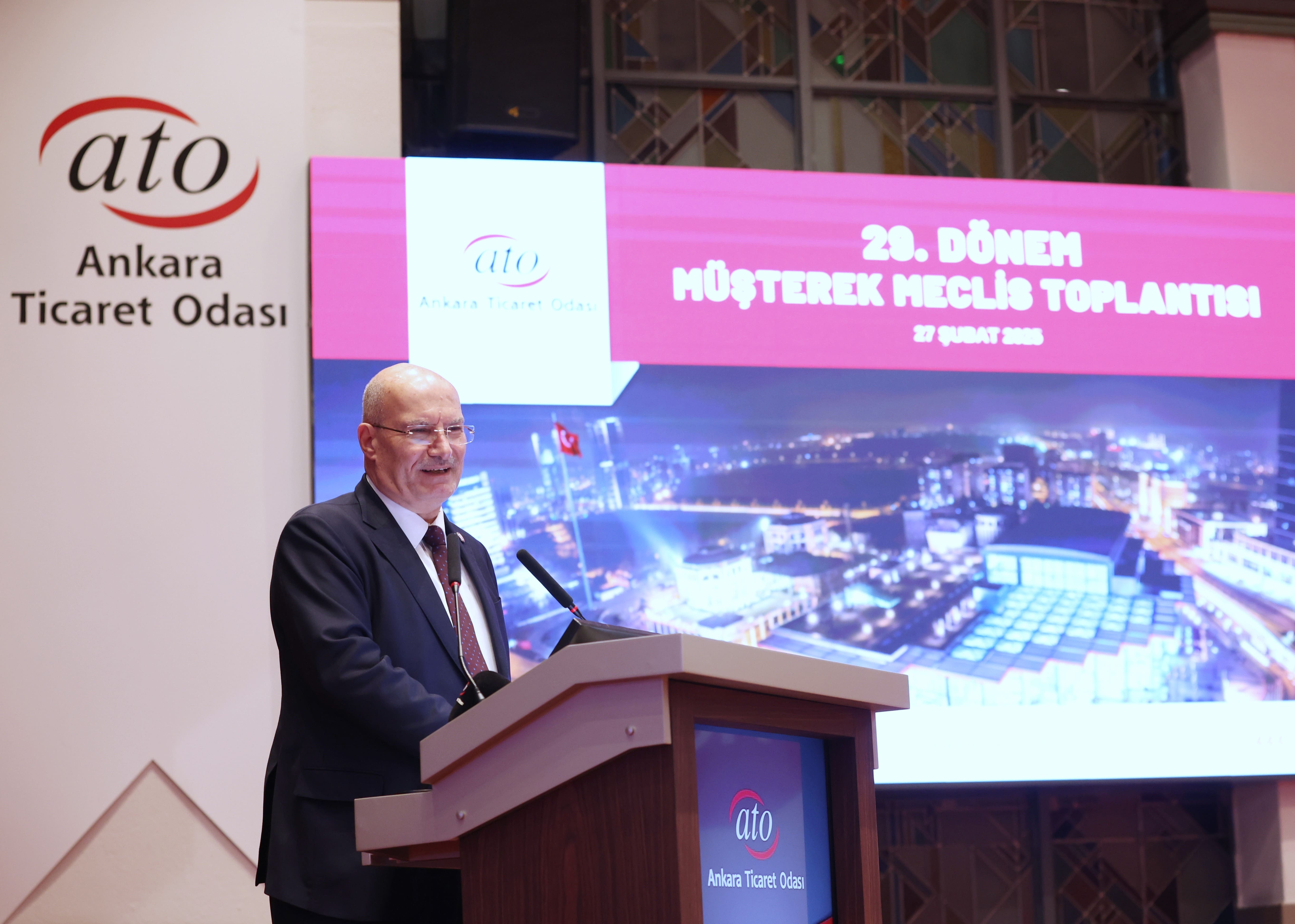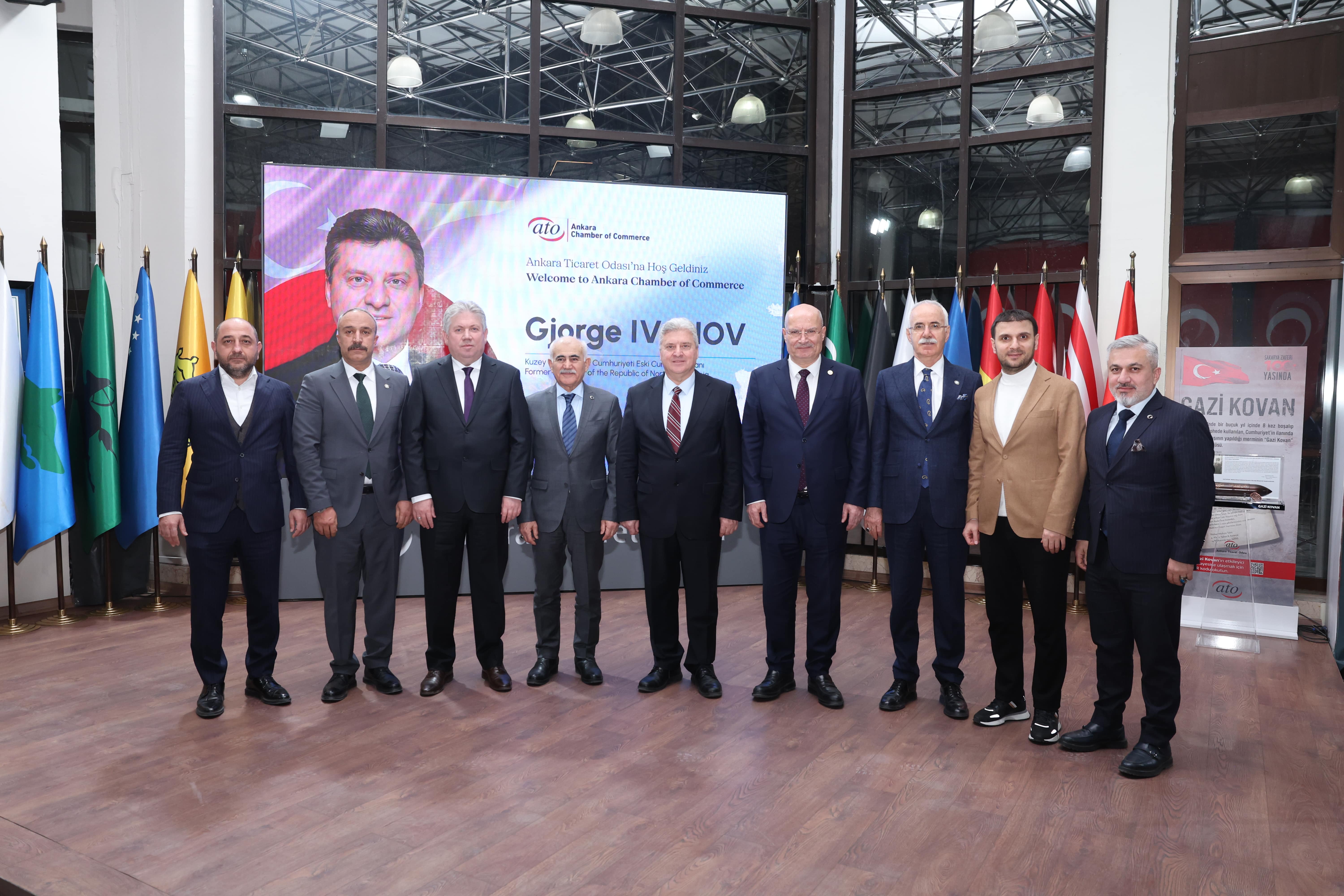 28 Şubat 2025- Ankara Ticaret Odası'nın (ATO), komite ve meclis üyelerinin müşterek katılımıyla gerçekleştirdiği 29. Dönem Şubat Ayı Olağan Meclis Toplantısı, Kuzey Makedonya 4. Cumhurbaşkanı Gjorge Ivanov'un katılımlarıyla, ATO Meclis Başkanı Mustafa Deryal'in başkanlığında, ATO Meclis Salonu'nda yapıldı.