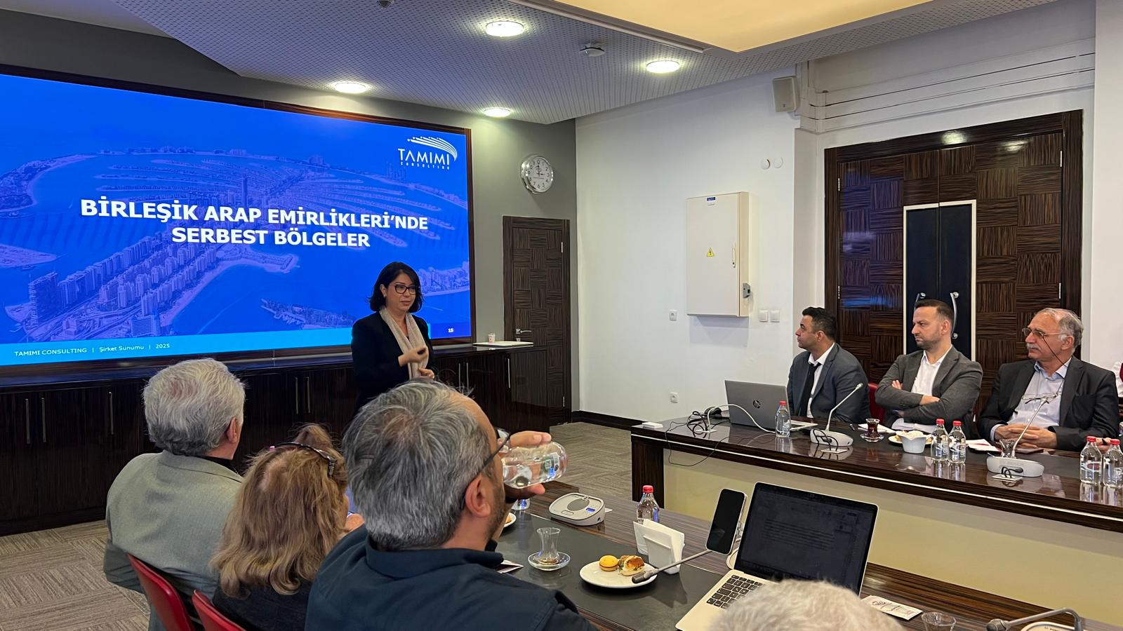 Tamimi Danışmanlık İstanbul Müdürü Senem Erdoğan da "Birleşik Arap Emirlikleri'nde Serbest Bölgeler" başlıklı sunumuyla, ülkenin yatırımcılara yönelik yüzde yüz mülkiyet imkânı, kurumlar ve gelir vergisi muafiyeti, gümrük rejimine tabii olmaksızın ithalat ve ihracat imkanı tanıması ve havaalanı-liman-ana kara serbest bölgeleri ile geniş lojistik ve ulaşım imkânlarına dair bilgiler aktardı. Dubai Çoklu Emtia Merkezi (DMCC) hakkında bilgi veren Erdoğan, "Merkezde, Hindistan, Birleşik Arap Emirlikleri ve İngiltere çoğunluklu olmak üzere 190 ülkeden 25 bin firma bulunuyor. 87 iş kulesinde 90 bin çalışan ve 100 bine yakın oturan kişi var. Dubai'nin toplam yatırımlarının yüzde 15'ini oluşturan bu merkezde 16 sektör bulunuyor. Altın ve değerli taşlar başta olmak üzere çay ve kahve ticaretinin çok büyük bir bölümü buradan yönetiliyor" dedi.