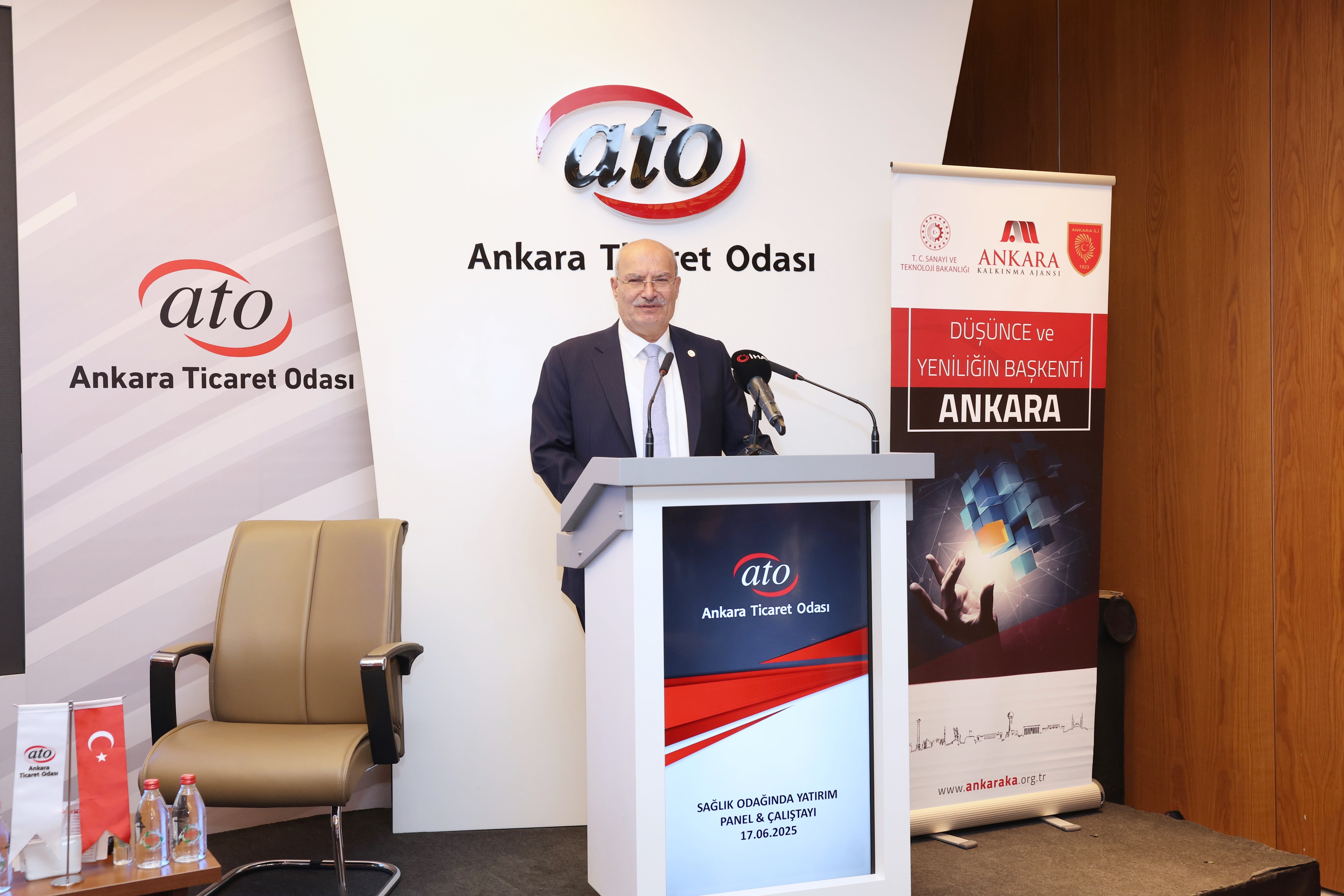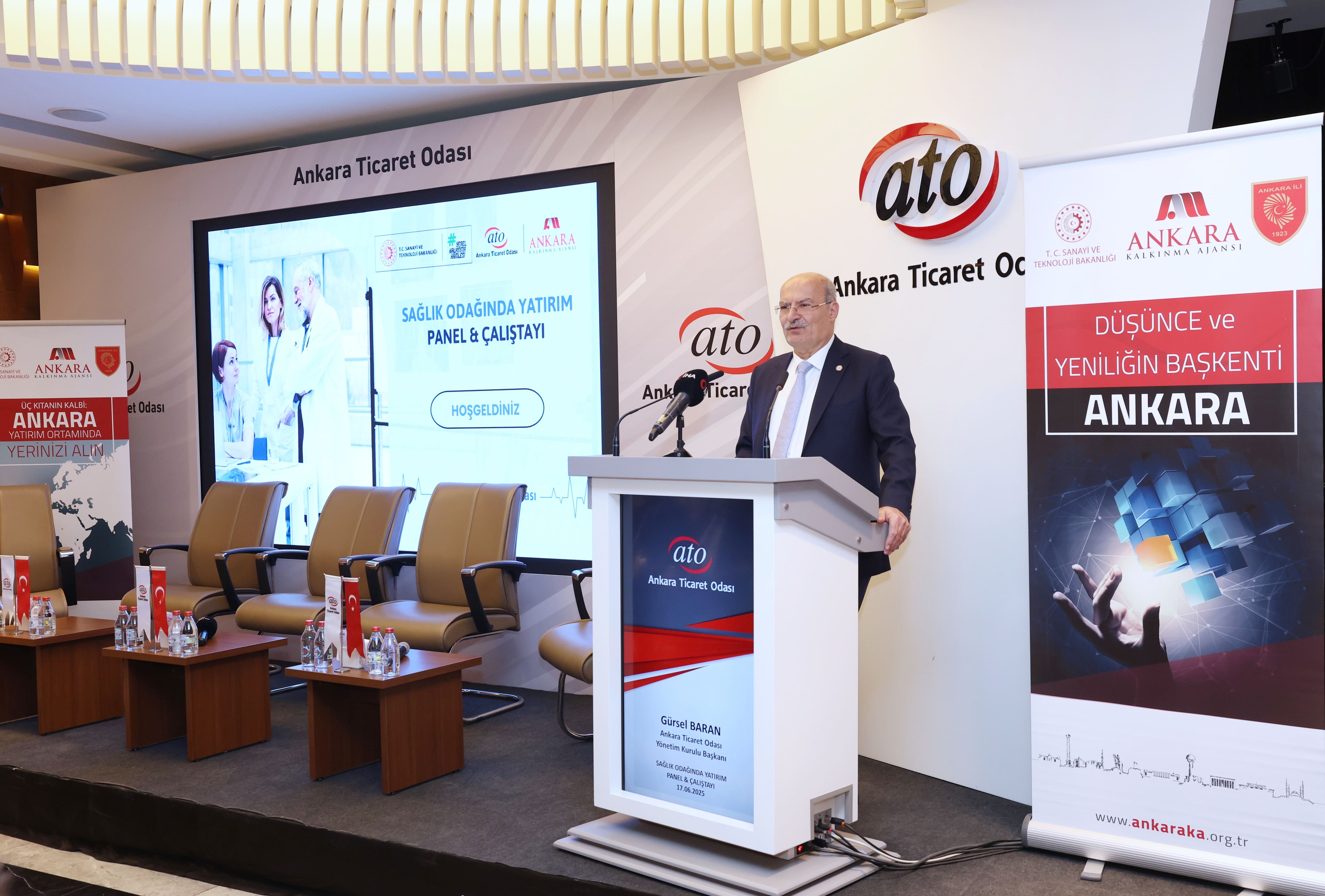 Başkent'in, sağlık sektöründeki girişimcilik ve yatırımcılık ekosisteminin güçlendirilmesine yönelik, Ankara Ticaret Odası ev sahipliğinde, Ankara Kalkınma Ajansı koordinasyonunda gerçekleştirilen "Sağlık Odağında Yatırım Paneli ve Çalıştayı"nın açılış programı ATO Yönetim Kurulu Başkanı Gürsel Baran ve Ankara Kalkınma Ajansı Genel Sekreteri Av. Dr. Duhan Kalkan'ın katılımıyla yapıldı.