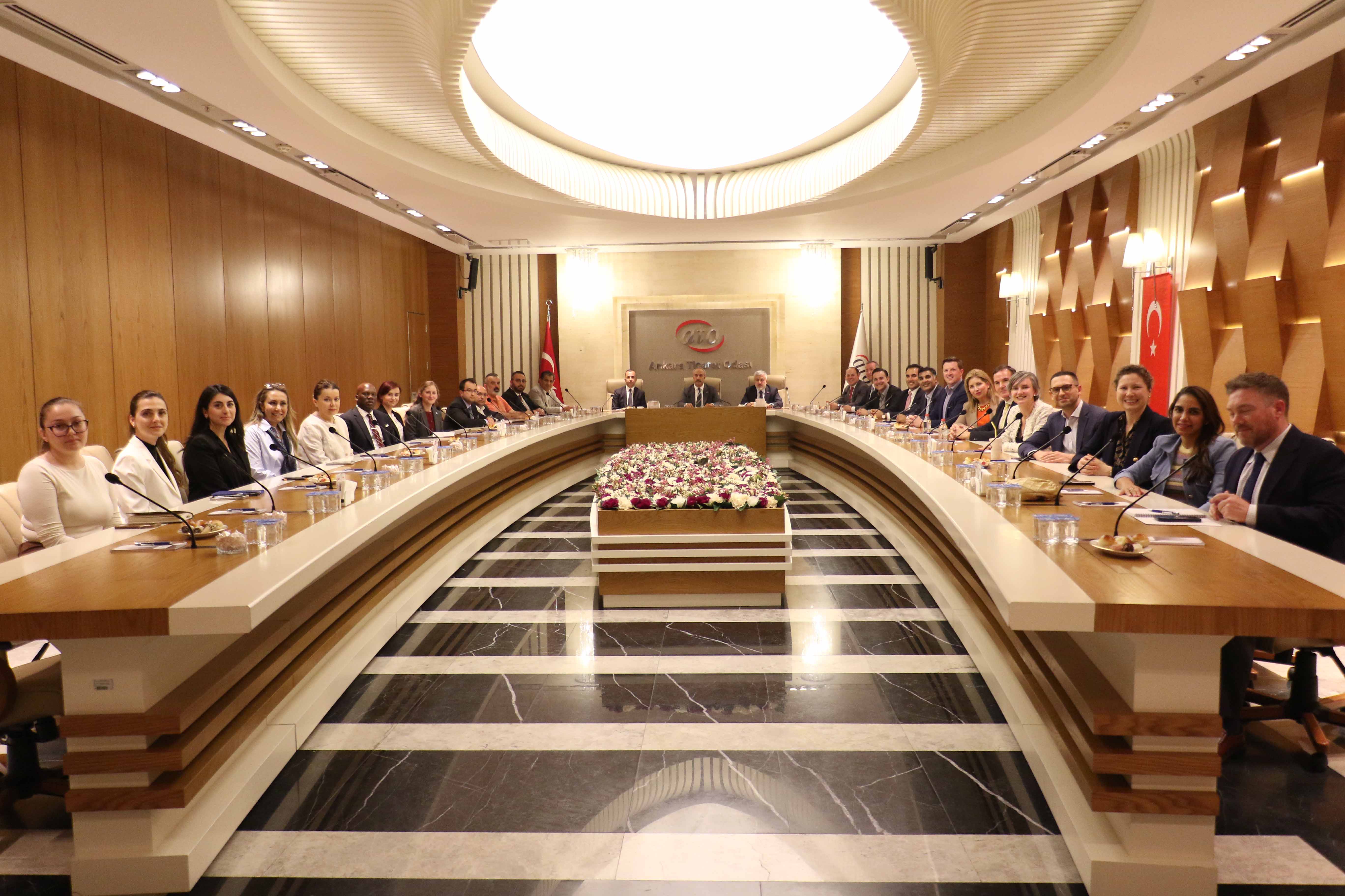 ATO Yönetim Kurulu Üyesi Ali İhsan Güçlü'nün katıldığı toplantıda, medya, enerji, eğitim, bilişim, sağlık ve lojistik gibi farklı sektörlerde faaliyet gösteren Amerikalı yatırımcılara, Ankara'nın sanayi, ticaret, sağlık turizmi ve eğitim alanlarındaki potansiyeli hakkında bilgi verildi. ATO Duatepe Salonu'nda gerçekleşen toplantıda, ATO Genel Sekreter Yardımcısı Abdurrahman Karabudak ile ATO meclis ve komite üyeleri yer aldı.