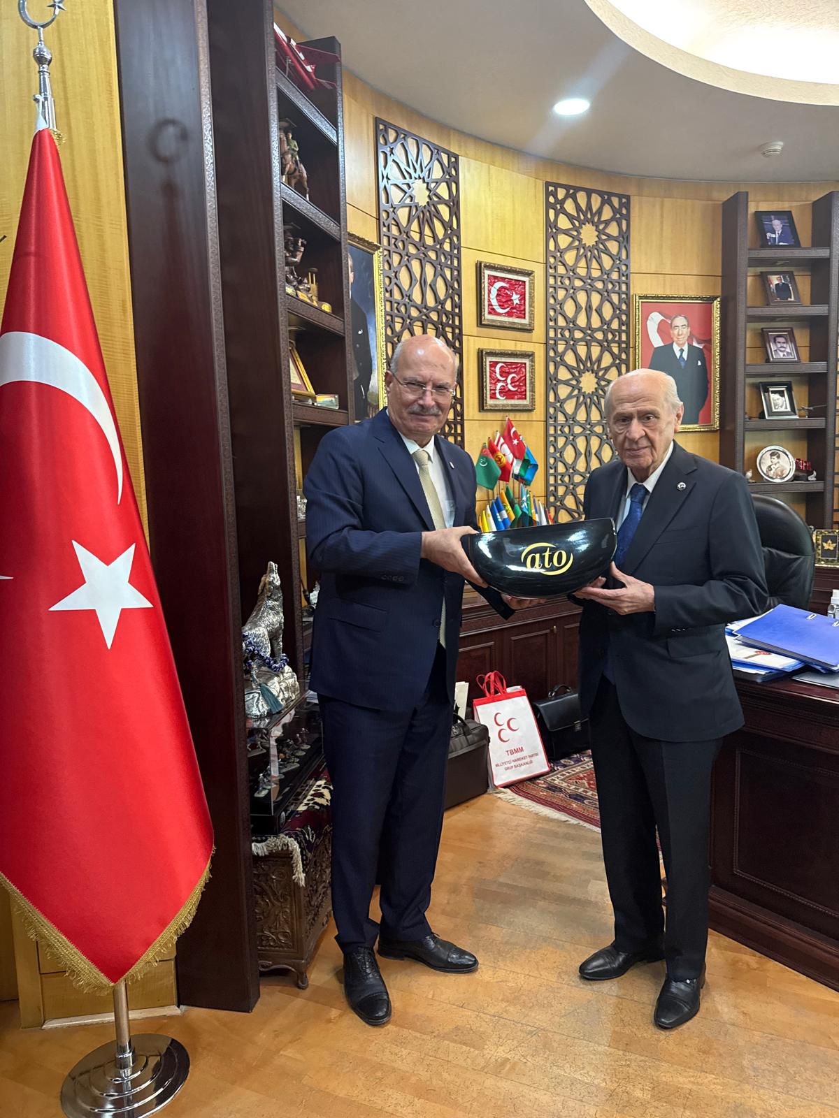 4 Ağustos 2025- Ankara Ticaret Odası (ATO) Yönetim Kurulu Başkanı Gürsel Baran, Milliyetçi Hareket Partisi (MHP) Genel Başkanı Devlet Bahçeli'yi MHP Genel Merkezi'nde ziyaret etti.