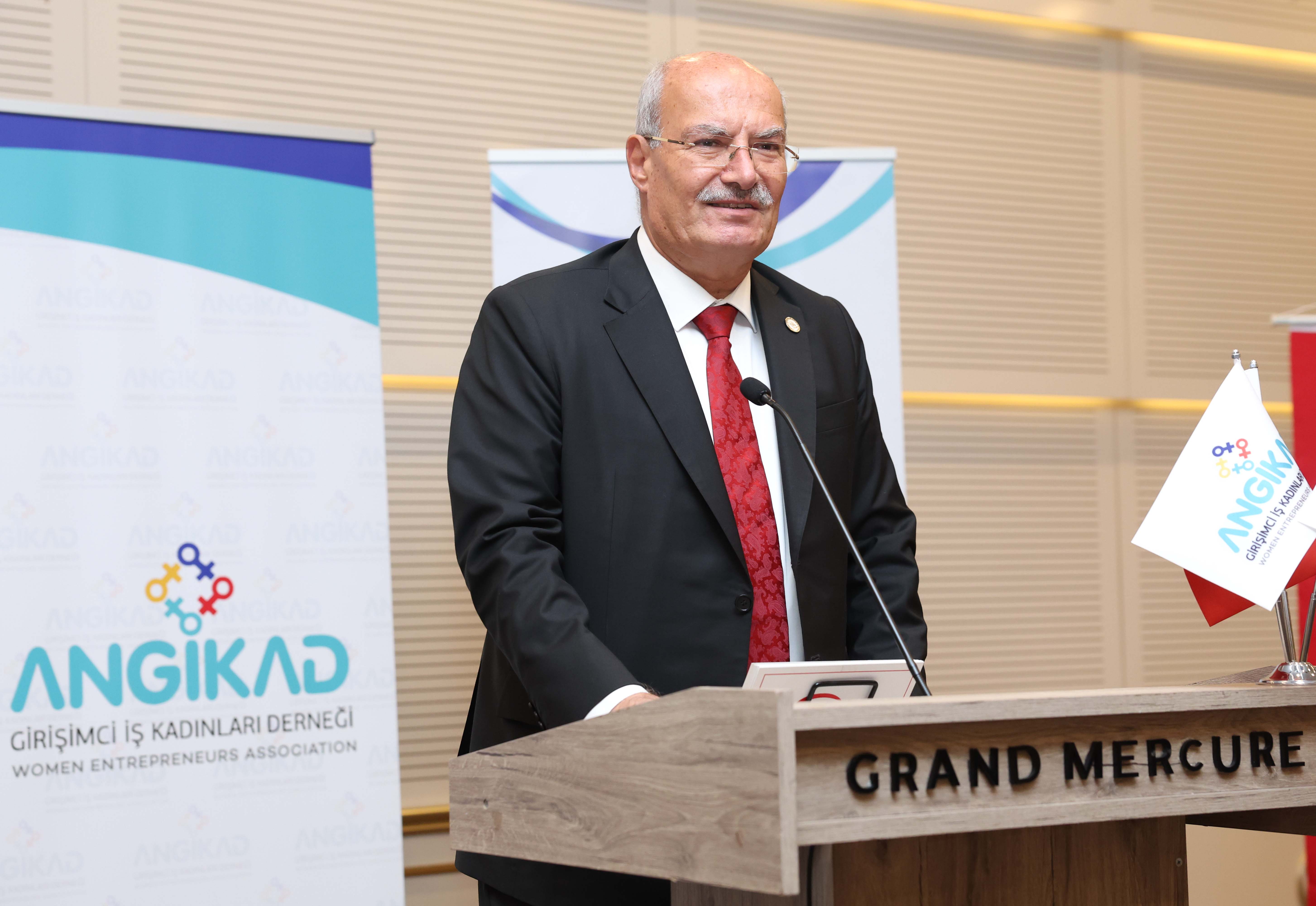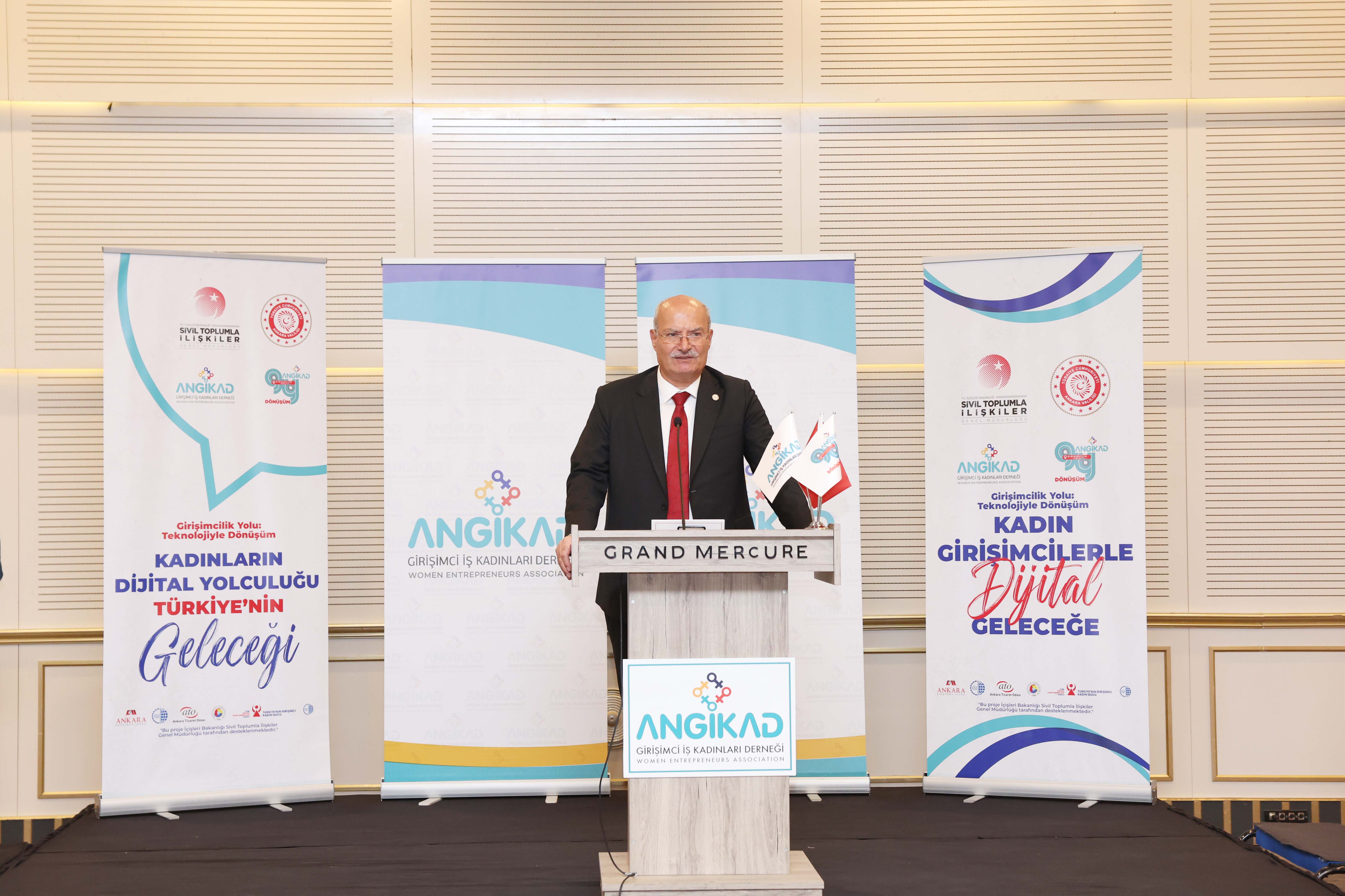 ATO Yönetim Kurulu Başkanı Gürsel Baran, İçişleri Bakanlığı Sivil Toplumla İlişkiler Genel Müdürlüğü'nün destekleriyle, ANGİKAD Girişimci İş Kadınları Derneği tarafından yürütülen "Girişimcilik Yolu: Teknolojiyle Dönüşüm" projesinin tanıtım toplantısına katıldı. 2025 "Aile Yılı" vizyonu doğrultusunda hayata geçirilen ve kadın girişimcileri üniversite öğrencisi gençler ve yeni mezunlarla buluşturan projenin tanıtım toplantısının açılışında Ankara Valisi Vasip Şahin, ATO Başkanı Gürsel Baran ve ANGİKAD Başkanı Gözde Diker birer konuşma yaptı.