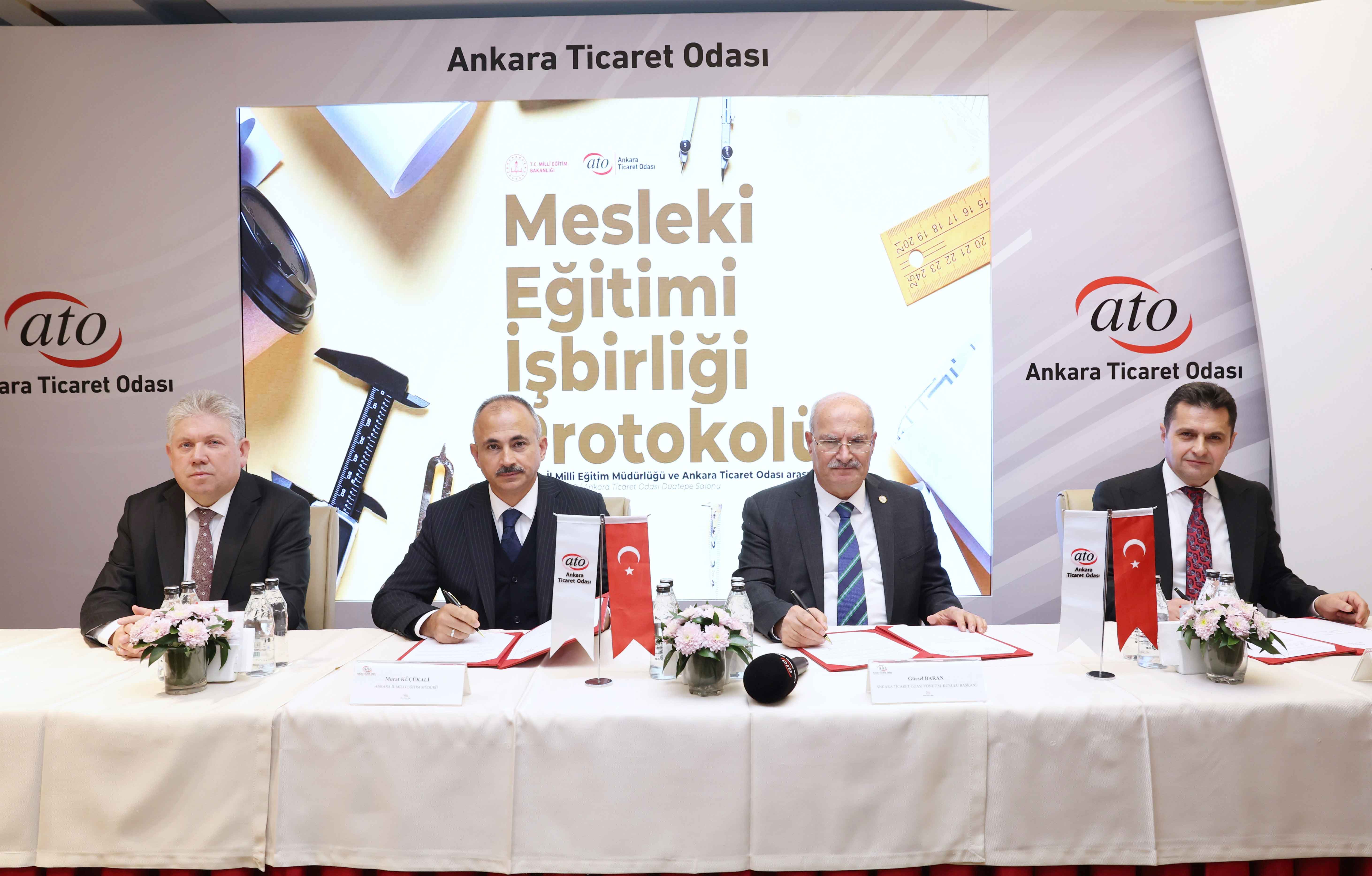 22 Ekim 2025-Ankara Ticaret Odası (ATO) ile Ankara İl Milli Eğitim Müdürlüğü arasında, reel sektörün ihtiyaçlarına uygun nitelikli insan kaynağı yetiştirilmesine yönelik "Mesleki Eğitimin Geliştirilmesi İş Birliği" protokolü ATO Duatepe Salonu'nda düzenlenen törenle imzalandı. Protokole, ATO Yönetim Kurulu Başkanı Gürsel Baran ile Mesleki ve Teknik Eğitim Genel Müdürü Salih Kaygusuz ve Ankara İl Milli Eğitim Müdürü Murat Küçükali imza koydu. Protokol kapsamında, Türkiye'de ilk kez uygulanacak "Mesleki Eğitimde Ankara Modeli"ne start verildi.