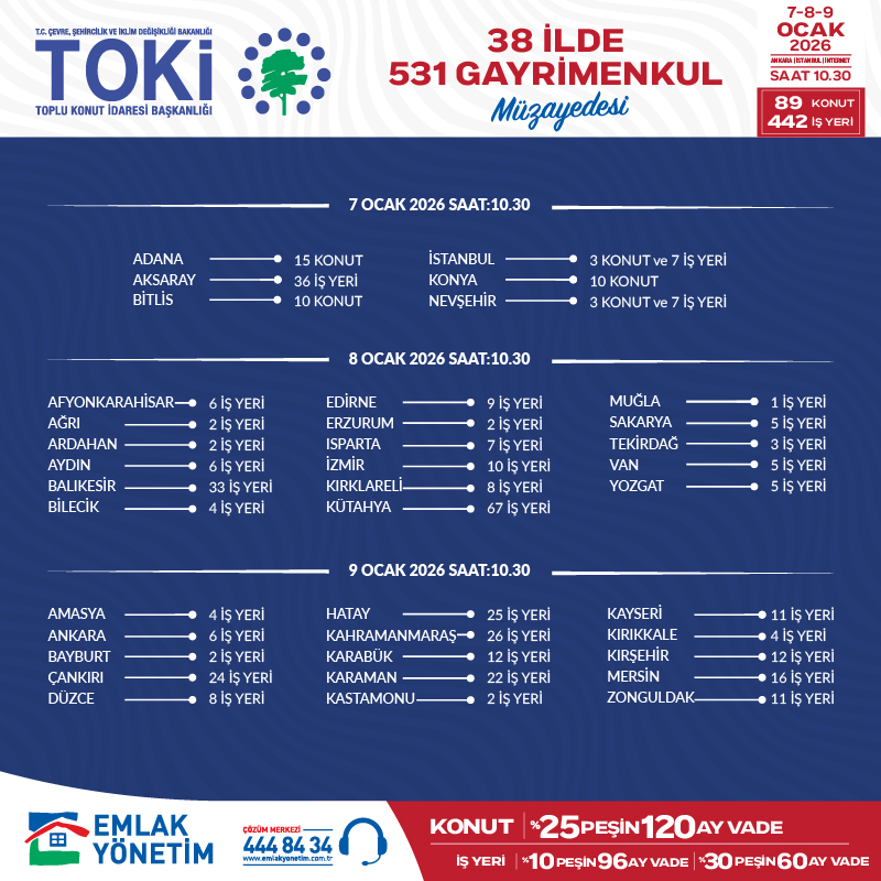Toplu Konut İdaresi Başkanlığı Emlak Yönetim Hizmetleri ve Ticaret A.Ş. Açık Artırma ve İş Geliştirme Müdürlüğü'nün Odamıza ilettiği 19.12.2025 tarihli yazıda; 7-8-9 Ocak 2026 tarihlerinde, 38 ilde toplam 531 adet gayrimenkulün açık artırma yöntemiyle satışa sunulacağı bildirilmektedir.