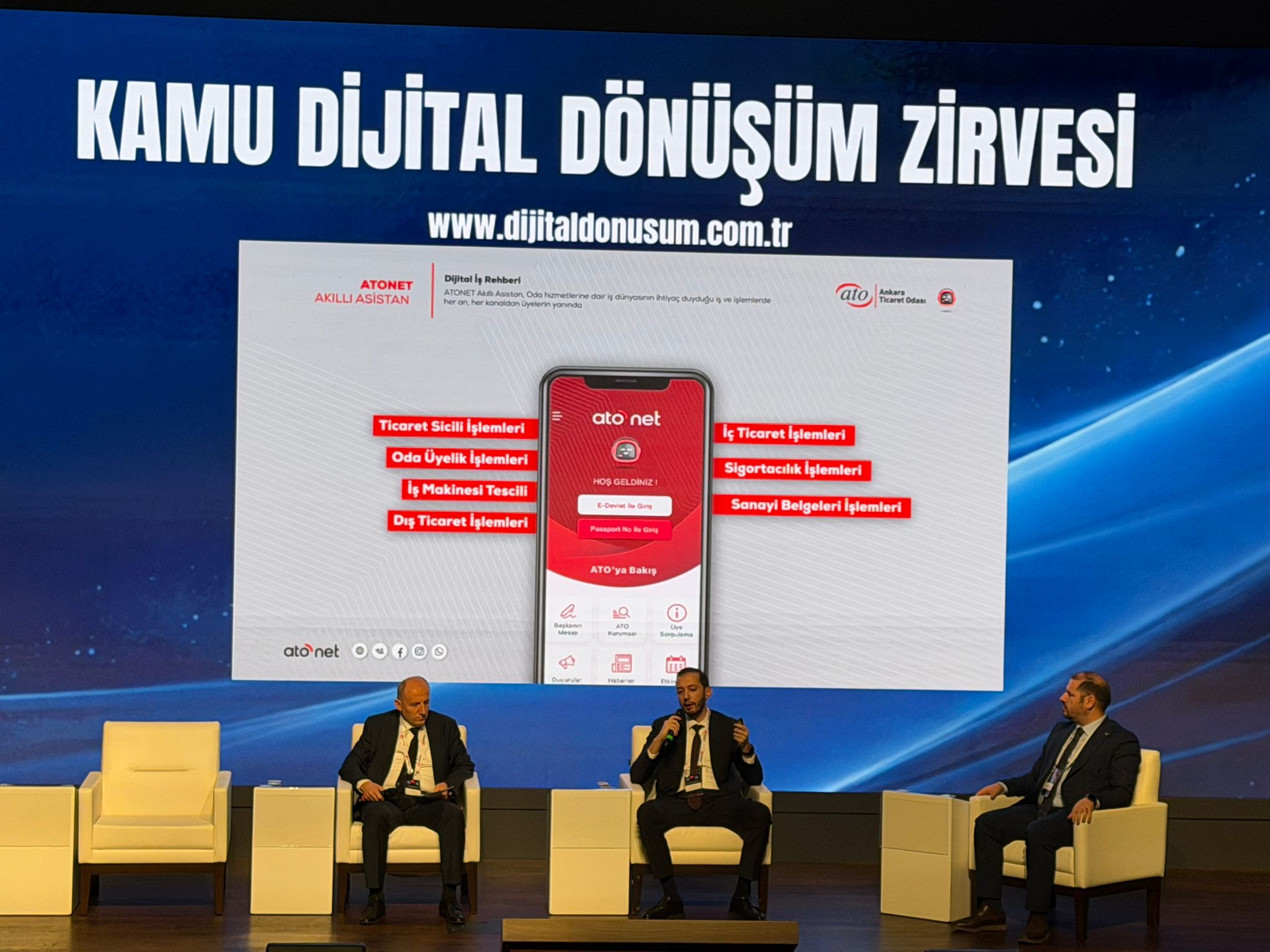 Kamu Dijital Dönüşüm Zirvesi'nin ikinci gününde Doç. Dr. Recep Benzer moderatörlüğünde gerçekleştirilen "Kamuda Dijital Dönüşüm" başlıklı oturumda, ATO'nun Bilgi Teknolojileri ve Sistemleri Müdürü Necip Ceylan, ATONET Akıllı Asistan Projesi'nin uygulama sürecini bir sunumla anlattı.