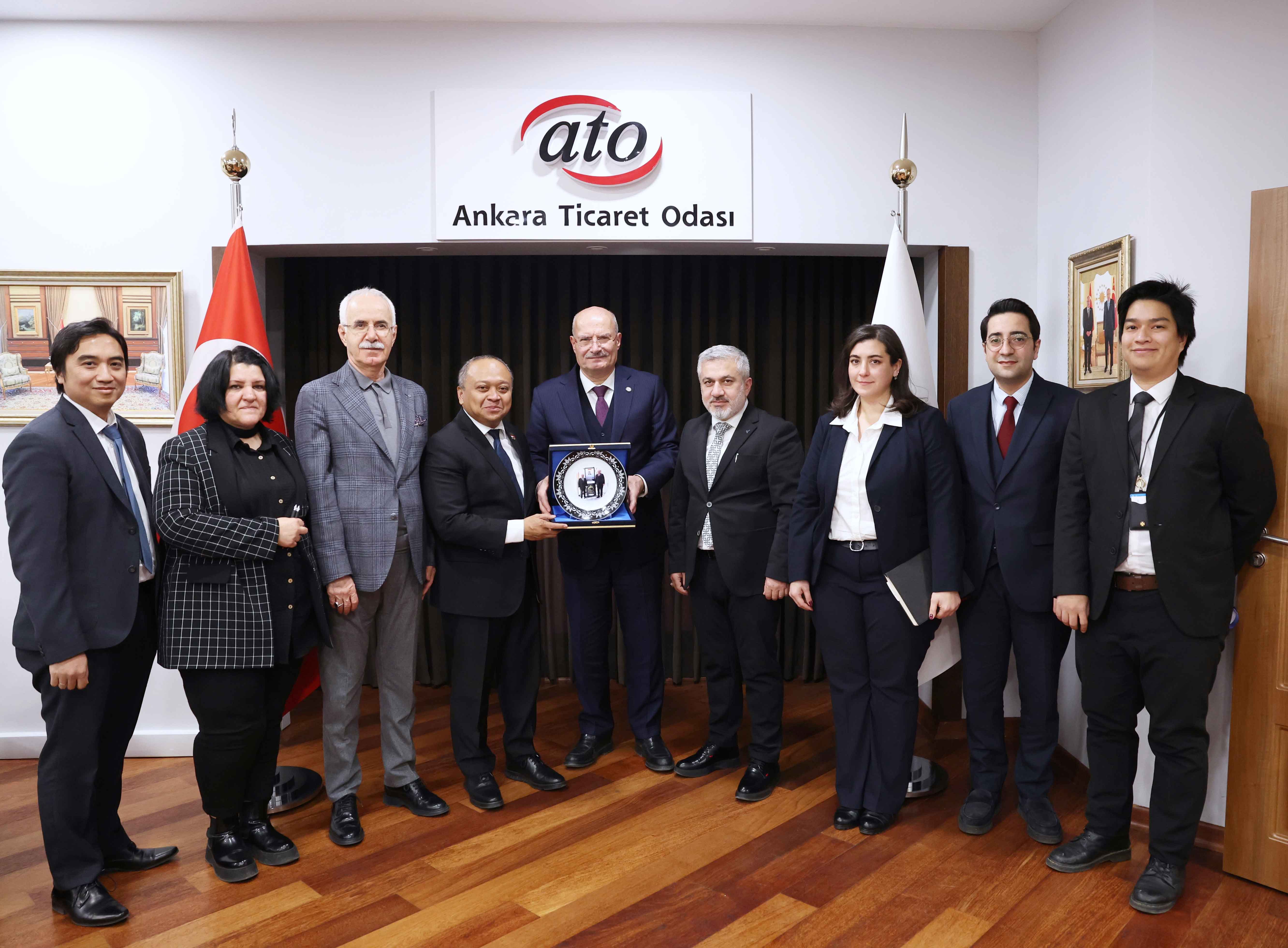 Indonesian Ambassador Achmad Rizal Purnama visited ATO President Gürsel Baran at his office. During the visit, Ambassador Purnama shared information about Indonesia's economy, stating that the country aims to become the fourth-largest economy in the world by 2050. He also provided information about trade between the two countries, noting that Turkey imports rubber from Indonesia and manufactures tires for export to Europe.