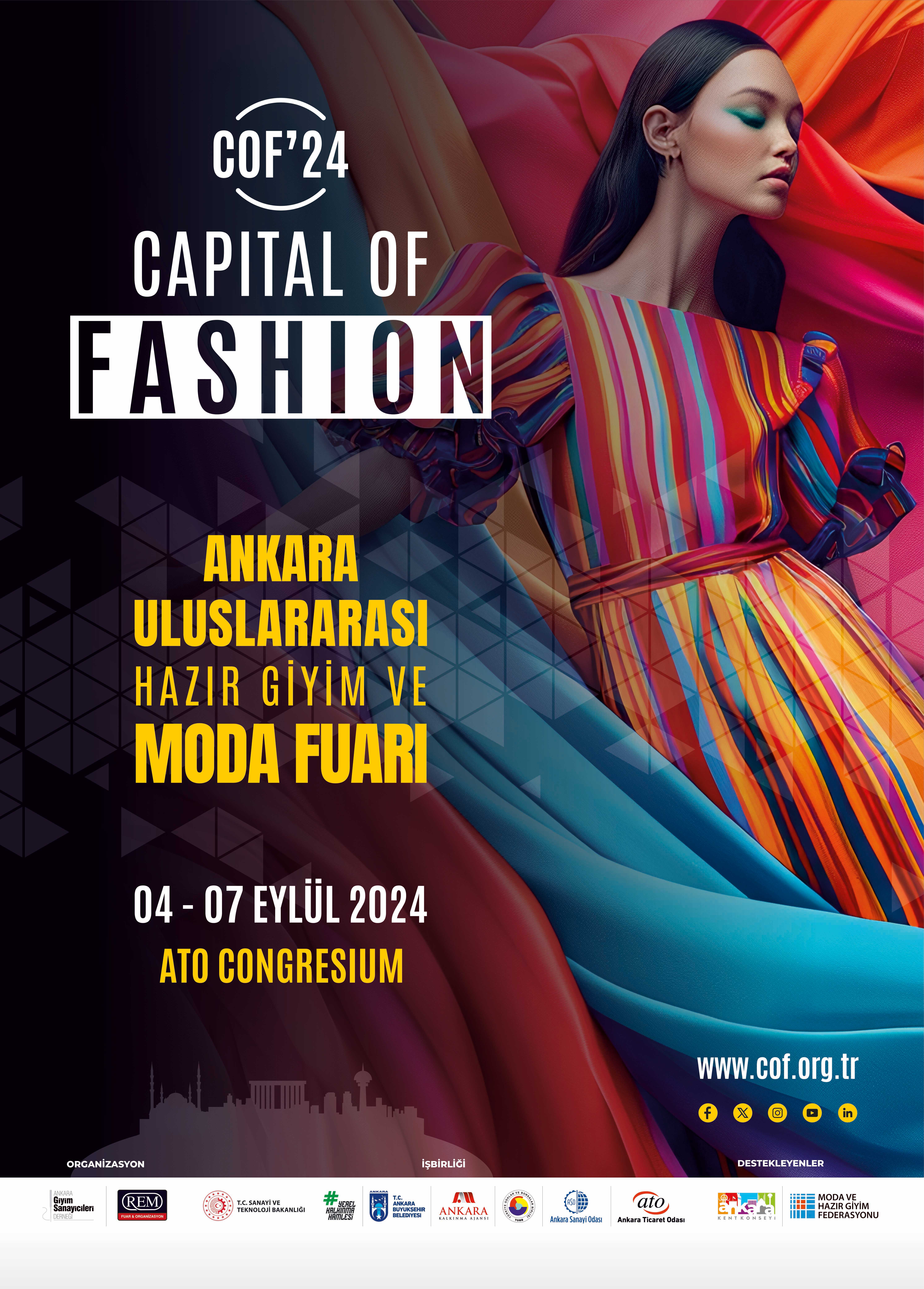 Ankara Ticaret Odası'nın da katkılarıyla, Ankara Giyim Sanayicileri Derneği (AGSD) koordinatörlüğünde, Küçük ve Orta Ölçekli İşletmeleri Geliştirme ve Destekleme İdaresi Başkanlığı (KOSGEB) ve Ankara Kalkınma Ajansı destekleriyle gerçekleştirilecek "Ankara Uluslararası Hazır Giyim ve Moda Fuarı" (Capital of Fashion-COF'24) 4-7 Eylül tarihlerinde ATO Congresium'da hazır giyim ve tekstilde dünyanın önde gelen sektör temsilcileri ve markalarını bir araya getirmeye hazırlanıyor.