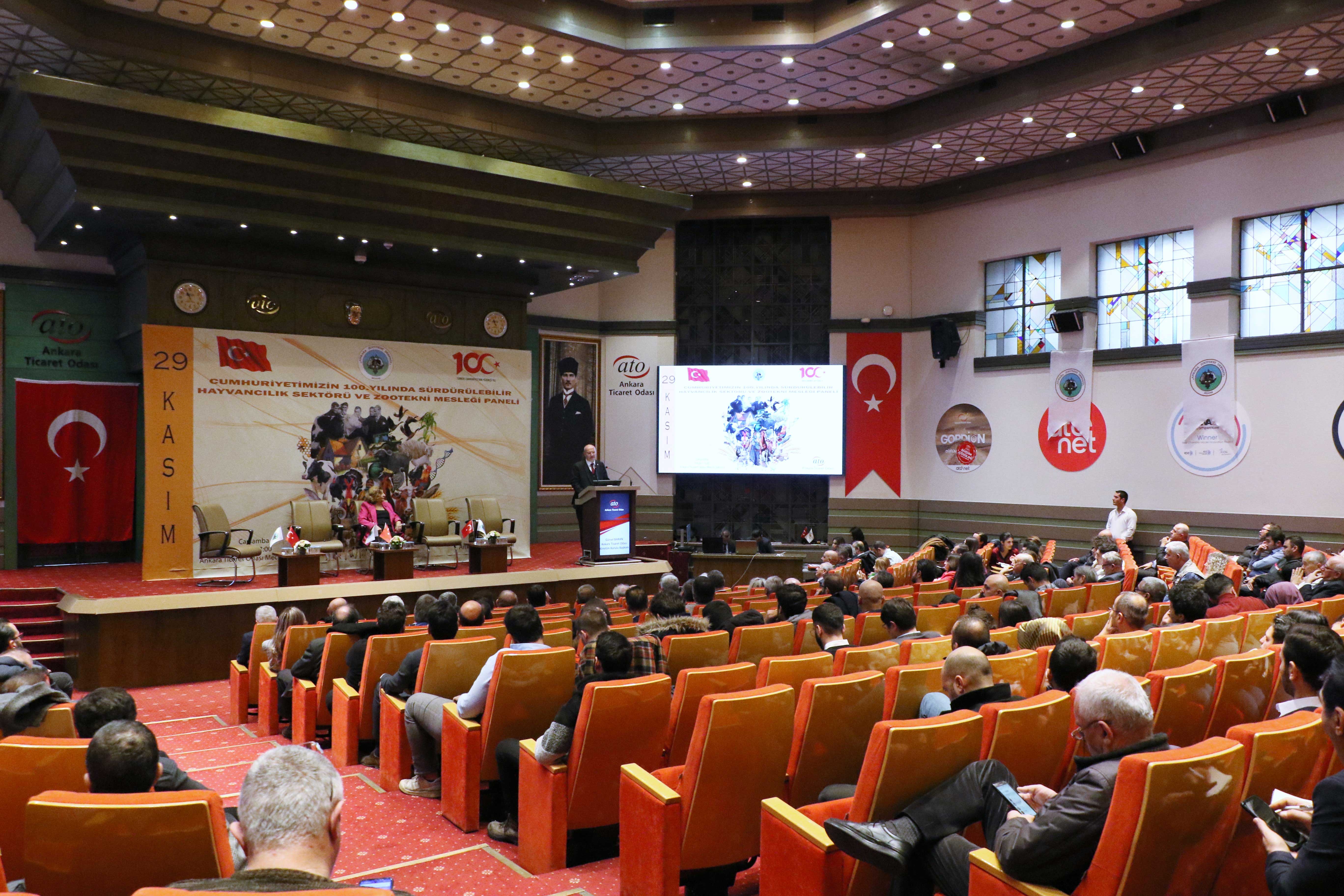 Ankara Ticaret Odası (ATO) Yönetim Kurulu Başkanı Gürsel Baran, Ankara Zootekni Derneği tarafından ATO ev sahipliğinde düzenlenen "Cumhuriyetimizin 100. Yılında Sürdürülebilir Hayvancılık Sektörü ve Zootekni Mesleği Paneli"ne katılarak bir konuşma yaptı. ATO Meclis Salonu'nda yapılan program, Ankara Üniversitesi Ziraat Fakültesi Emekli Öğretim Üyesi ve Bilimsel Tavukçuluk Derneği Başkanı Prof. Dr. Rüveyde Akbay'ın açılış konuşması ile başladı. Akbay'ın moderatörlüğünde devam eden açılış oturumunda konuşan ATO Başkanı Gürsel Baran, tarım ve hayvancılık sektörlerinin insanlık için stratejik sektörler olduğunu belirterek, "Tarım ve hayvancılık, bugünün dünyasında ekonomik bağımsızlığı sürdürmenin temel unsurlarından biri" dedi.