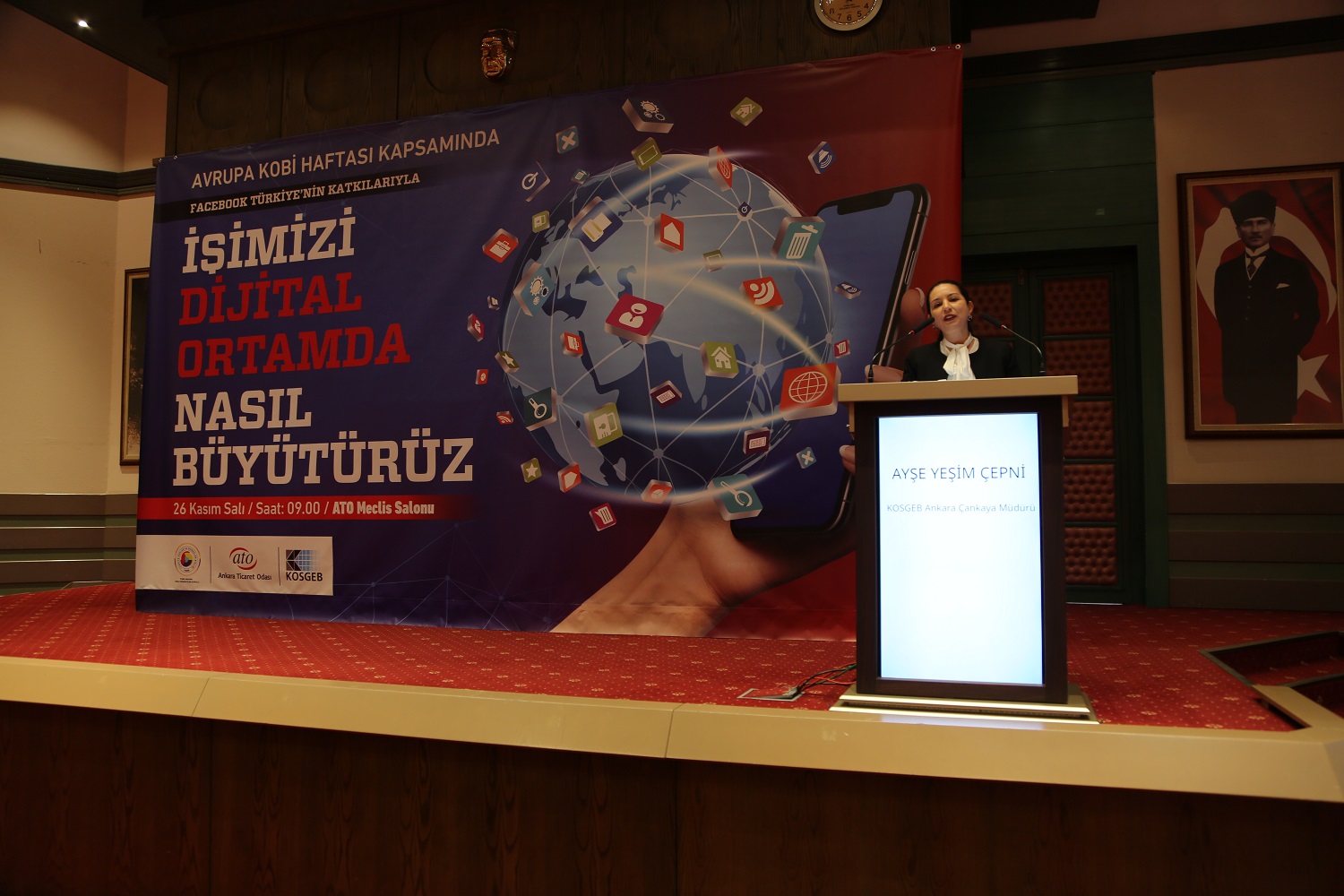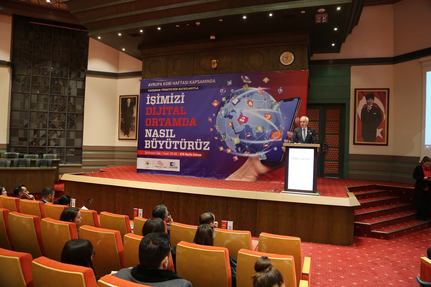 26 KASIM 2019 - Ankara Ticaret Odası (ATO), 23-29 Kasım Avrupa Kobi Haftası'nda TOBB Ankara Genç Girişimciler Kurulu ve Facebook Türkiye'nin katkılarıyla düzenlenen "İşimizi Dijital Ortamda Nasıl Büyütürüz" programına ev sahipliği yaptı. Küçük ve Orta Ölçekli İşletmeleri Geliştirme ve Destekleme İdaresi Başkanlığı (KOSGEB) ve sosyal medya uzmanları tarafından yapılan sunumlarda girişimcilere dijital ortamda işlerini geliştirebilmeleri için bilgiler verilen programın açılışı ATO Yönetim Kurulu Başkan Yardımcısı Temel Aktay tarafından yapıldı.