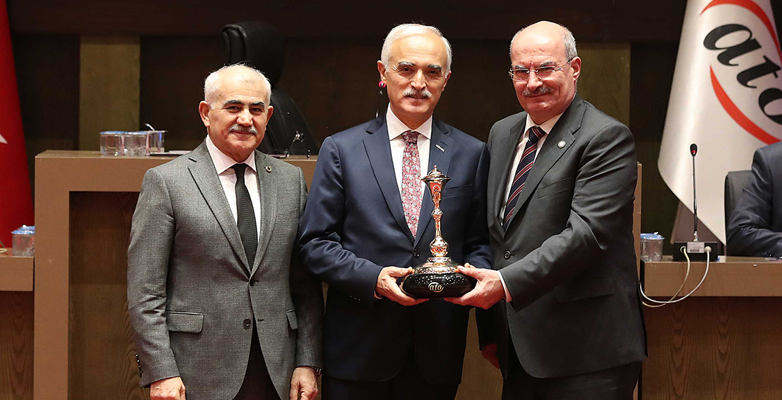 Konuşmaların ardından ATO Başkanı Baran ve Meclis Başkanı Deryal, DEİK Başkanı Nail Olpak'a günün anısına bir hatıra objesi armağan etti.