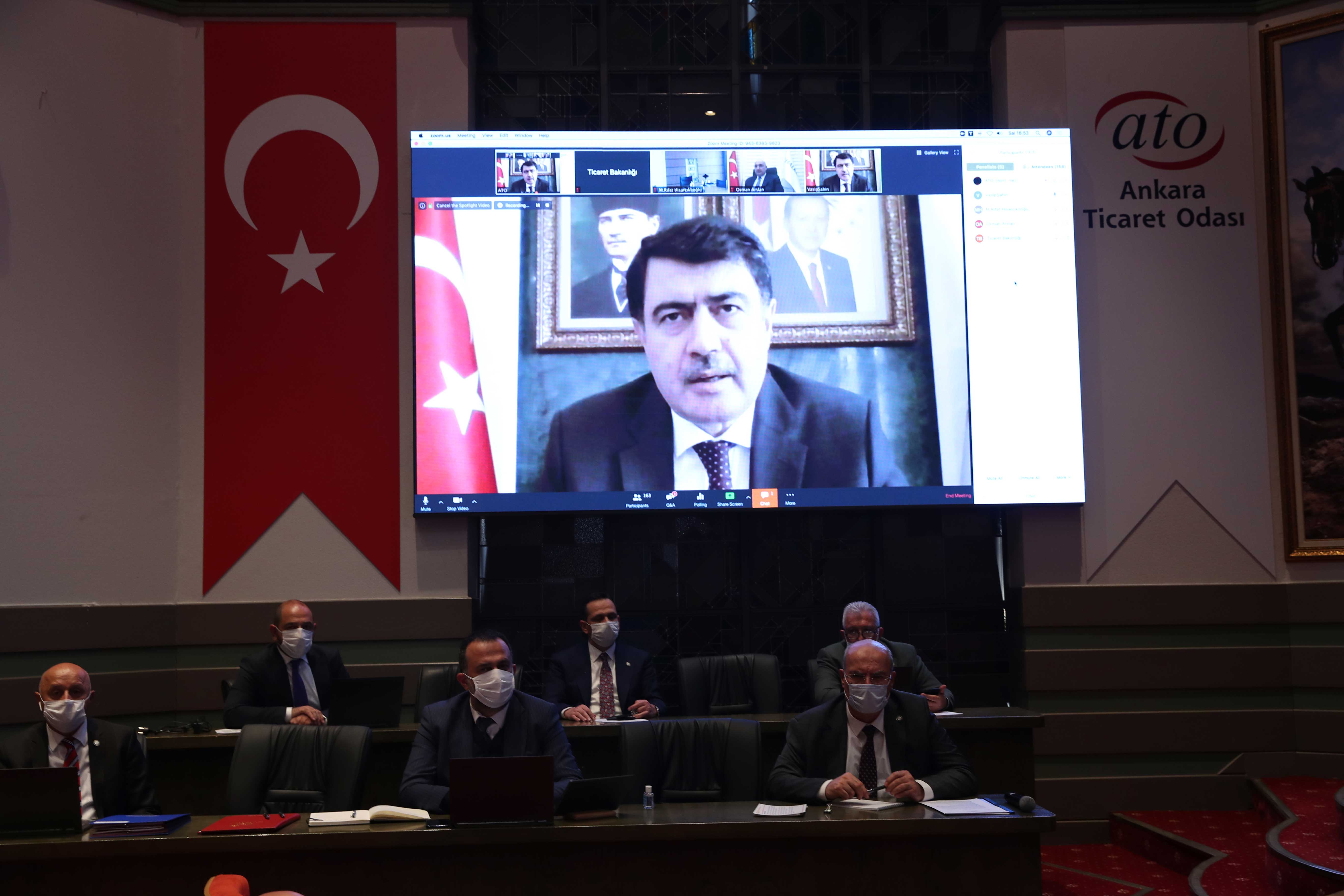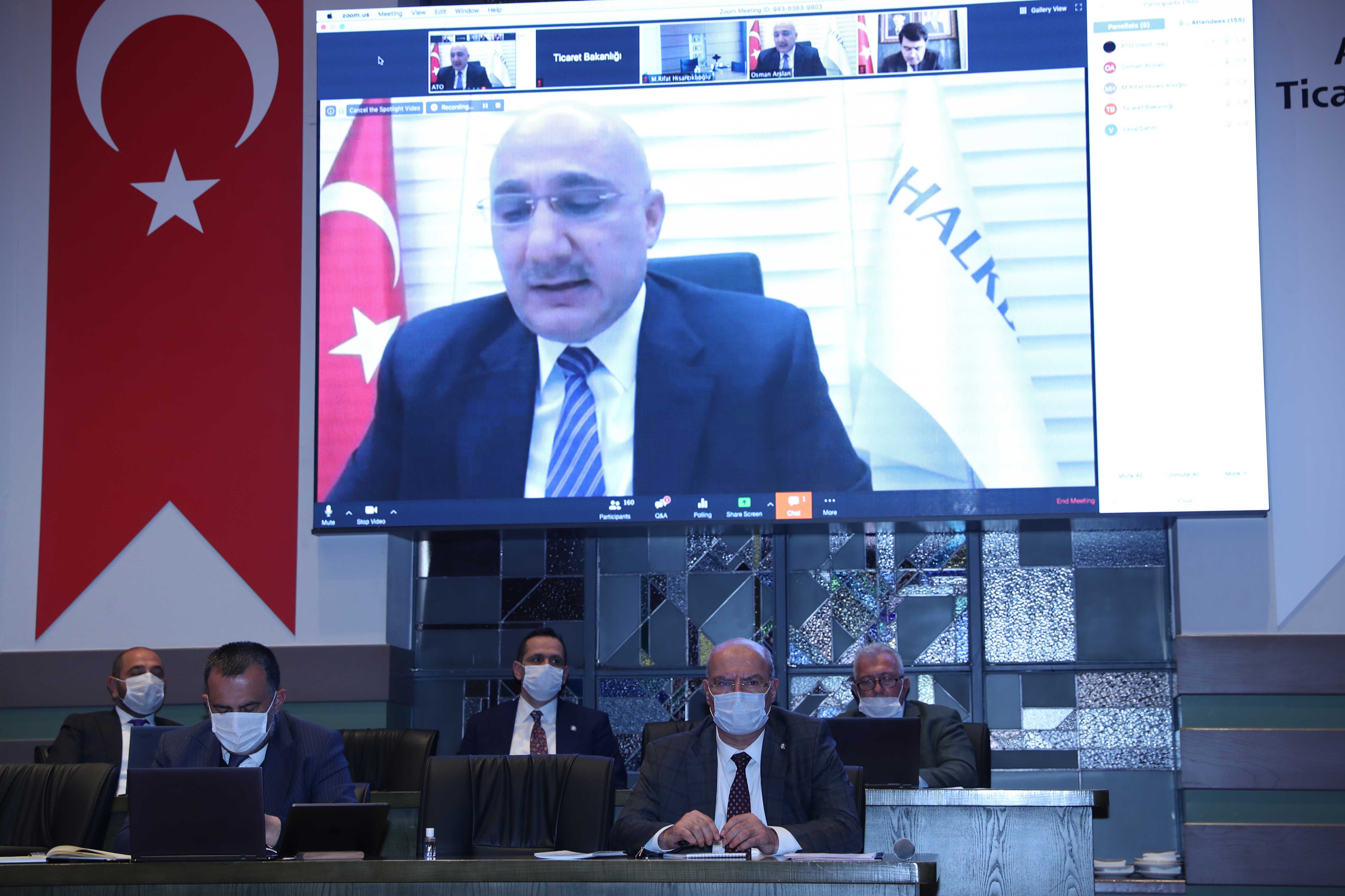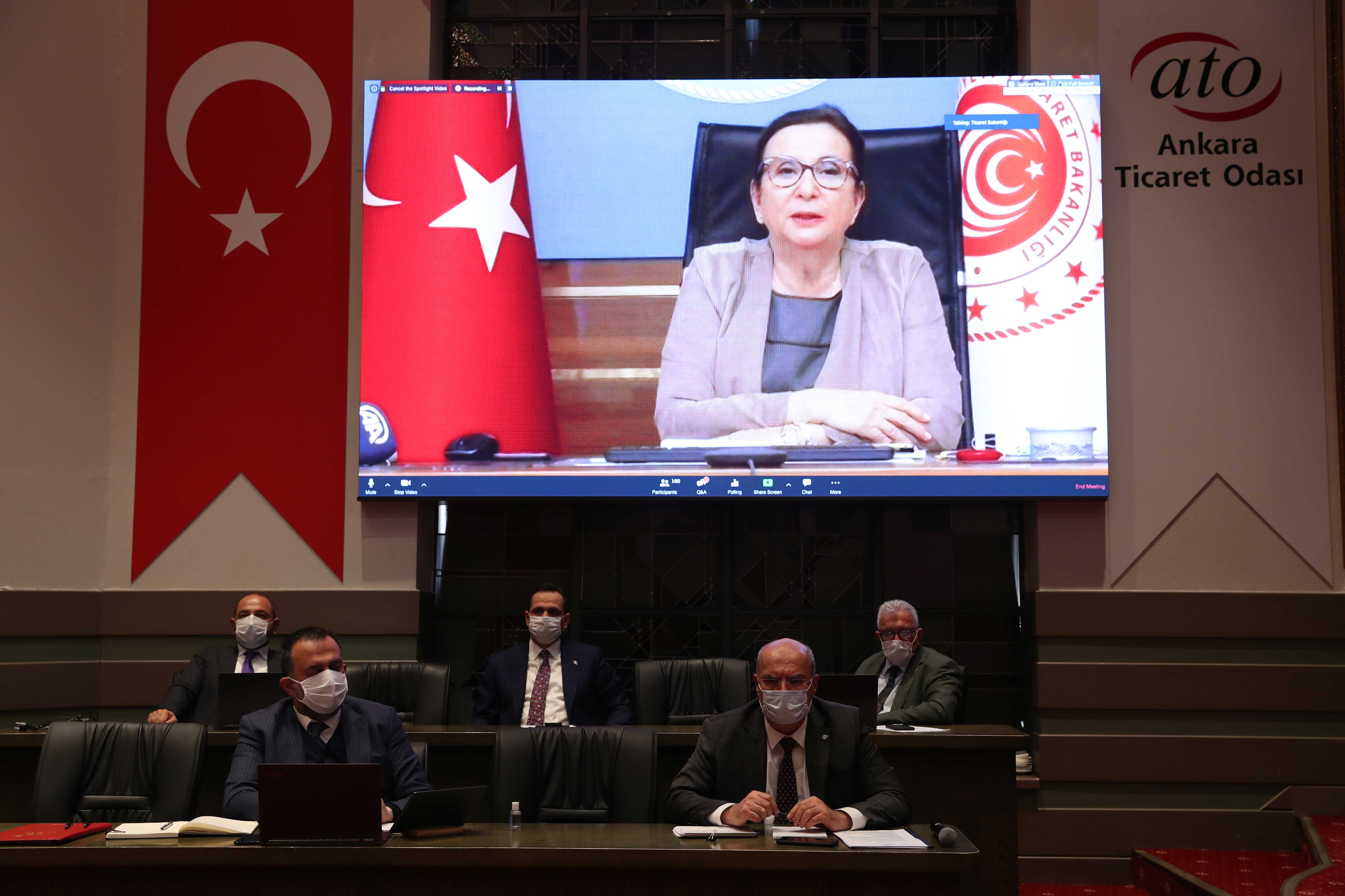 Ticaret Bakanı Ruhsar Pekcan, video konferans yoluyla katıldığı toplantıda yaptığı konuşmasında, salgın sürecinin Türkiye olarak çok iyi yönetildiğini ve bu süreçte dayanışma ruhunun pekiştirildiğini söyledi. İş dünyasının yanında olmak için ellerinden gelen gayreti gösterdiklerini, sivil toplum kuruluşları ile sürekli istişare halinde olduklarını ve ATO tarafından iletilen bütün talepleri TOBB kanalıyla aldıklarını belirten Pekcan, "Bakanlıklarla birlikte koordine çalışarak taleplerin yerine gelmesi için çalışıyoruz. Bu pandemiden çıkış sürecinde son derece enerjik, dinamik ve bir arada bütün dünyaya ihracatımızı yayacağımız bir Türkiye'ye ulaşmayı bekliyoruz" dedi.