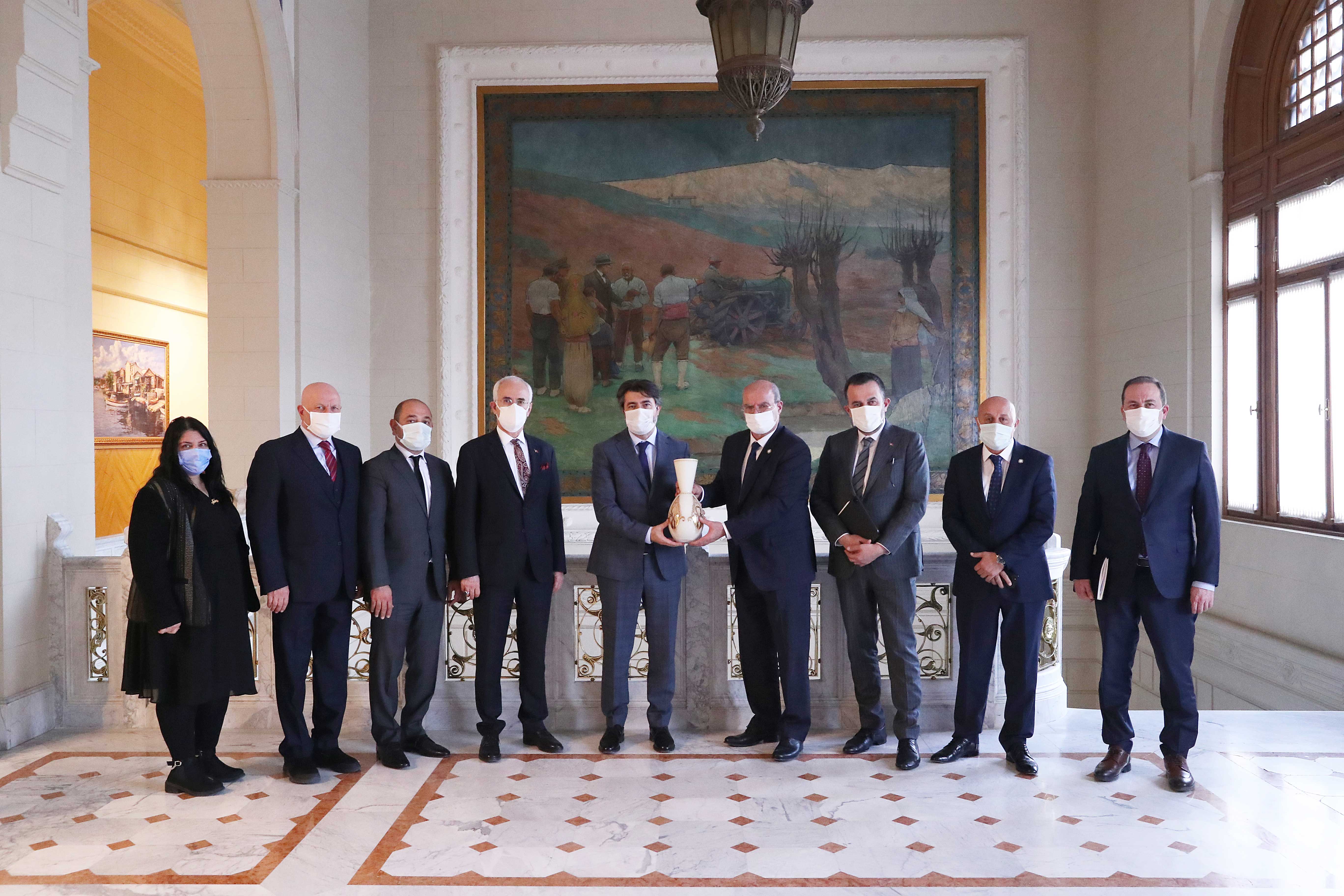 ATO Başkanı Gürsel Baran'a ziyaretinde, ATO Başkan Yardımcıları Temel Aktay ve Halil İbrahim Yılmaz, ATO Yönetim Kurulu Sayman Üyesi Murat Ülkü Karakuş, Yönetim Kurulu Üyeleri Nuh Acar ve Halil İlik eşlik etti.