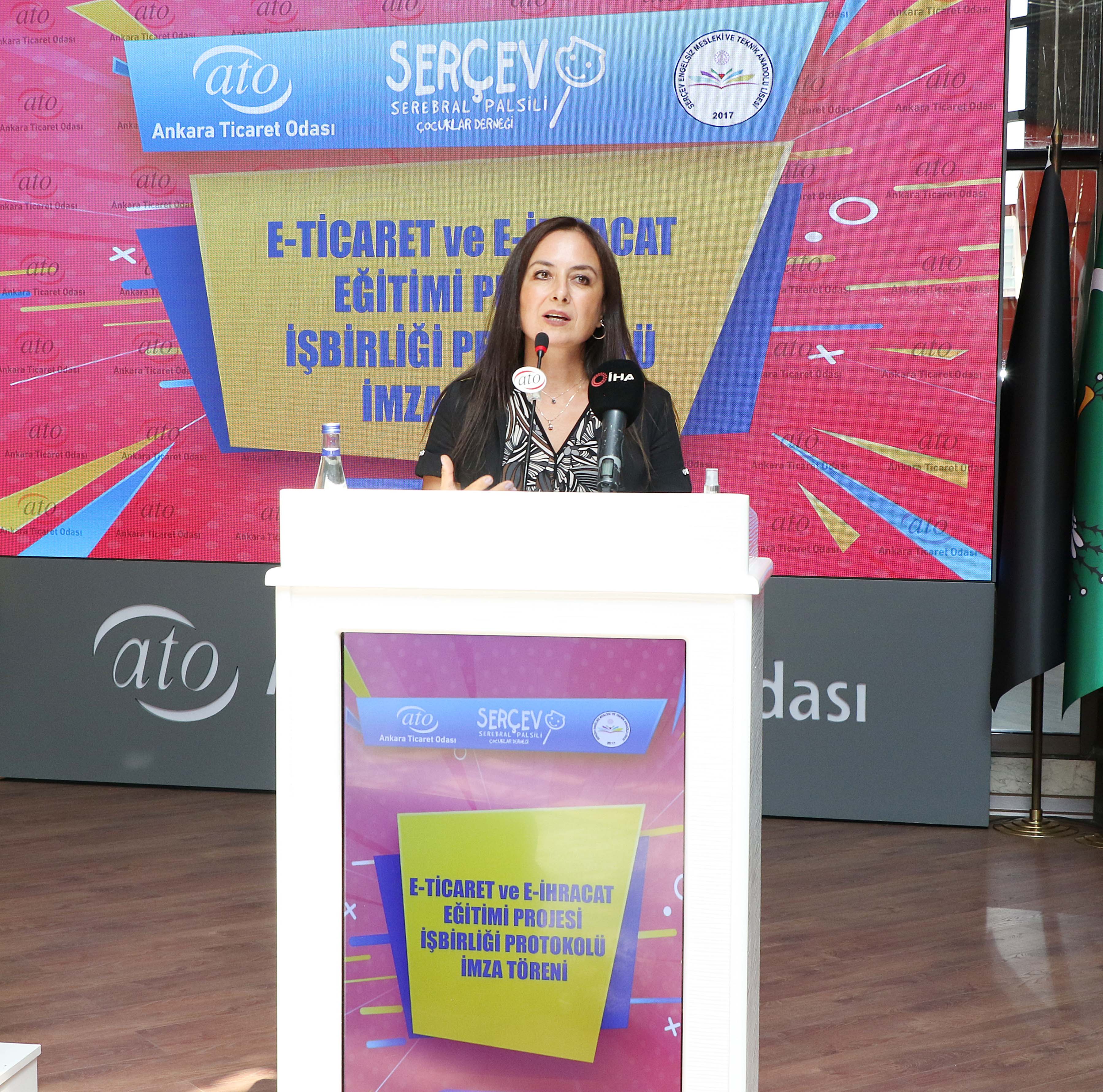 "E-Ticaret ve E-İhracat Eğitimi Projesi" ATO Hizmet Binası Fuaye Alanı'nda gerçekleştirilen iş birliği protokolü imza töreniyle start aldı. Protokole Ankara Ticaret Odası adına Yönetim Kurulu Başkanı Gürsel Baran, SERÇEV adına Yönetim Kurulu Başkanı Turgay Karakaş ve SERÇEV Engelsiz Mesleki ve Teknik Anadolu Lisesi Dilek Saran imza koydu.