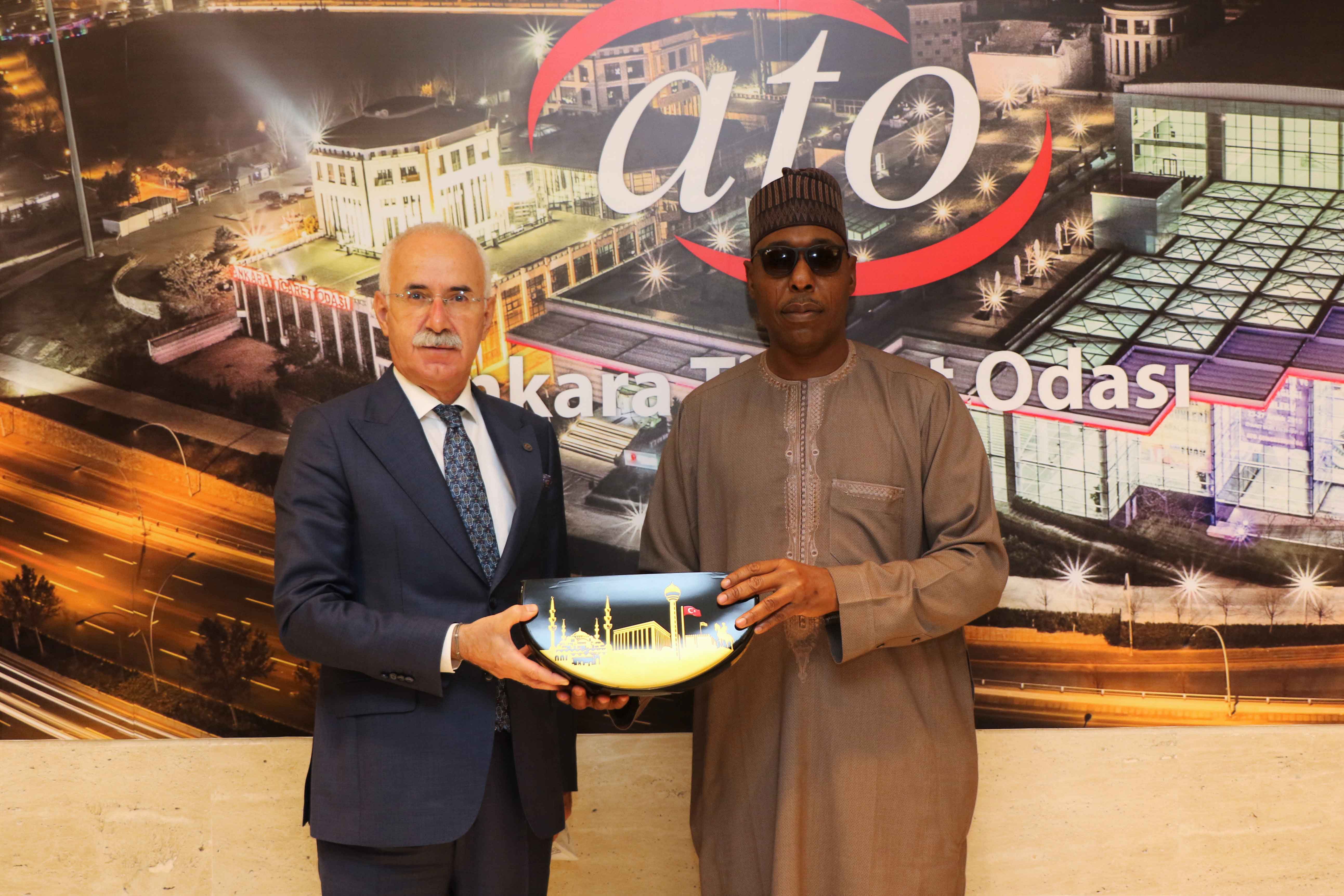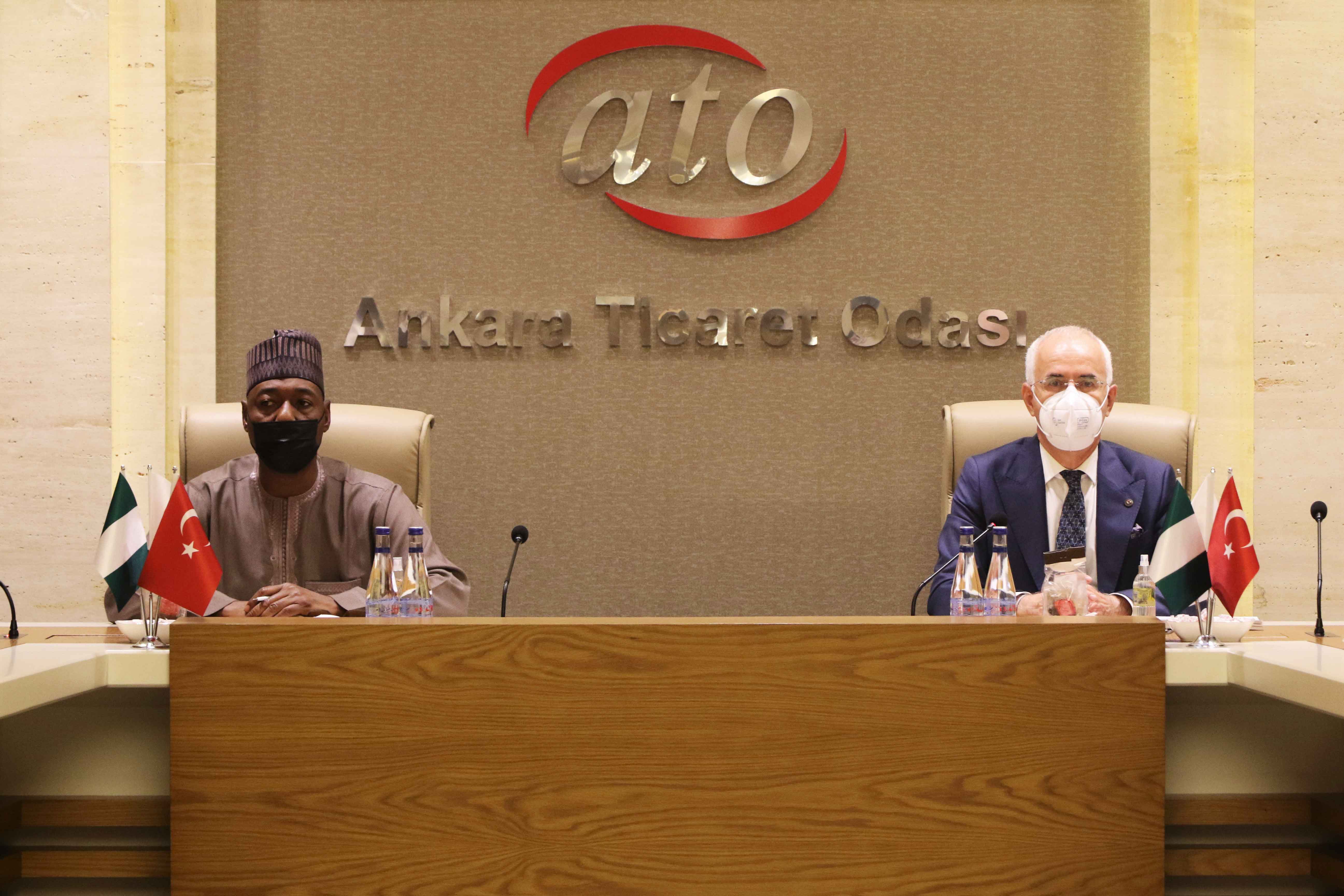 Nijerya'nın Borno Eyalet Valisi Babagana Umara ile Nijerya Borno Eyaleti Yatırım Bakanı Yerima Lawan Kareto ve Milletvekili Baba Mala Bukar, ATO Başkan Yardımcısı Temel Aktay'ı ziyaret etti. ATO Duatepe Hizmet Binası'nda gerçekleşen ziyarette konuşan Aktay, Ankara'nın Nijerya'ya ihracatının 2019 yılında 27 milyon dolardan, koronavirüs salgınının dünya ticareti üzerindeki olumsuz etkilerine rağmen 2020 yılında 33,7 milyon dolara yükseldiğini belirterek "Ankara Ticaret Odası olarak Nijerya'nın ülkemiz ve Başkentimiz ile ticaretini daha yukarılara taşıma gayretindeyiz" dedi.