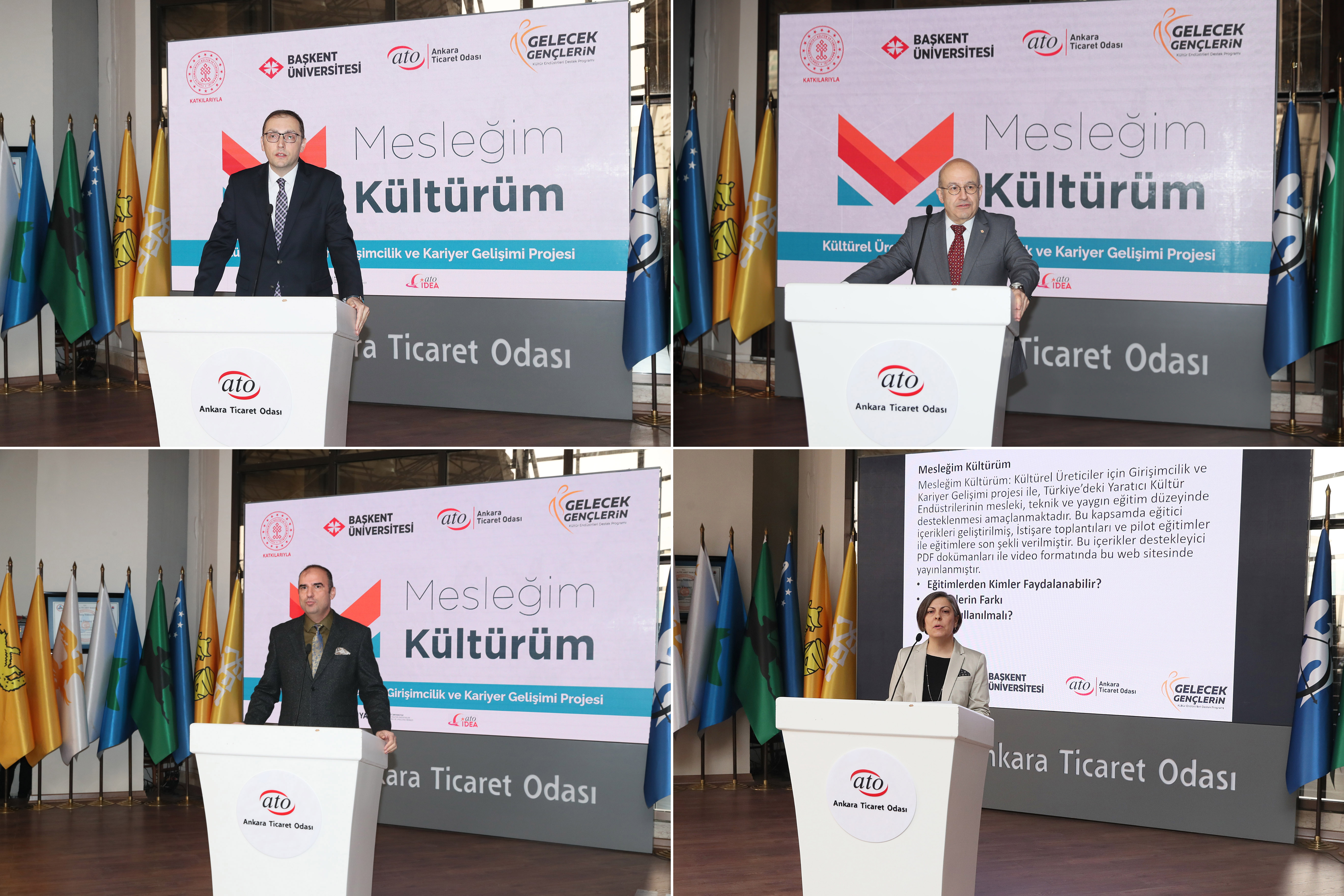 Başkent Üniversitesi Rektörü Prof. Dr. İ. Haldun Müderrisoğlu da yaptığı konuşmada, kapanış toplantısının bir sonuç değil mesleki ve teknik eğitimde dijitalleşen dünyanın temposuna ayak uydurma yolunda bir başlangıç olduğunu söyledi. Müderrisoğlu, Mesleğim Kültürüm projesinin mesleki eğitime yaratıcı ekonomi bakış açısını tanıtan ilk proje olduğunu belirterek, "Proje ile mesleki ve teknik eğitim alanında Türkiye'nin yaptığı atılıma ivme kazandırmayı, yüz binlerce kıymetli eğitmen ve öğretmenin öğrettiği sanat ve zanaata değer katmayı amaçlıyoruz. Kültür ve Turizm Bakanlığı himayesinde ATO'nun katkılarıyla yürüttüğümüz bu projenin Türkiye'de yaratıcı endüstrilerin geliştirilmesi ve küresel pazarda yer edinmesi için niş bir alandaki ilk adım olduğunun bilincindeyiz. Sizlerin desteği ve teveccühü Başkent Üniversitesi YEKAM'ın bu konuda daha fazla çaba göstermesi için umut kaynağıdır" dedi.