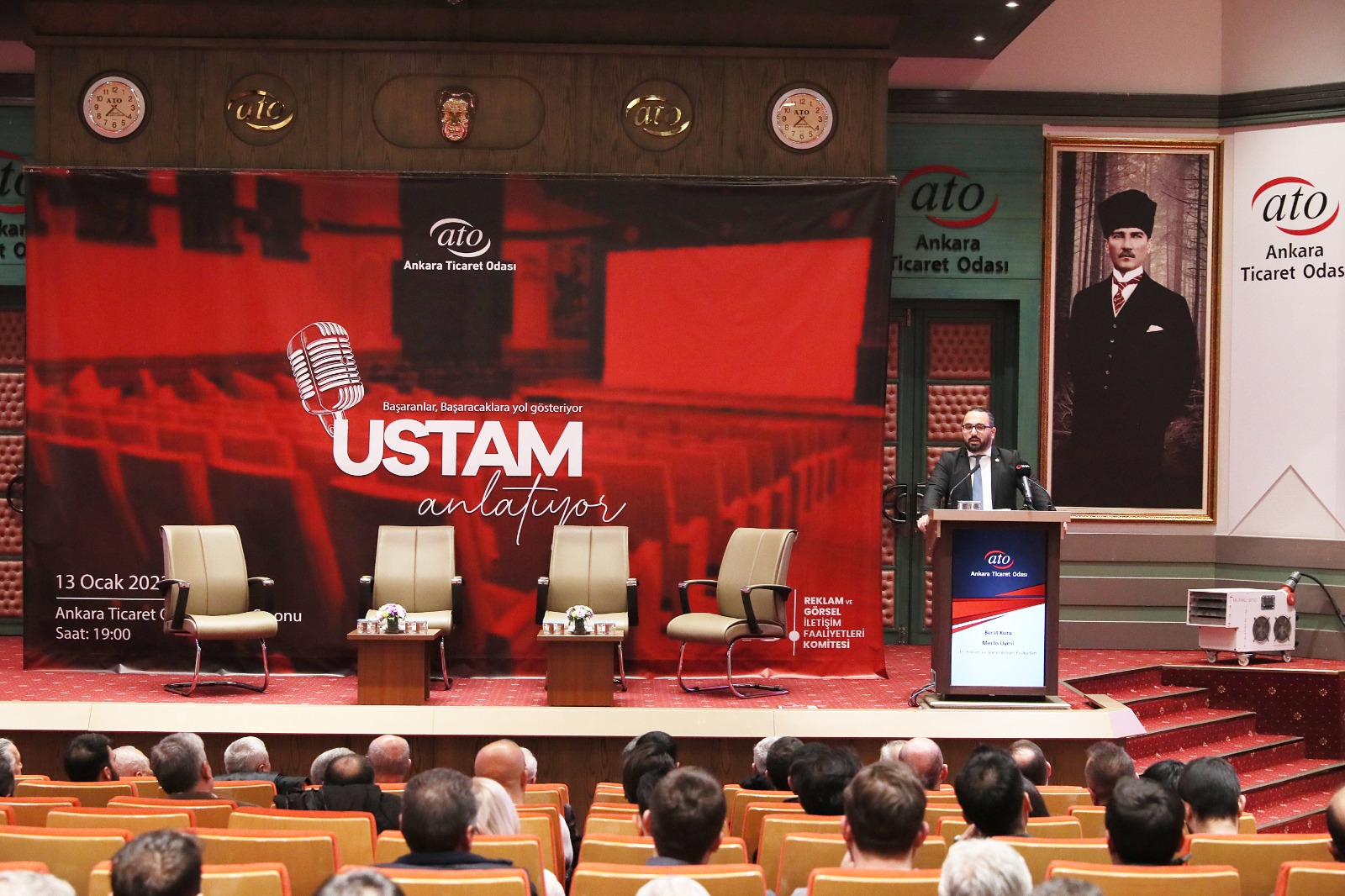 ATO'nun 13 No'lu Reklam ve Görsel İletişim Faaliyetleri Meslek Komitesi tarafından organize edilen "Ustam Anlatıyor" etkinliği ile sektörün duayenleri, sektörün geleceği olan temsilcilere bilgi birikim ve deneyimlerini aktardı. 13 No'lu Reklam ve Görsel İletişim Faaliyetleri Meslek Komitesi Başkanı Derya Filiz Dalga'nın sunumuyla ATO Meclis Salonu'nda yapılan etkinlik, ATO Yönetim Kurulu Başkanı Gürsel Baran, ATO Meclis Başkanı Mustafa Deryal ile ATO 13 No'lu Reklam ve Görsel İletişim Faaliyetleri Meslek Komitesi Meclis Üyesi Berat Kuzu'nun açılış konuşmalarıyla başladı.
