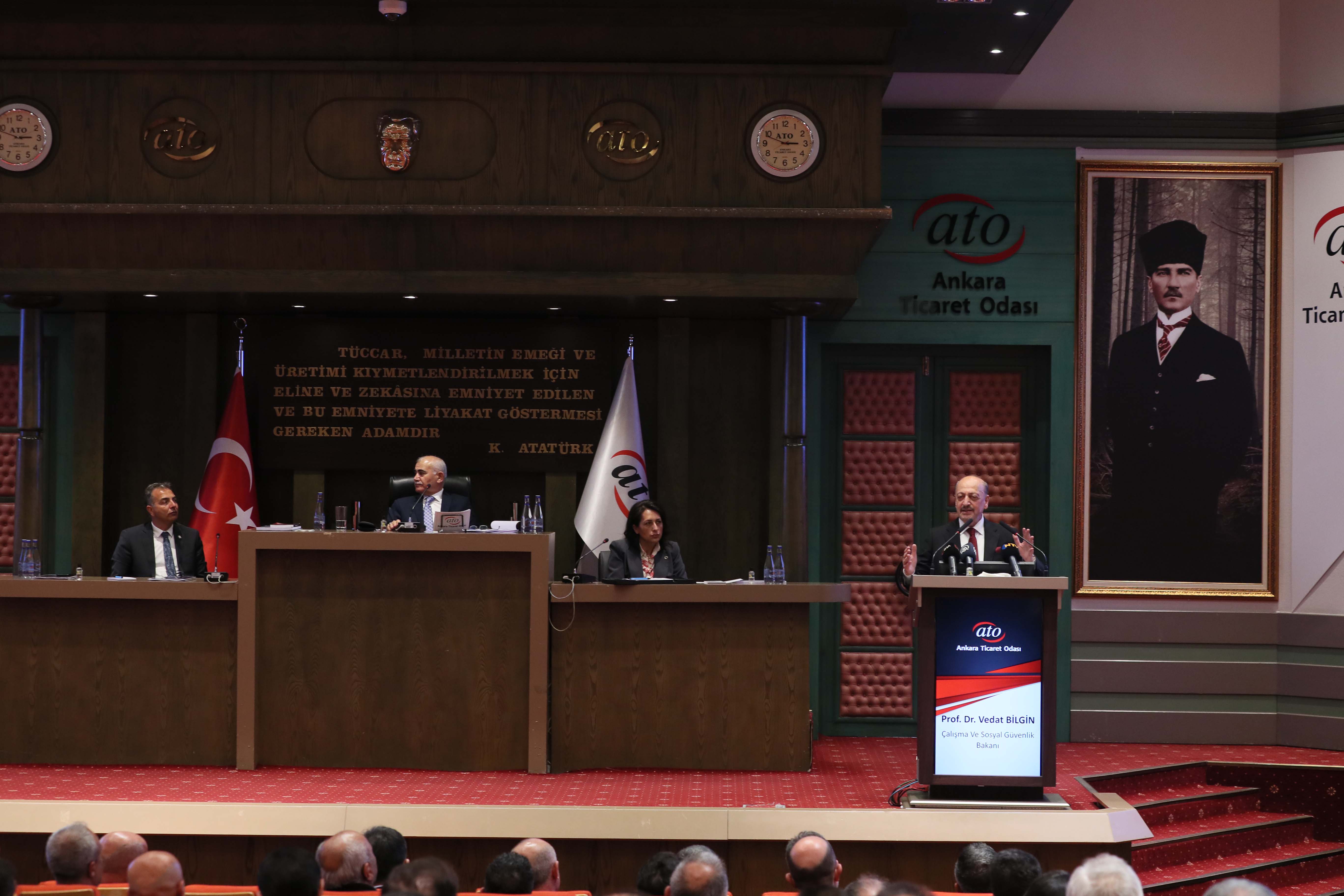 Çalışma ve Sosyal Güvenlik Bakanı Vedat Bilgin, Ankara Ticaret Odası'nın (ATO) 29. Dönem 6. Olağan Meclis Toplantısı'na katılarak Meclis Üyelerine hitap etti. ATO Meclis Salonu'nda gerçekleşen ve ATO Yönetim Kurulu Başkanı Gürsel Baran ile ATO Meclis Başkanı Mustafa Deryal'in açılış konuşmalarını yaptığı toplantıya, ATO Yönetim Kurulu ve Meclis Üyeleri katıldı.