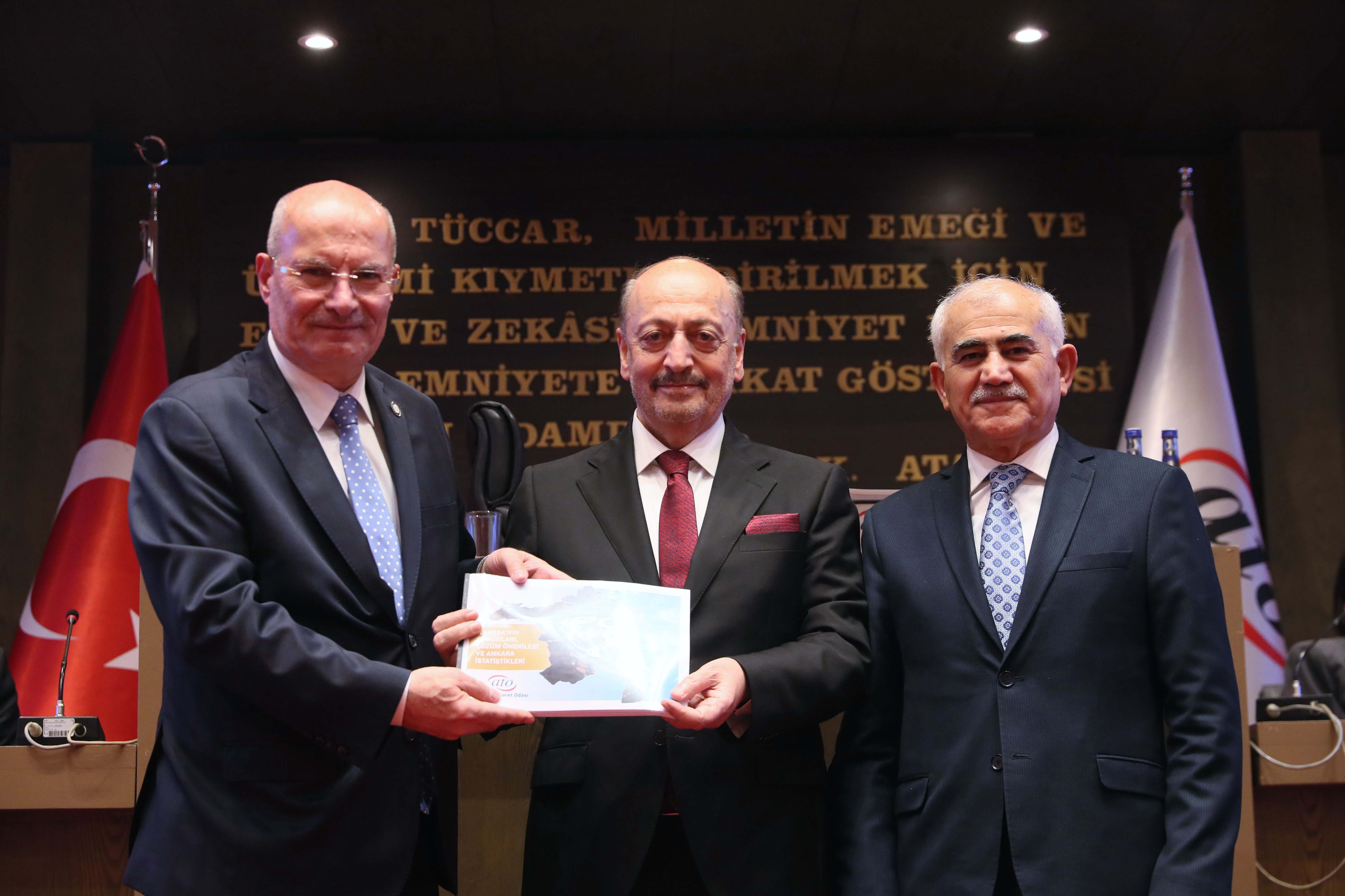 Konuşmaların ardından ATO Yönetim Kurulu Başkanı Gürsel Baran ve ATO Meclis Başkanı Mustafa Deryal Bakan Bilgin'e Ankara'ya ilişkin bir rapor sundu.