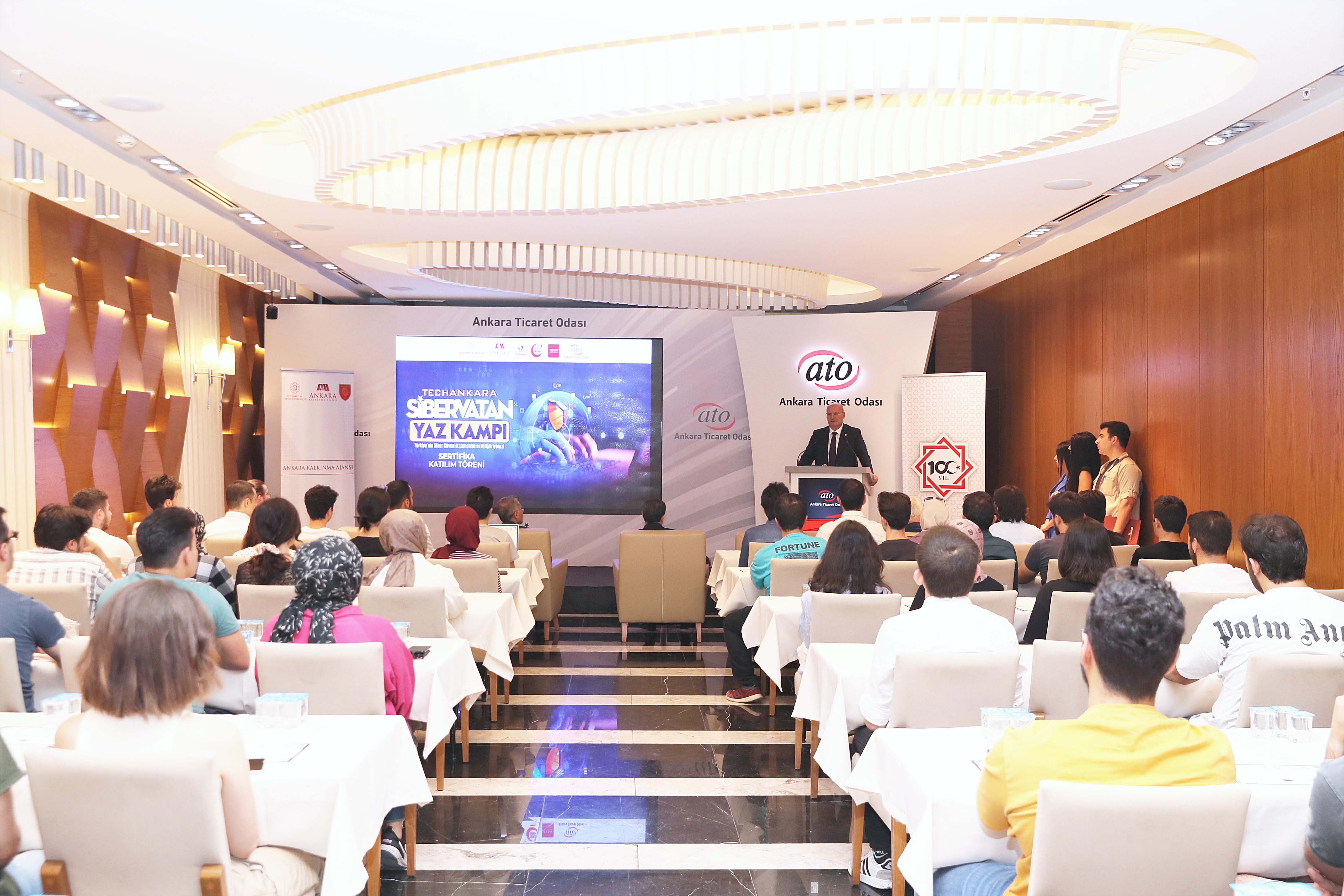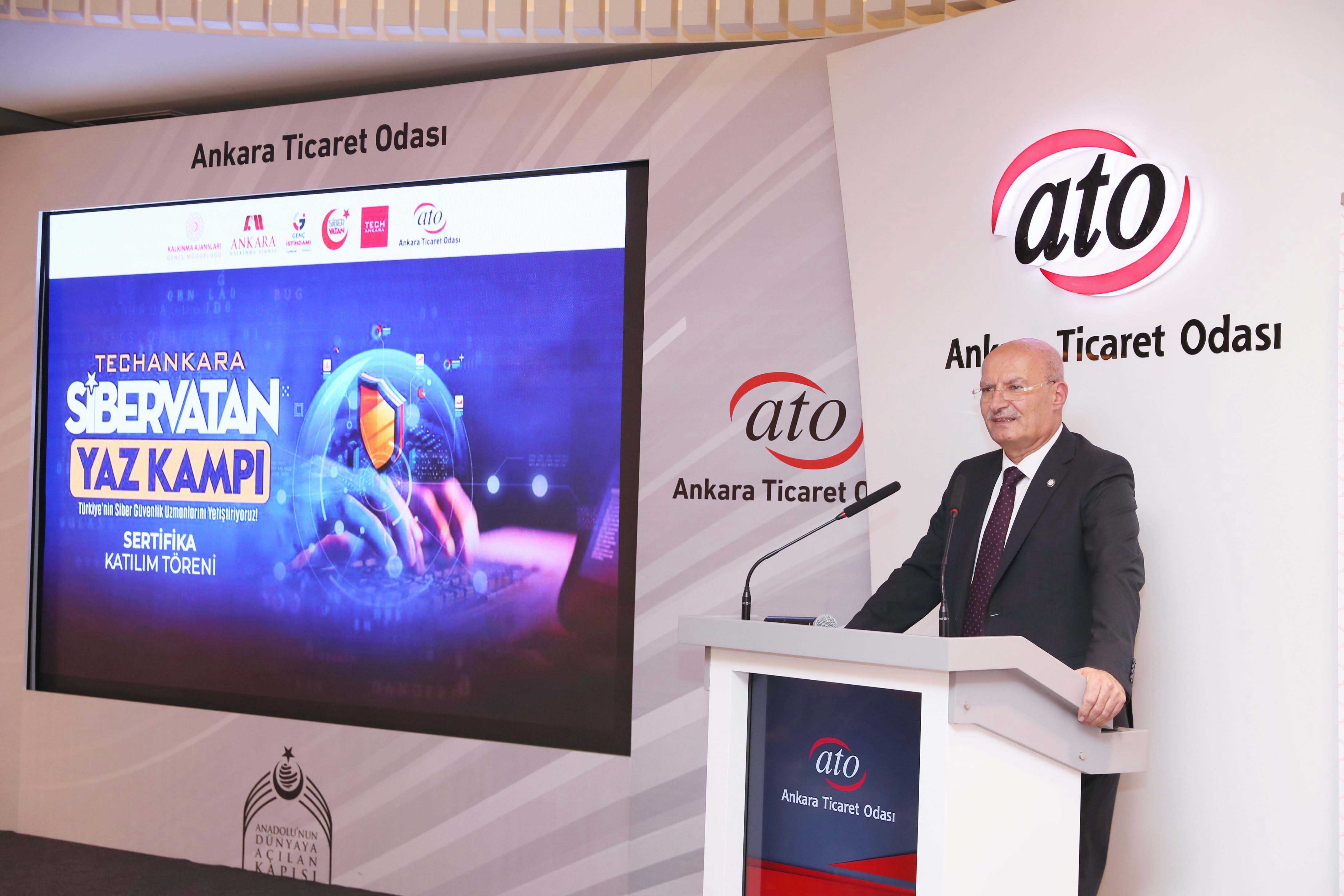 22 TEMMUZ 2023- Ankara Ticaret Odası'nın (ATO) ev sahipliğini yaptığı, Ankara Kalkınma Ajansı'nın koordinatörlüğünde gerçekleşen "TechAnkara SiberVatan Yaz Kampı Eğitimi"nin sertifika töreni Ankara Valisi Vasip Şahin, ATO Yönetim Kurulu Başkanı Gürsel Baran ve Ankara Kalkınma Ajansı Genel Sekreteri Dr. Cahit Çelik'in açılış konuşmalarıyla ATO Duatepe Salonu'nda yapıldı.