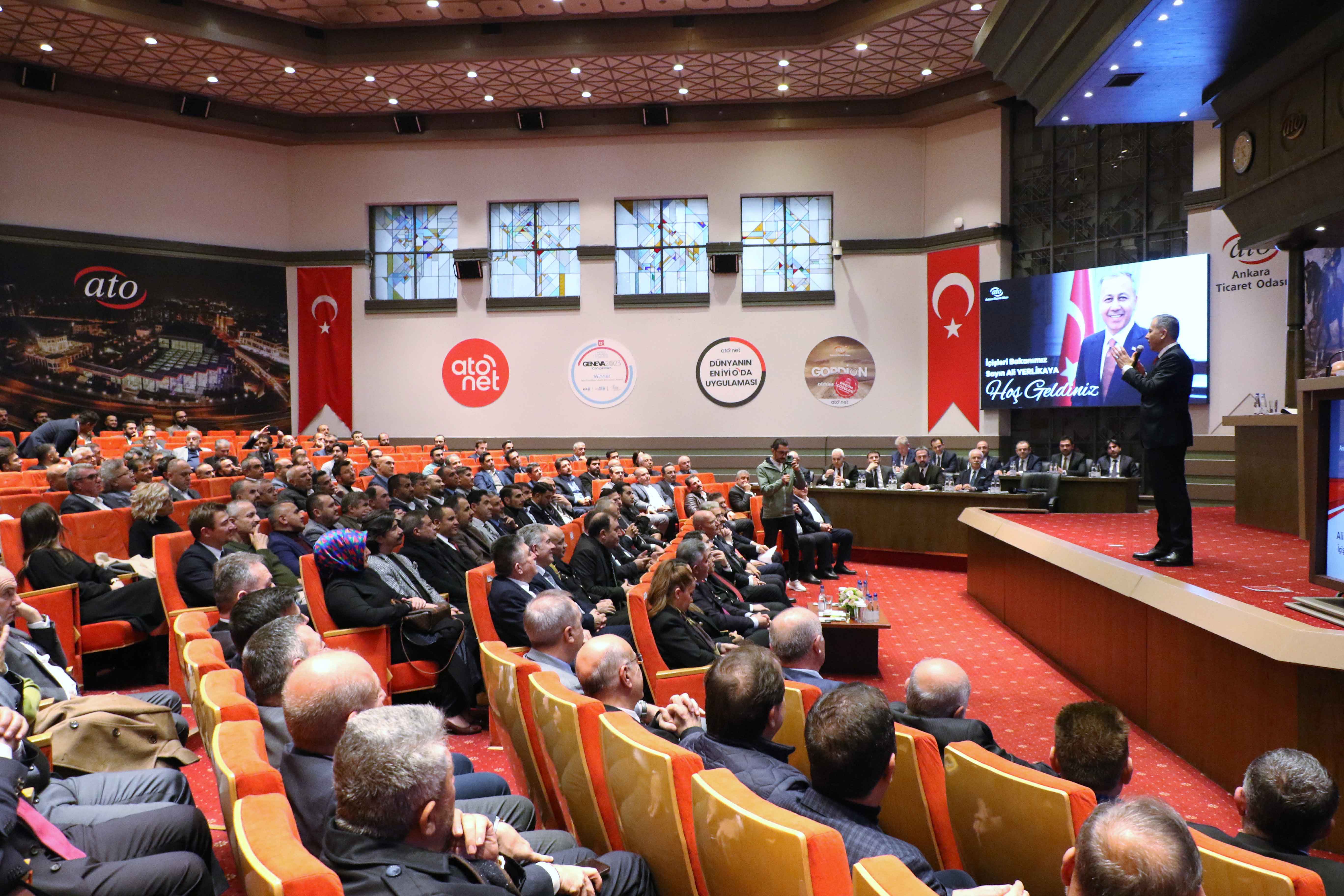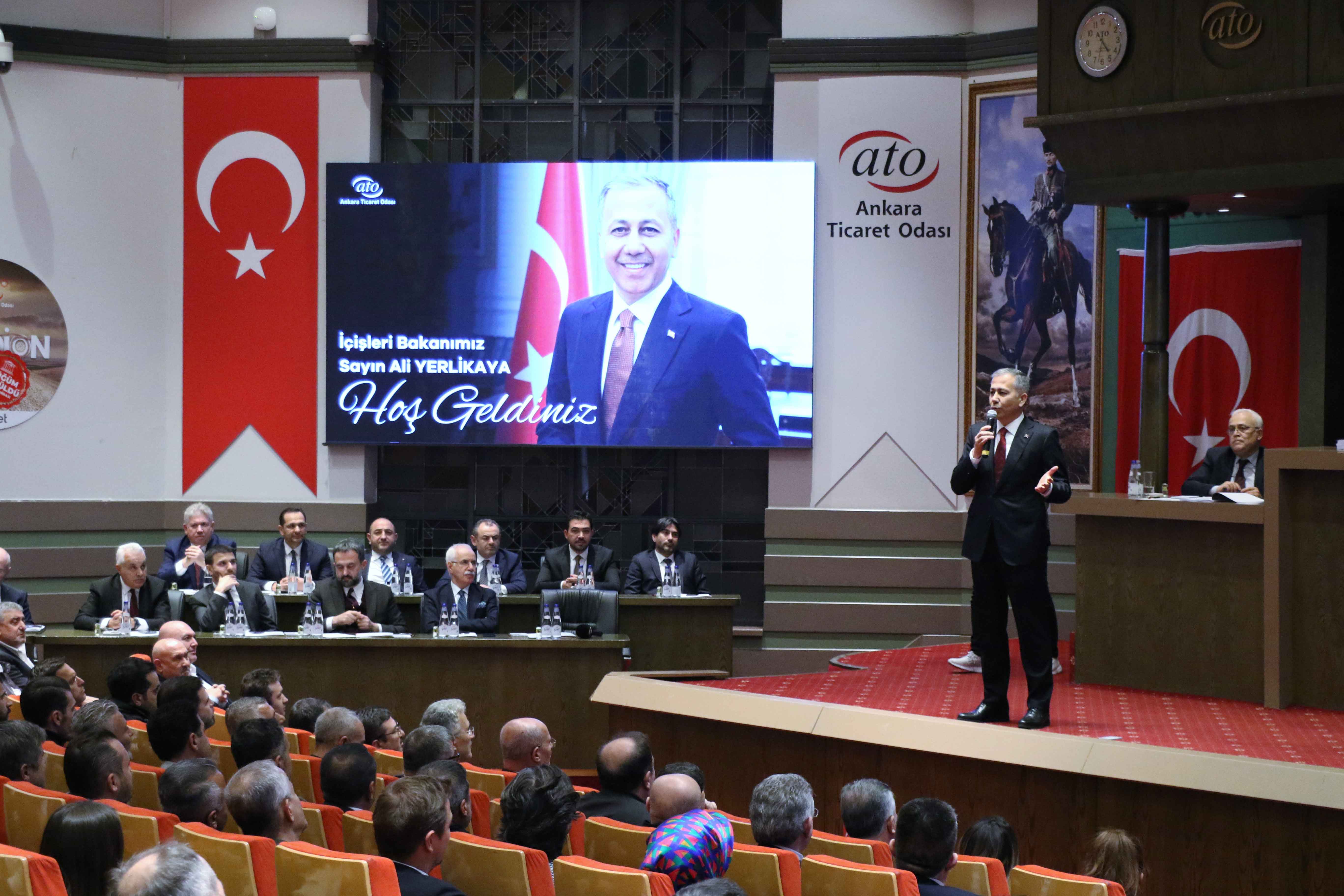 1 ARALIK 2023- Ankara Ticaret Odası'nın (ATO) 29. Dönem Kasım Ayı Olağan Müşterek Meclis Toplantısı, İçişleri Bakanı Ali Yerlikaya'nın katılımıyla yapıldı. Yerlikaya, ATO Meclisi'ne hitaben yaptığı konuşmada İçişleri Bakanlığı'nın ülkede huzur ve güvenliği sağlamaya yönelik yürüttükleri çalışmalar hakkında bilgi verdi. Toplantıda konuşan ATO Başkanı Baran, ticaret, sanayi, turizm hangi konu olursa olsun gelişmek için huzur ve güvenlik zeminine ihtiyaç olduğunu belirterek, "Ülkemizde güven ve huzurun eminliği içinde işimizi yapıyor, ekonomimize katkı sağlamak üzere çalışıyoruz" dedi.