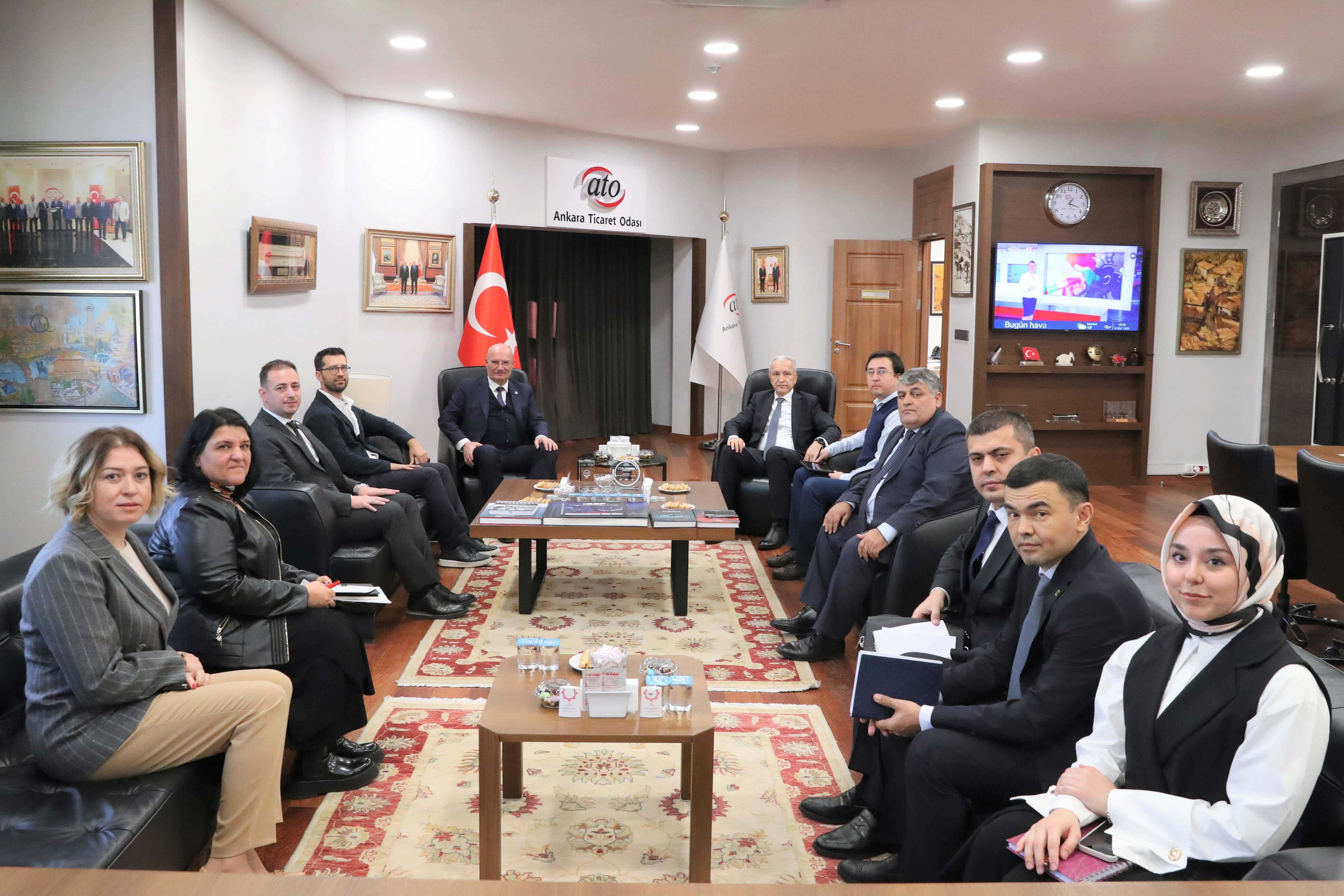 Agrobank Baş Analitik Başkanı Abdurrahman Sherov, İcra Kurulu Danışmanı Ercan Bulut, Strateji Geliştirme Daire Başkanı Mansur Djalilov ile Endüstriyel Tarım Sektörünü Maliyeleştirme Daire Başkan Yardımcısı Jamshid Sharapov, ATO Başkanı Gürsel Baran'ı makamında ziyaret etti. Ziyarette, Özbekistan ekonomisi hakkında bilgi veren Sherov, hızlı nüfus artışı yaşanan ülkede yıllık 700-800 bin gence istihdam alanı oluşturmak gerektiğini söyledi. Sherov, "Yeni işyerleri yani istihdam alanı oluşturmak için banka olarak neler yapabileceğimizi belirleyebilmek için Türkiye'de incelemelerde bulunmaya geldik" dedi.
