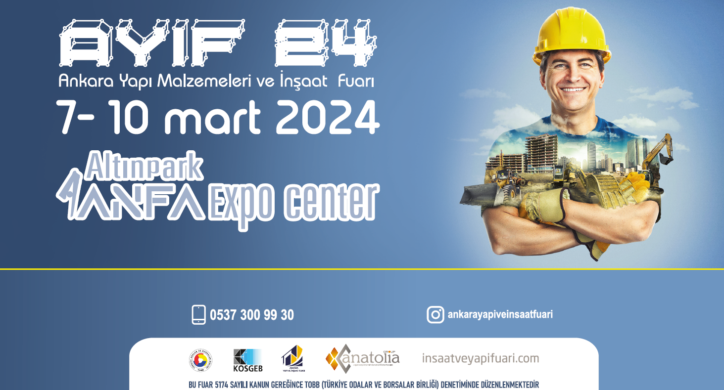 07- 10 Mart 2024 tarihleri arasında, yapı sektöründe son teknolojiyi ve en güncel trendleri tanıtmak, işbirliği ve paylaşımı teşvik etmek amacıyla Altınpark ANFA Expo Center' da Ankara Yapı Malzemeleri ve İnşaat Fuarı (AYIF 24) gerçekleşeceği hususunu bilgilerinize sunarız.
