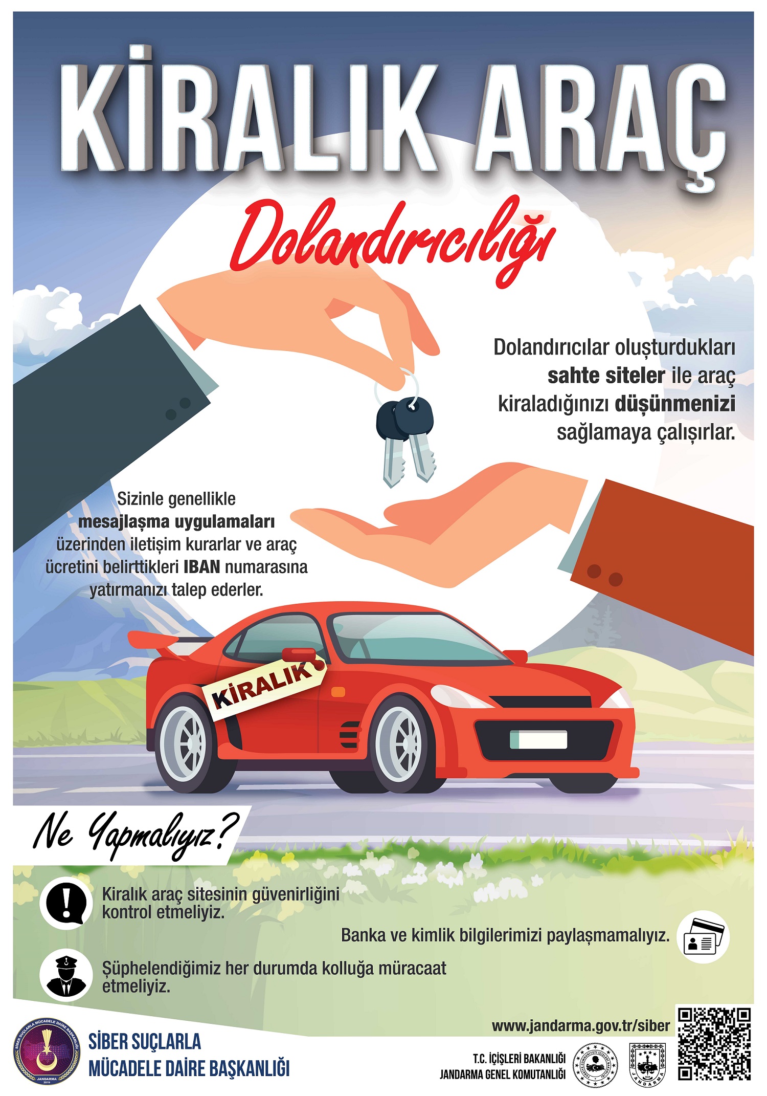 T.C. İçişleri Bakanlığı Jandarma Genel Komutanlığı Siber Suçlarla Mücadele Daire Başkanlığı'nın "Kiralık Araç Dolandırıcılığı" ile ilgili duyuru görseli aşağıda yer almaktadır.