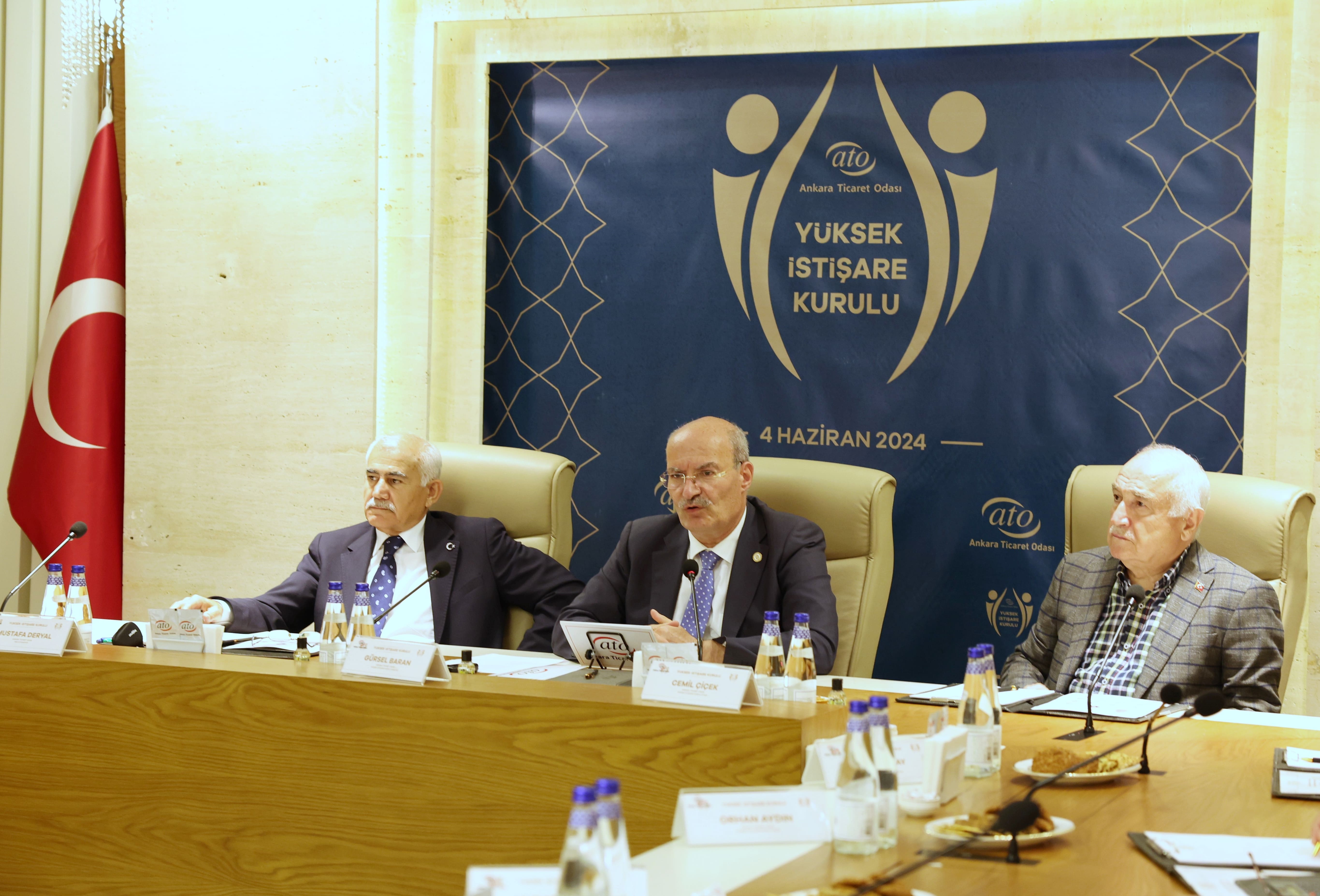05 HAZİRAN 2024- Ankara Ticaret Odası (ATO) bünyesinde Başkent'in ekonomik, ticari ve sanayi açılardan kalkınmasına katkı sağlayacak görüşler oluşturarak, mevcut çalışmaları izlemek ve değerlendirmek üzere oluşturulan "Yüksek İstişare Kurulu (YİK)", ATO Yönetim Kurulu Başkanı Gürsel Baran başkanlığında toplandı. Ankara'nın gelişim sürecine katkı sağlayacak isimlerden oluşan kurul üyeleri, "2. Yüzyılda Ankara Vizyonu" gündemiyle gerçekleşen toplantıda görüş ve önerilerini dile getirdi. ATO Başkanı Baran toplantının açılışında yaptığı konuşmada, Milli Mücadele'nin merkezi olmuş Ankara'nın, asırlık Cumhuriyet tecrübesi edinmiş bir Başkent olduğunu belirterek, "Asırlık tecrübeyi arkamıza alarak, yeni yüzyılda daha güçlü Ankara için çalışıyoruz" dedi.