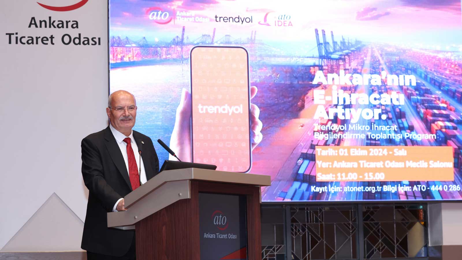 Ankara Ticaret Odası, üyelerinin ihracatını geliştirmeye ve Başkent'in ihracat ve e-ihracat gelirlerini artırmaya yönelik çalışmalarına bir yenisini daha ekledi. Ankara Ticaret Odası'nın, ATO İDEA koordinatörlüğünde, Türkiye'nin önde gelen e-ticaret ve e-ihracat platformlarından Trendyol iş birliğiyle gerçekleştirdiği, "Trendyol Mikro İhracat Bilgilendirme Toplantısı" ATO Meclis Salonu'nda yapıldı. Toplantının açılış konuşmalarını Ankara Ticaret Odası Yönetim Kurulu Başkanı Gürsel Baran ile Ticaret Bakanlığı İhracat Genel Müdür Yardımcısı Bülent Tuncer, Trendyol Satış ve İş Geliştirme Müdürü Özkan Çokaygil ve ATO İDEA Genel Müdürü Gaye Yardımcı yaptı.