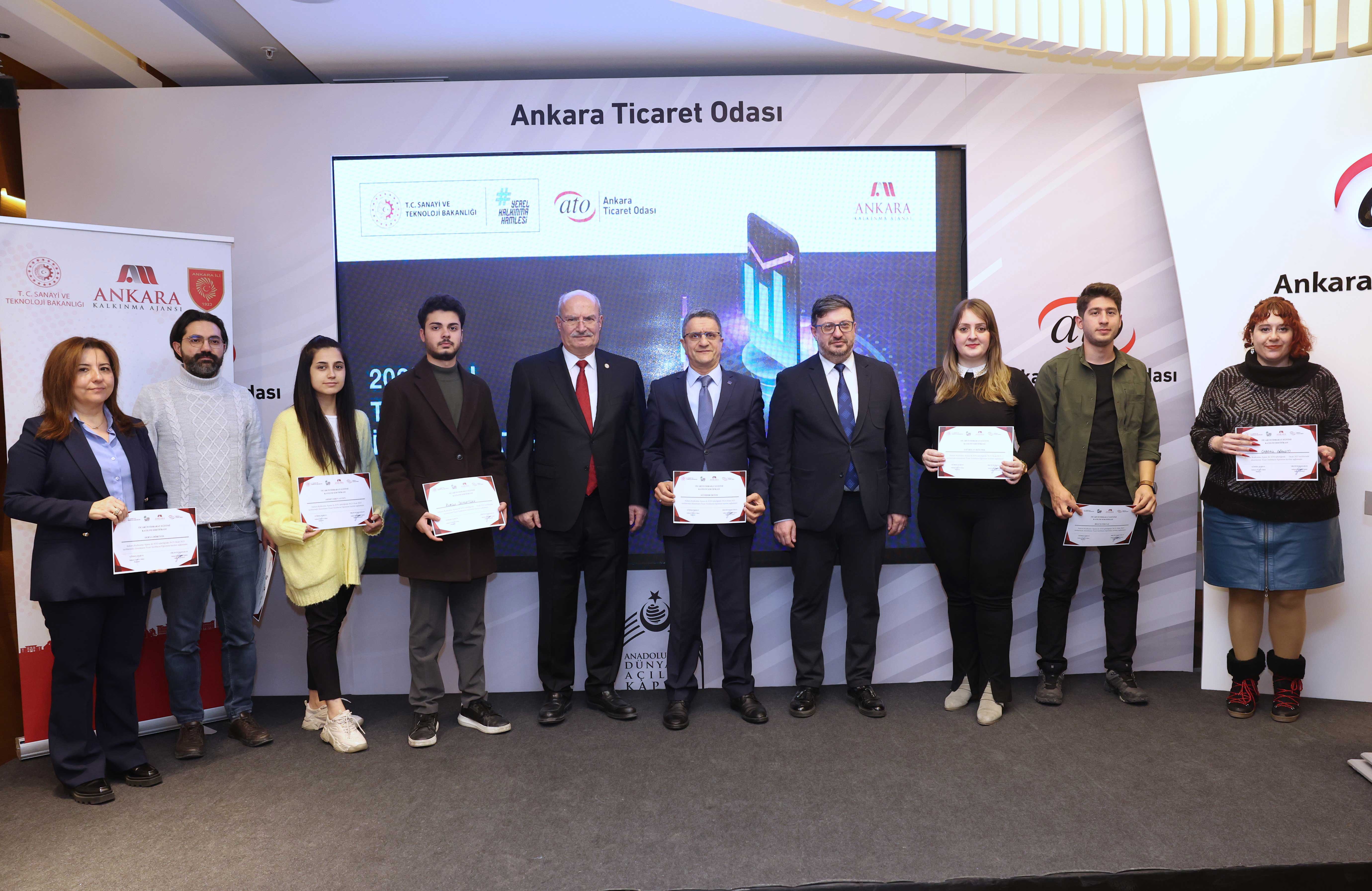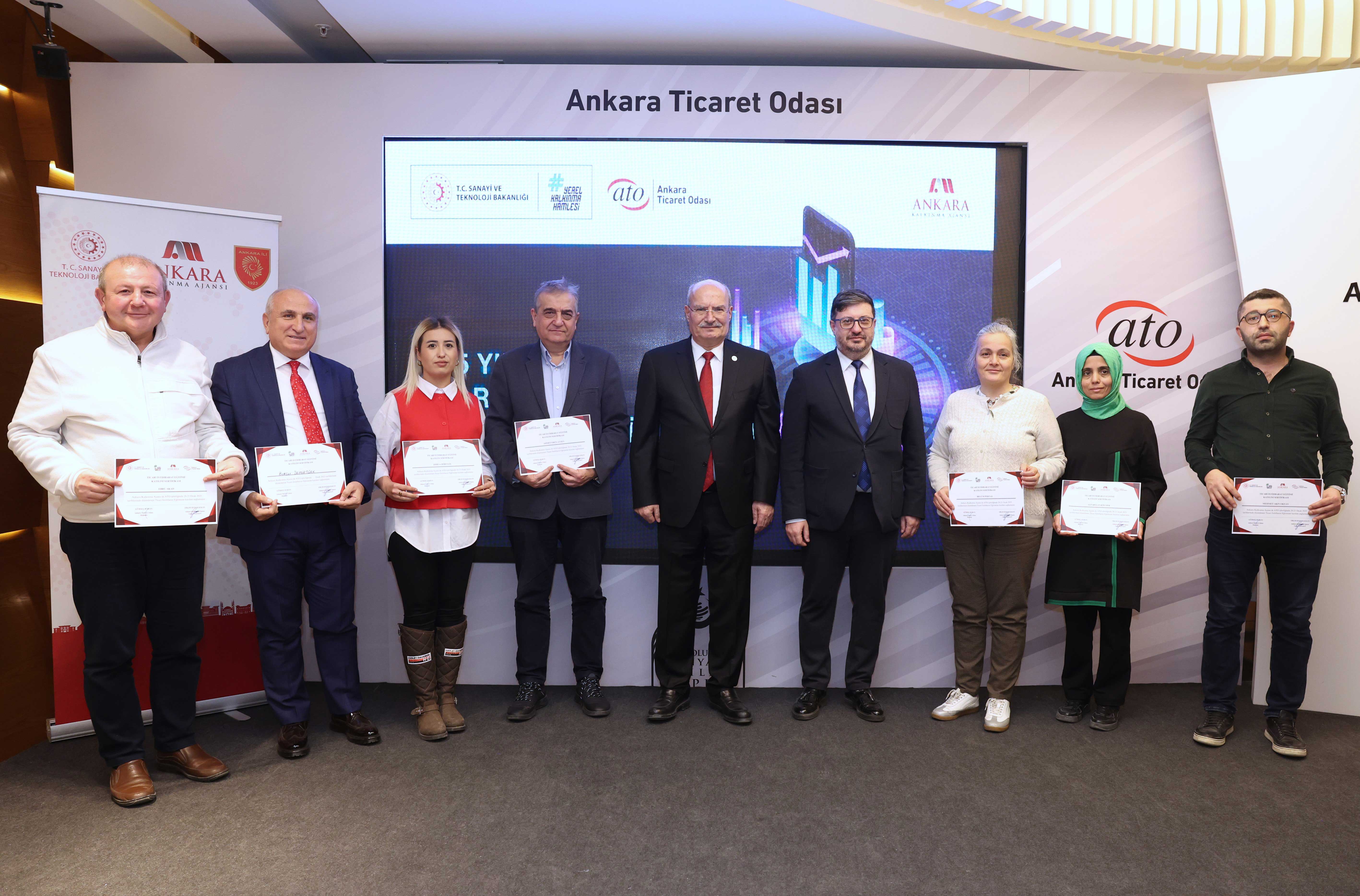 "Dış Ticarette İstihbaratın Yeri ve Önemi", "İstihbarata İhtiyaç Duyulan Alanlar", "Yurtiçi ve Yurtdışı İstihbarat Kaynakları", "Hedef Pazarların Tespiti" başlıklarında iki gün boyunca eğitim verilen "Ticari İstihbarat Eğitim" programını başarıyla tamamlayan mikro ve KOBİ niteliğindeki ATO üyesi firma temsilcilerine sertifikaları ATO Yönetim Kurulu Başkanı Gürsel Baran ve Ankara Kalkınma Ajansı Genel Sekreteri Dr. Duhan Kalkan tarafından verildi.