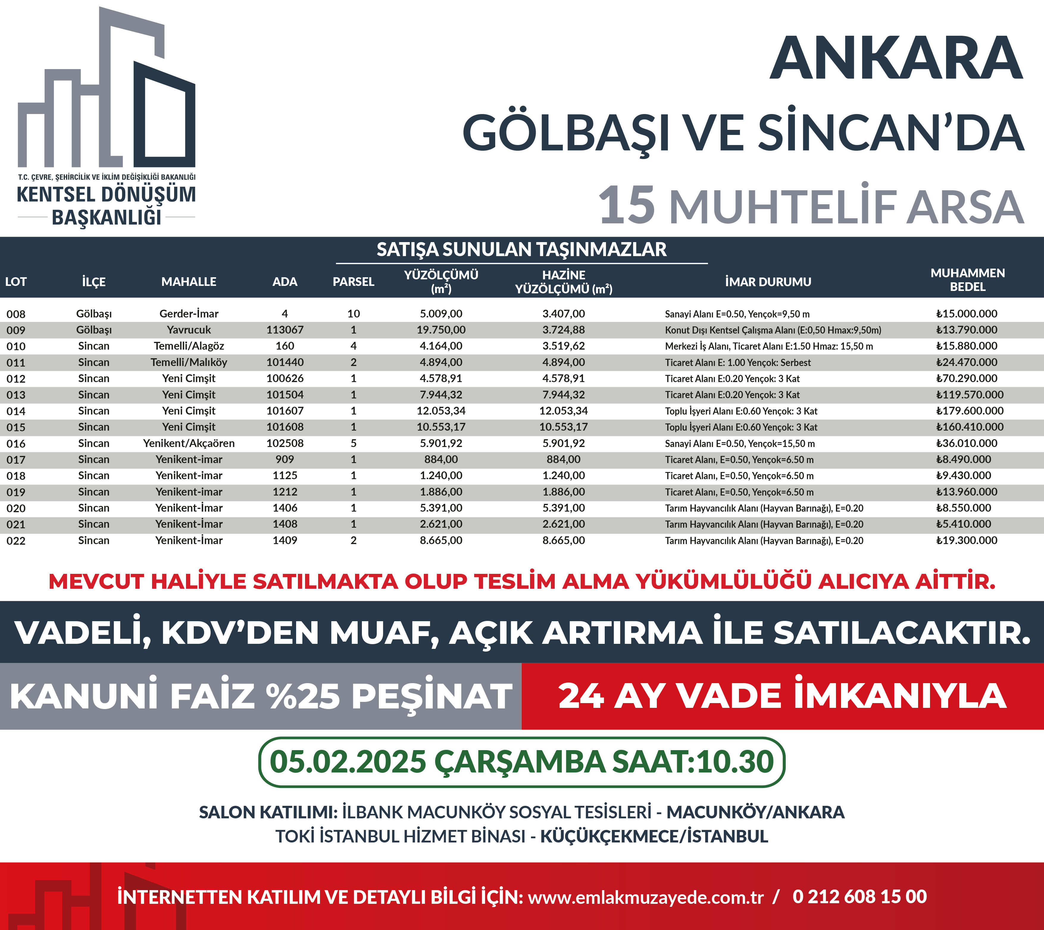 KENTSEL DÖNÜŞÜM BAŞKANLIĞI ARSA MÜZAYEDE DUYURUSU